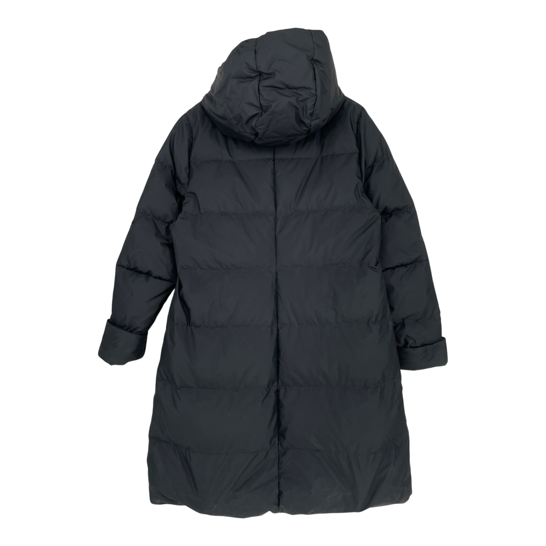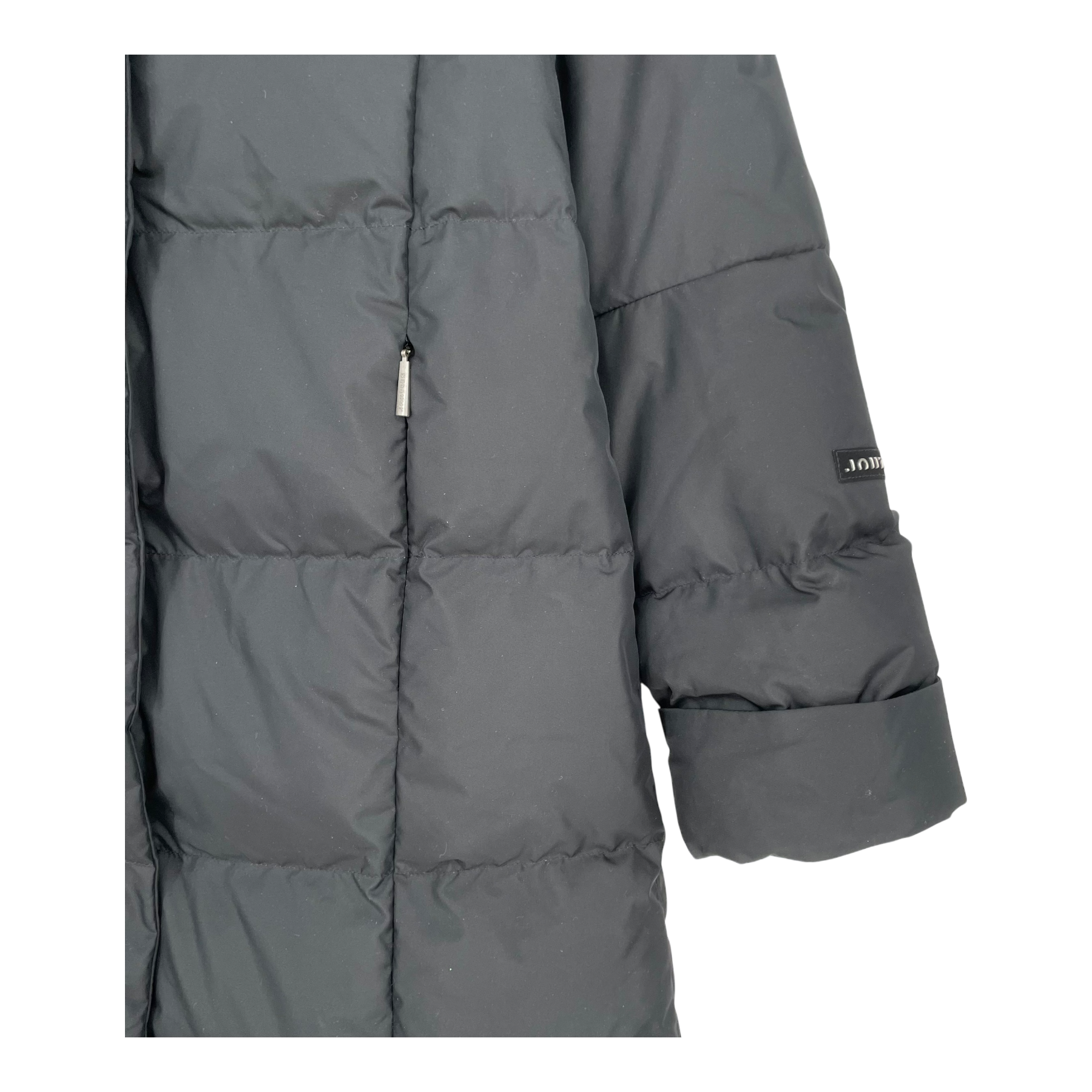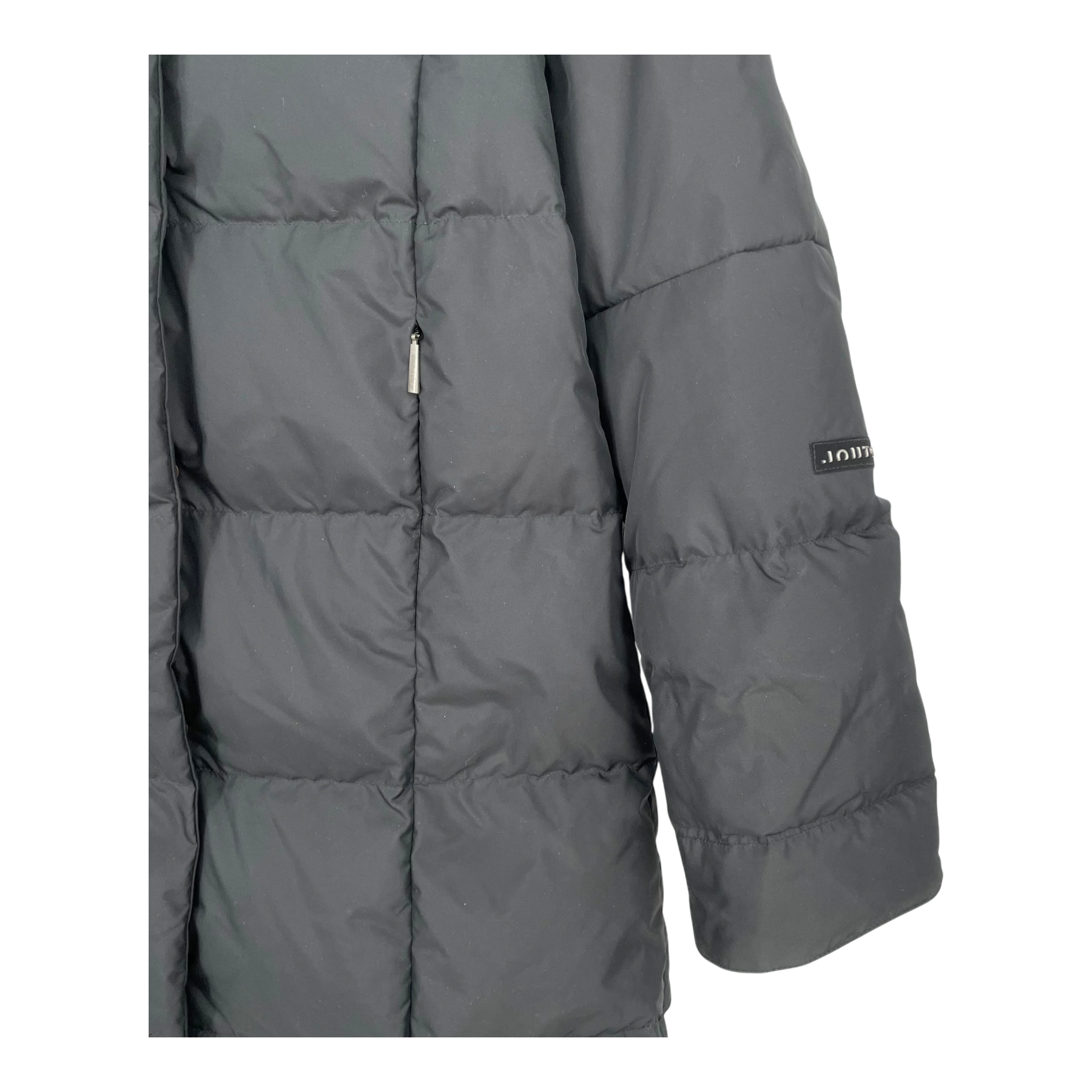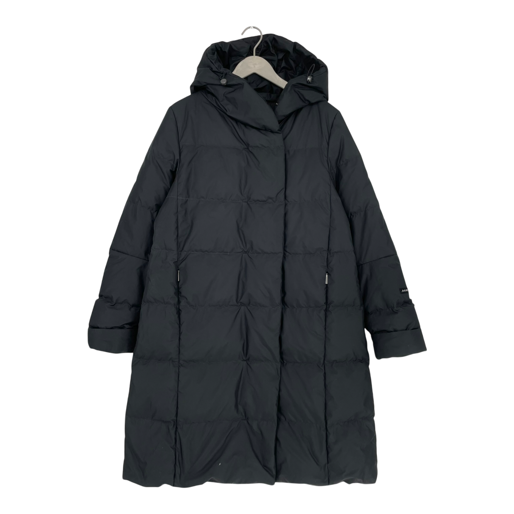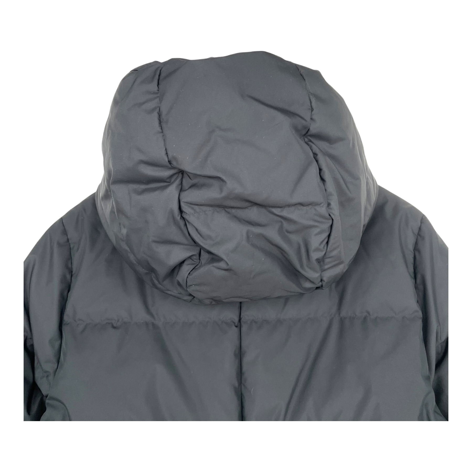 Joutsen Tuuli jacket is a down jacket perfect for the colder weathers. There a large horizontal stitching and two front pockets with zippers. The snap buttons and the double-slider fastening zipper adds comfortability and daily functionality in the front. There is a large warm hood that can be worn up or down according to weather and an adjustable elastic. The sleeves can be rolled up for a better fit.