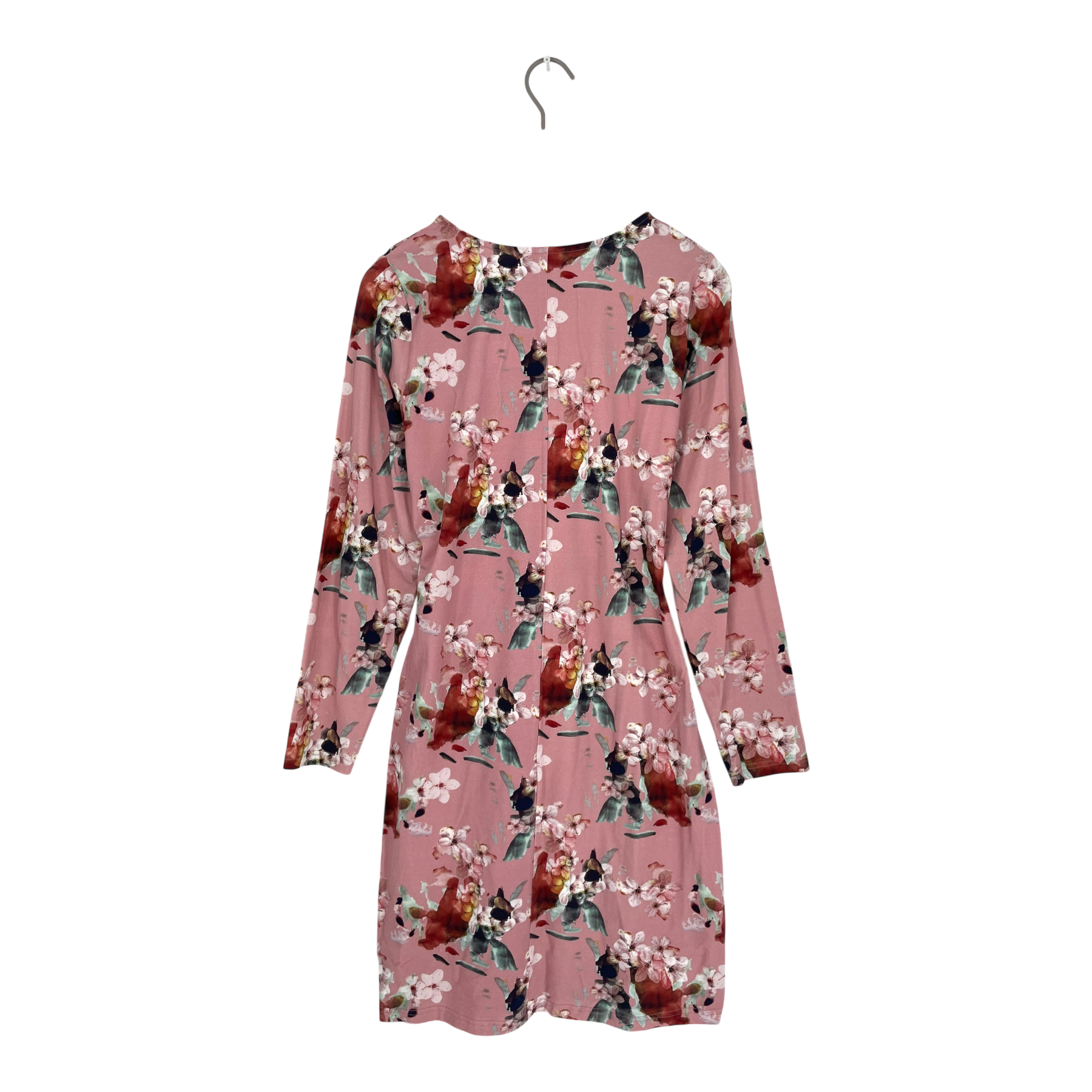 Kaiko belted dress in Blossom print has a slim figure-hugging fit. Wide ribbons at the waist can be tied at the front or back. The dress has a rounded neckline, and the hem reaches down approximately to the knees.