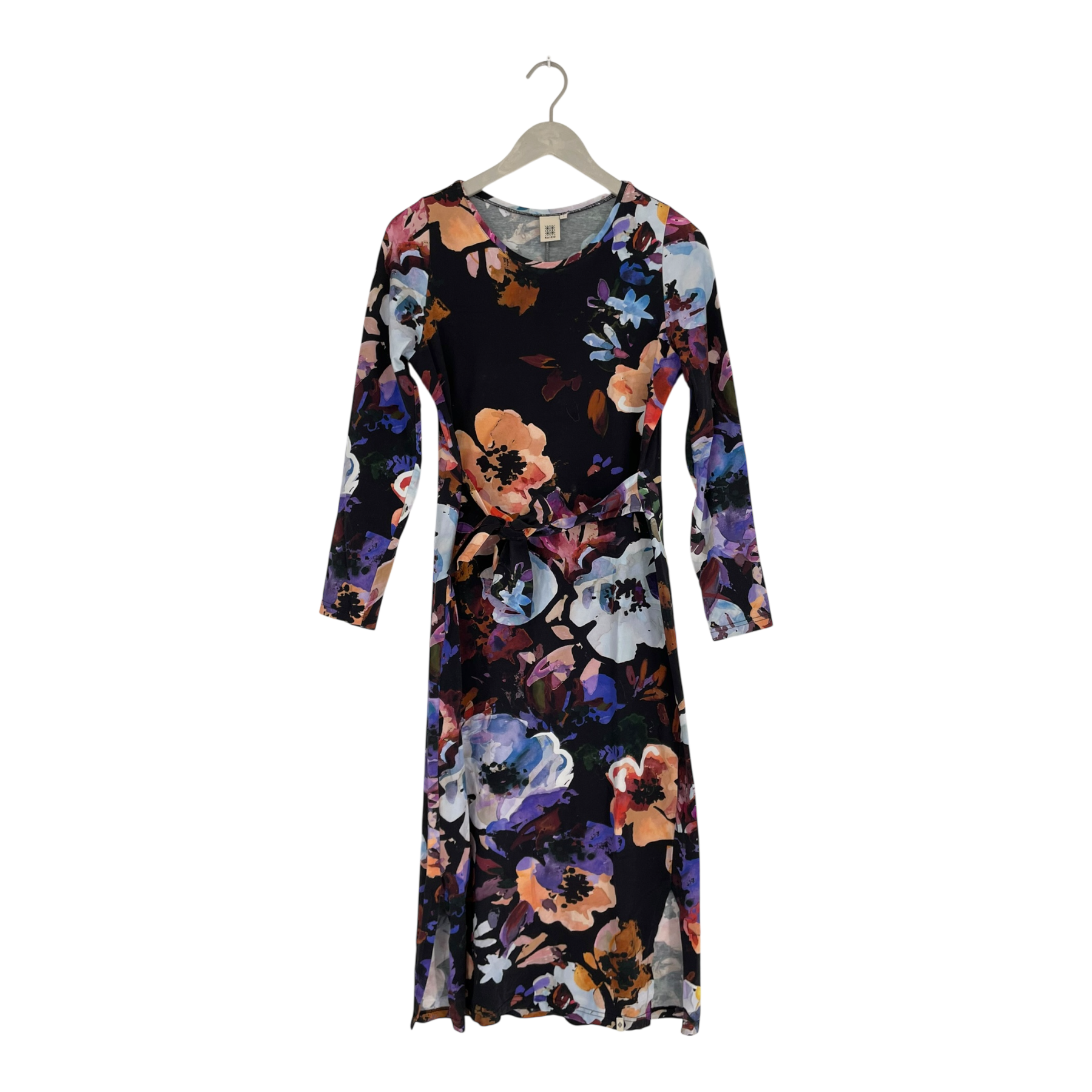 Kaiko belted dress has a slim, figure-hugging fit. Wide ribbons at the waist can be tied at the front or back. The dress has a rounded neckline, and the hem reaches down approximately to the knees.