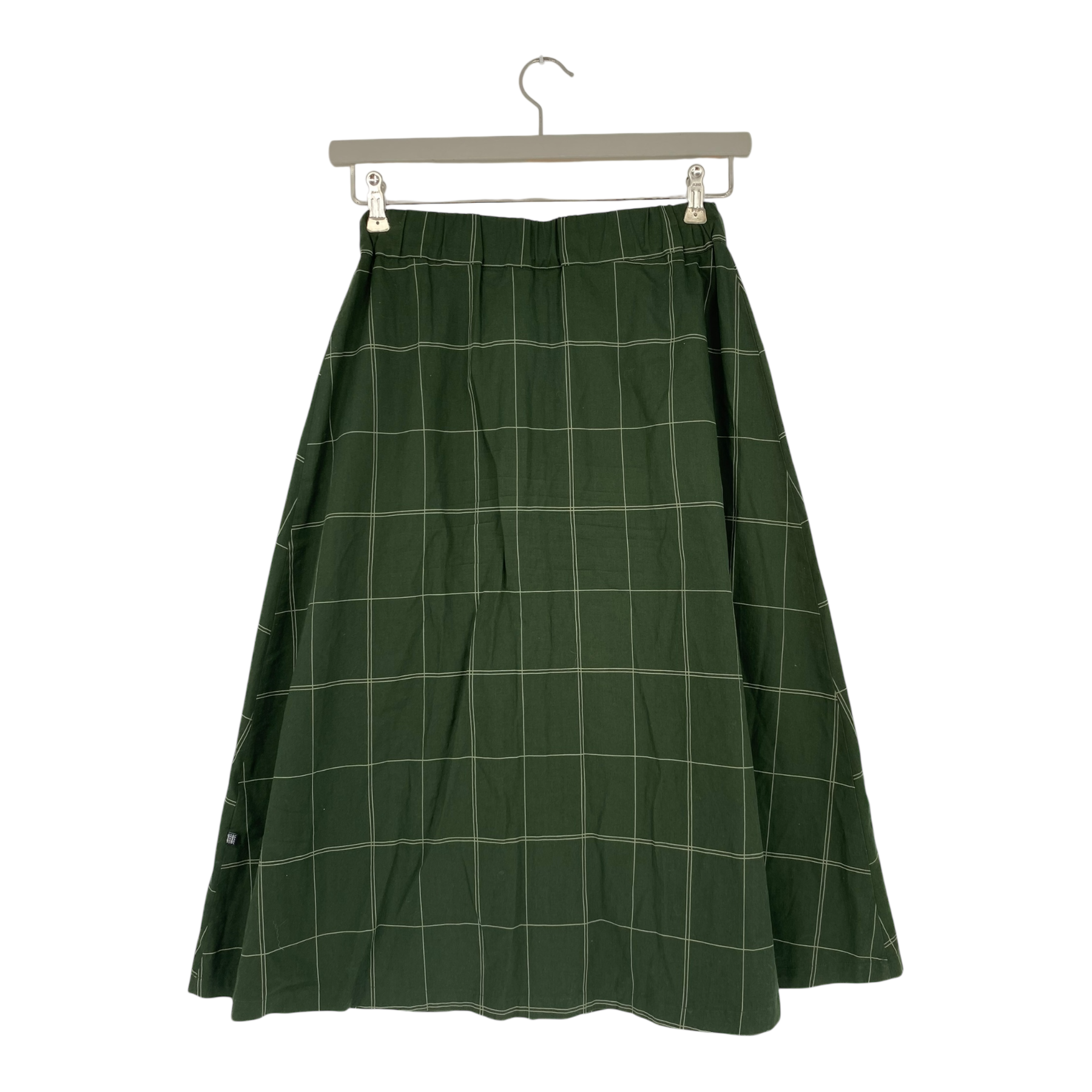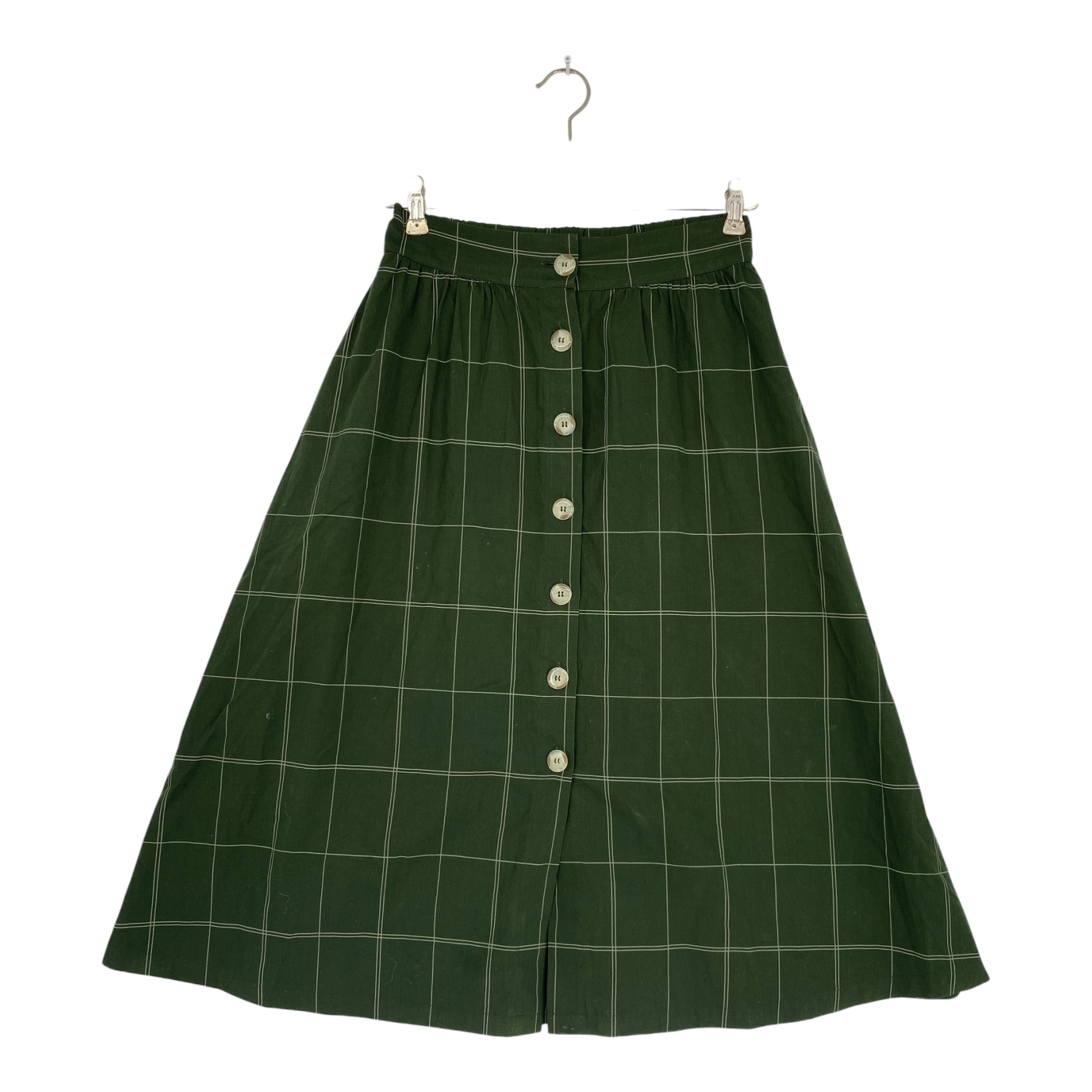 Kaiko midi-length skirt made of woven cotton with a row of buttons. The elastic waistband at the back makes the button skirt comfortable to wear.