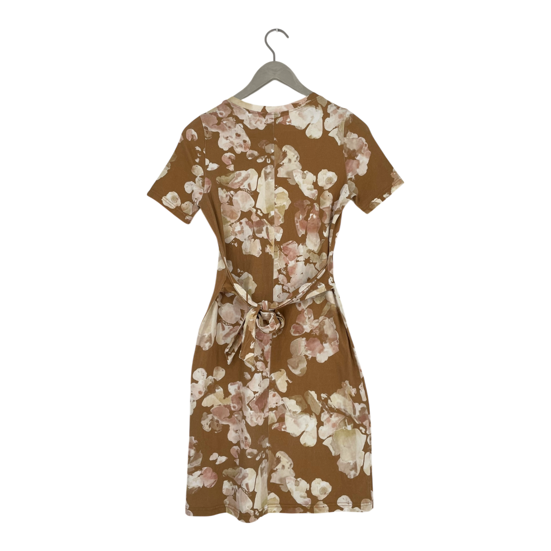 Kaiko belted dress has a slim, figure-hugging fit. Wide ribbons at the waist can be tied at the front or back. The dress has a rounded neckline, and the hem reaches down approximately to the knees.
