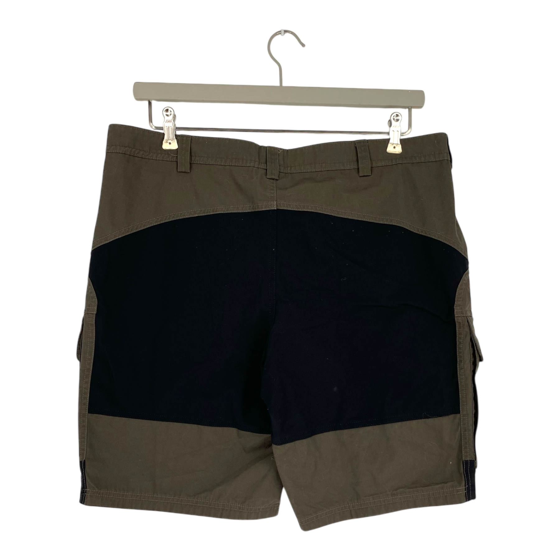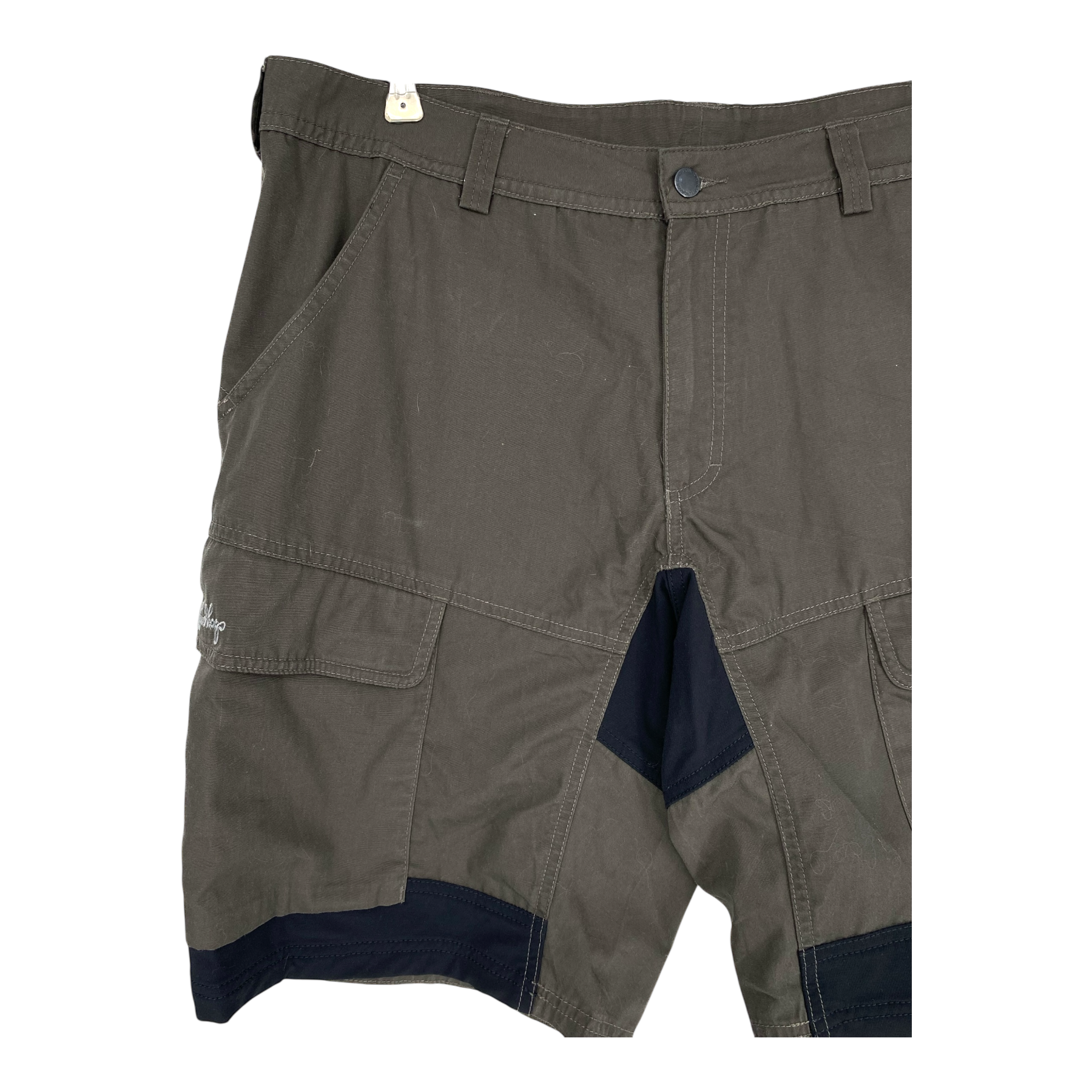 Lundhags trekking shorts in a dark green and black colorway. The shorts feature front pockets, flapped cargo pockets on the thighs, and belt loops. They have a zip fly with a button closure and stretch panels for enhanced mobility.