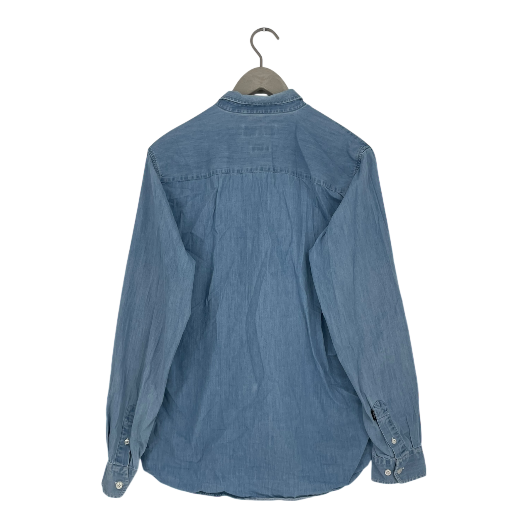 The Makia button down collar shirt is a classic slim fit shirt ideal for work and leisure. This item shows signs of wear, some of the discoloration on the fabric is part of its design, some is wear from use. The hem of the item has also lost some of its shape. The sizing runs small, so the item will most likely fit mens sizes M to L better than XL.