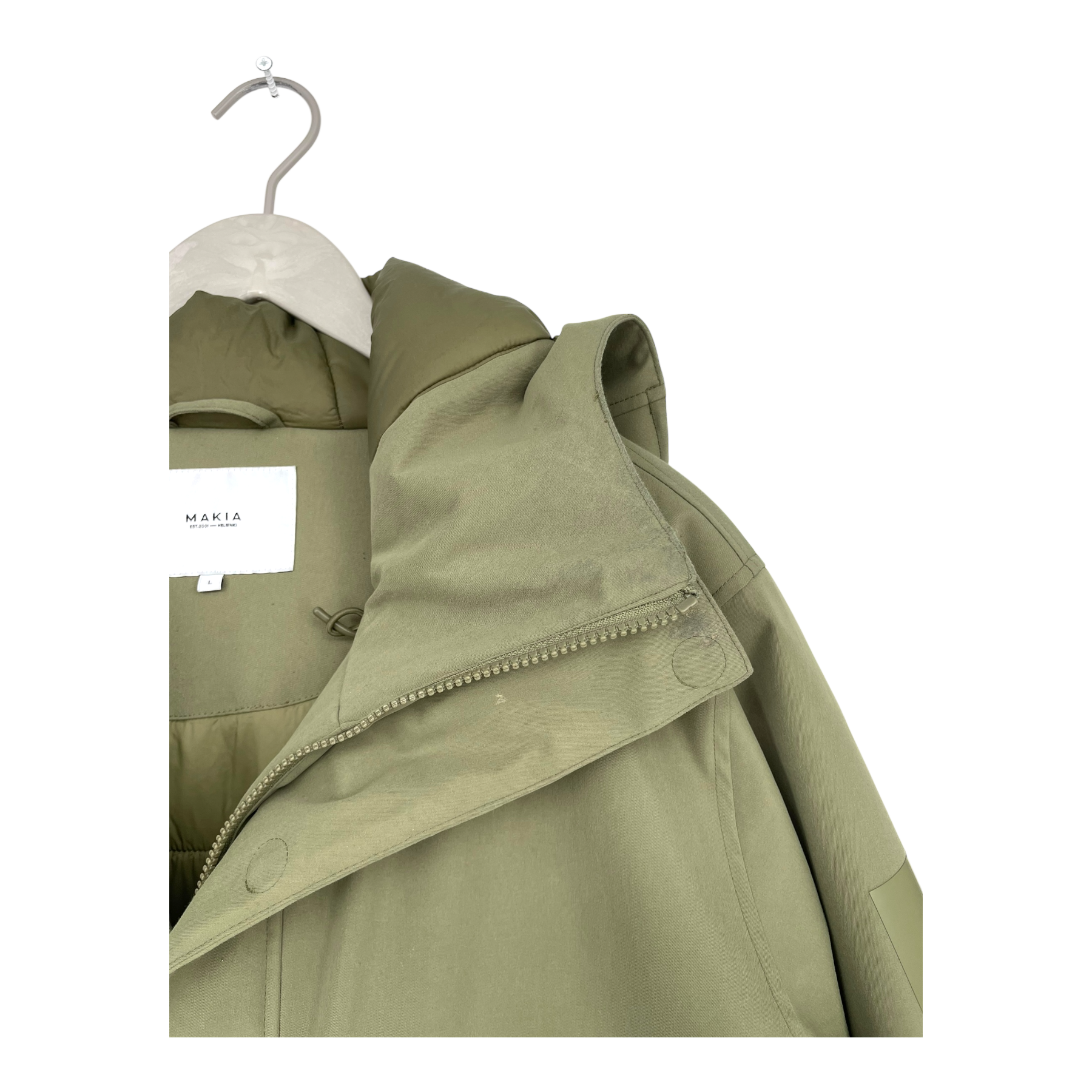 Makia men's jacket has a regular fit perfect for winter, adjustable hood and a zipper closure in the front. There is two welt pockets with zipper closure in the front and velcro adjustment on sleeve opening.