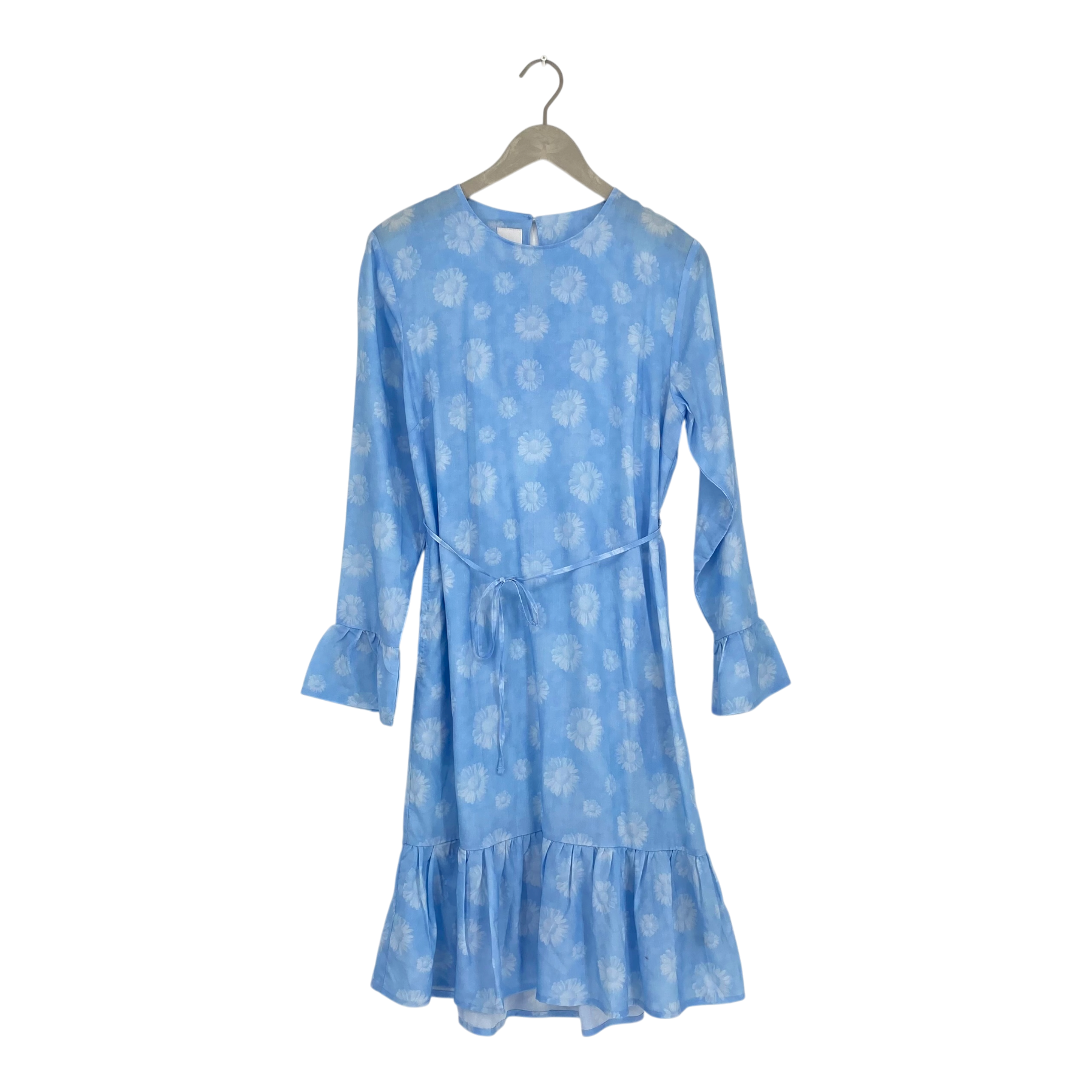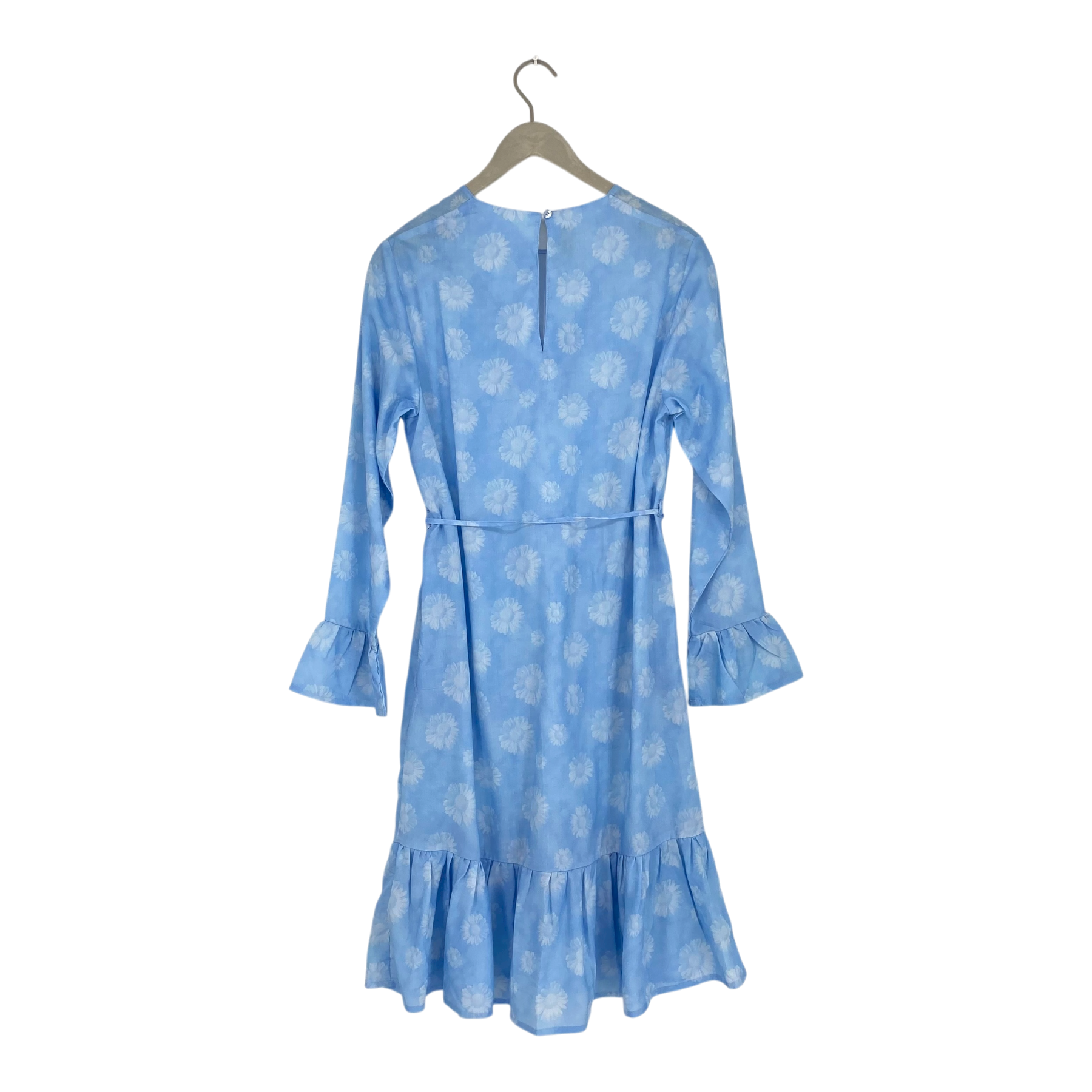 Makia woven dress with long sleeves, adjustable drawstring on the waist and keyhole closure on the back.. There is fun ruffle details on the cuffs and hemline.