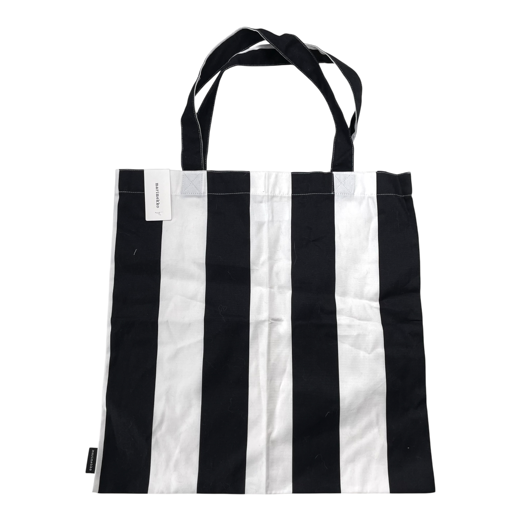 Marimekko tote shopping bag is made of lightweight cotton fabric, which features a logo pattern. The bag has two handles.