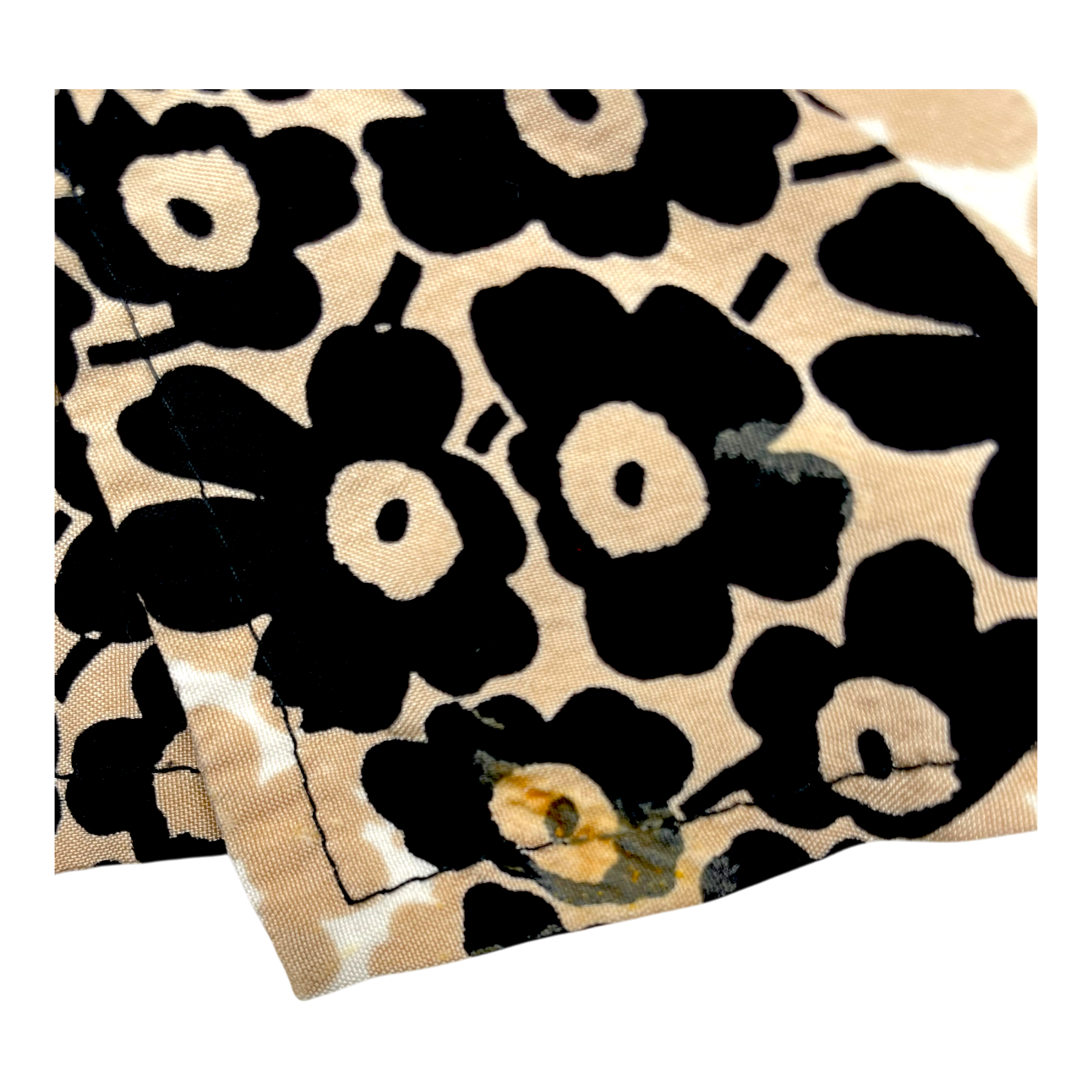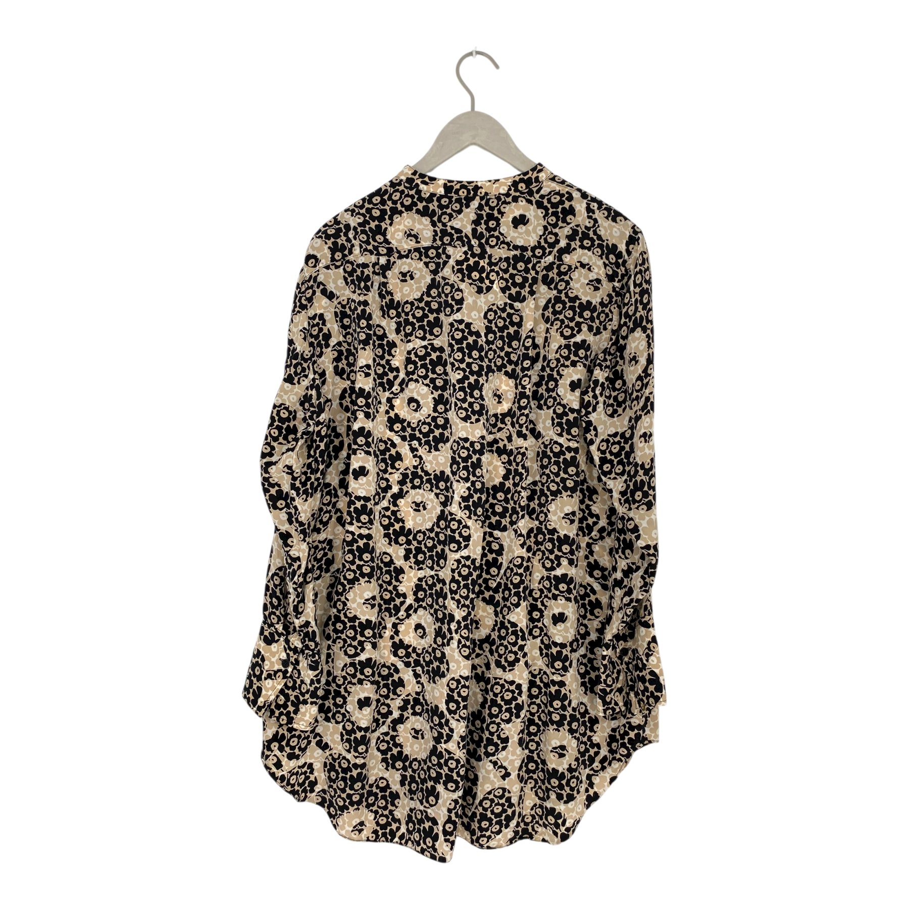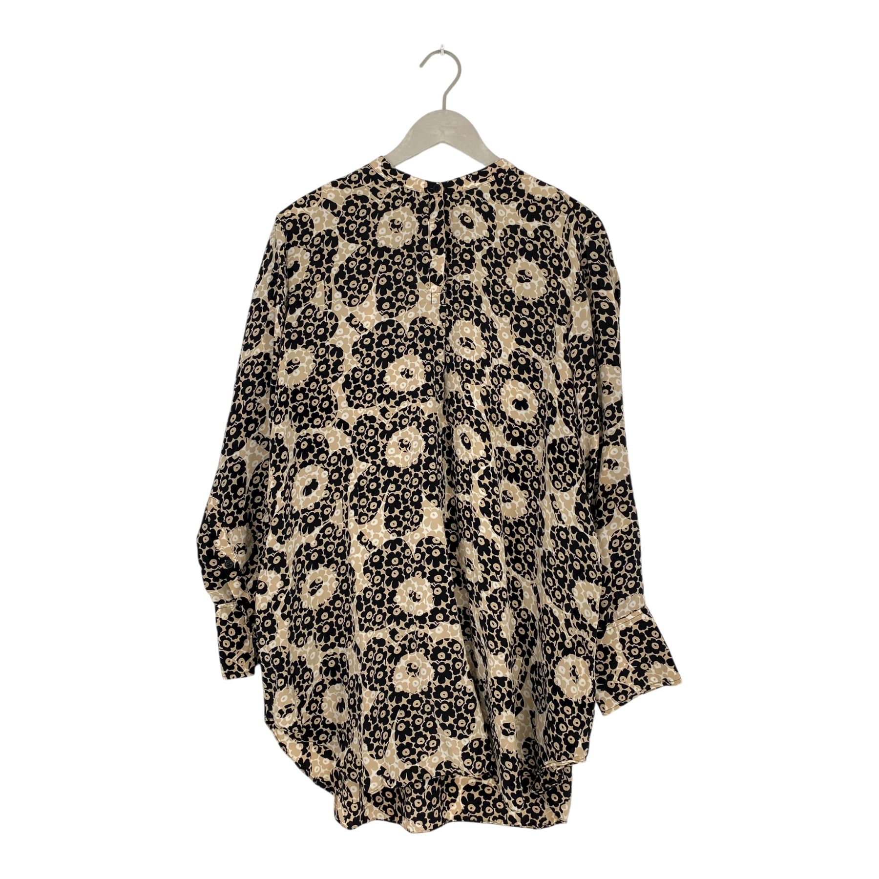Marimekko long sleeve Hurmaava blouse in the Unikot print. The Hurmaava blouse is a tunic length silky shirt with buttoned cuffs and a short button strip on the front. The item has some pulls of thread and two tomato stains on the sleeve as shown in the pictures but is otherwise in very good condition.