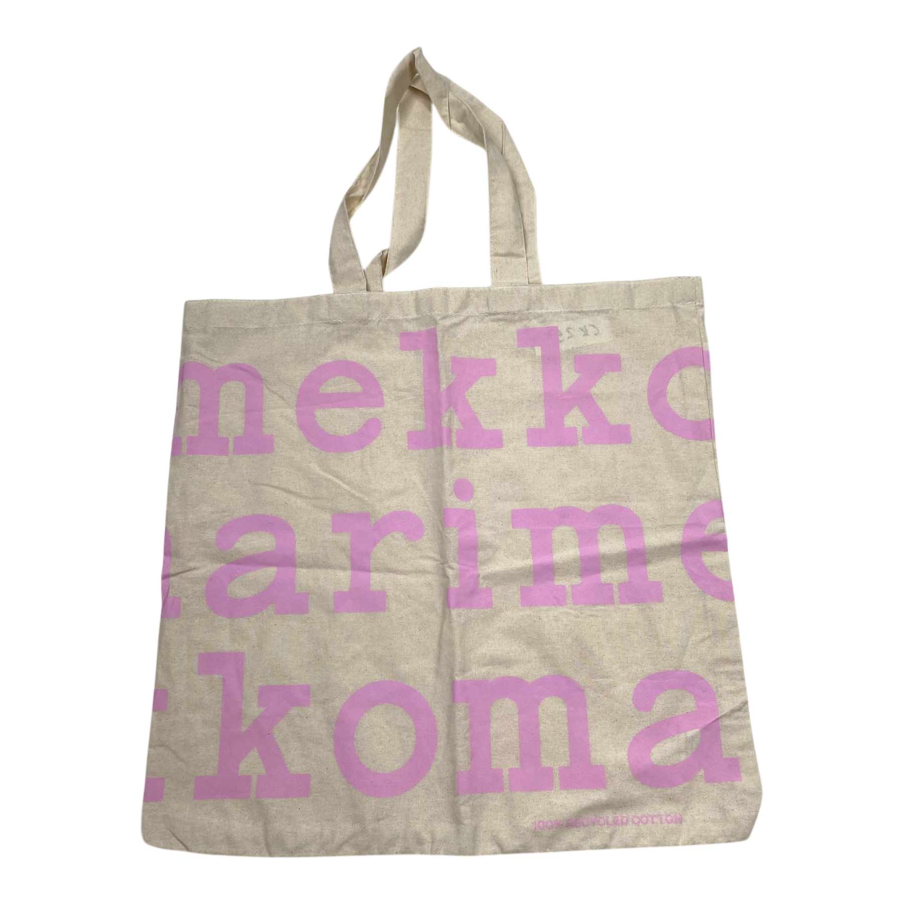 Marimekko tote shopping bag is made of lightweight cotton fabric, which features a logo pattern. The bag has two handles.