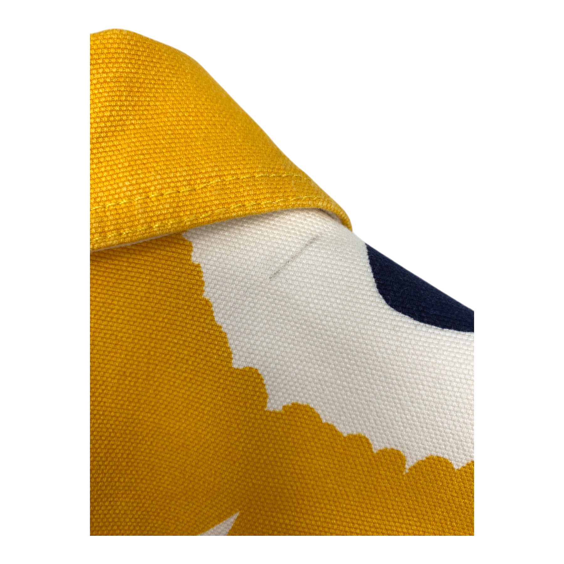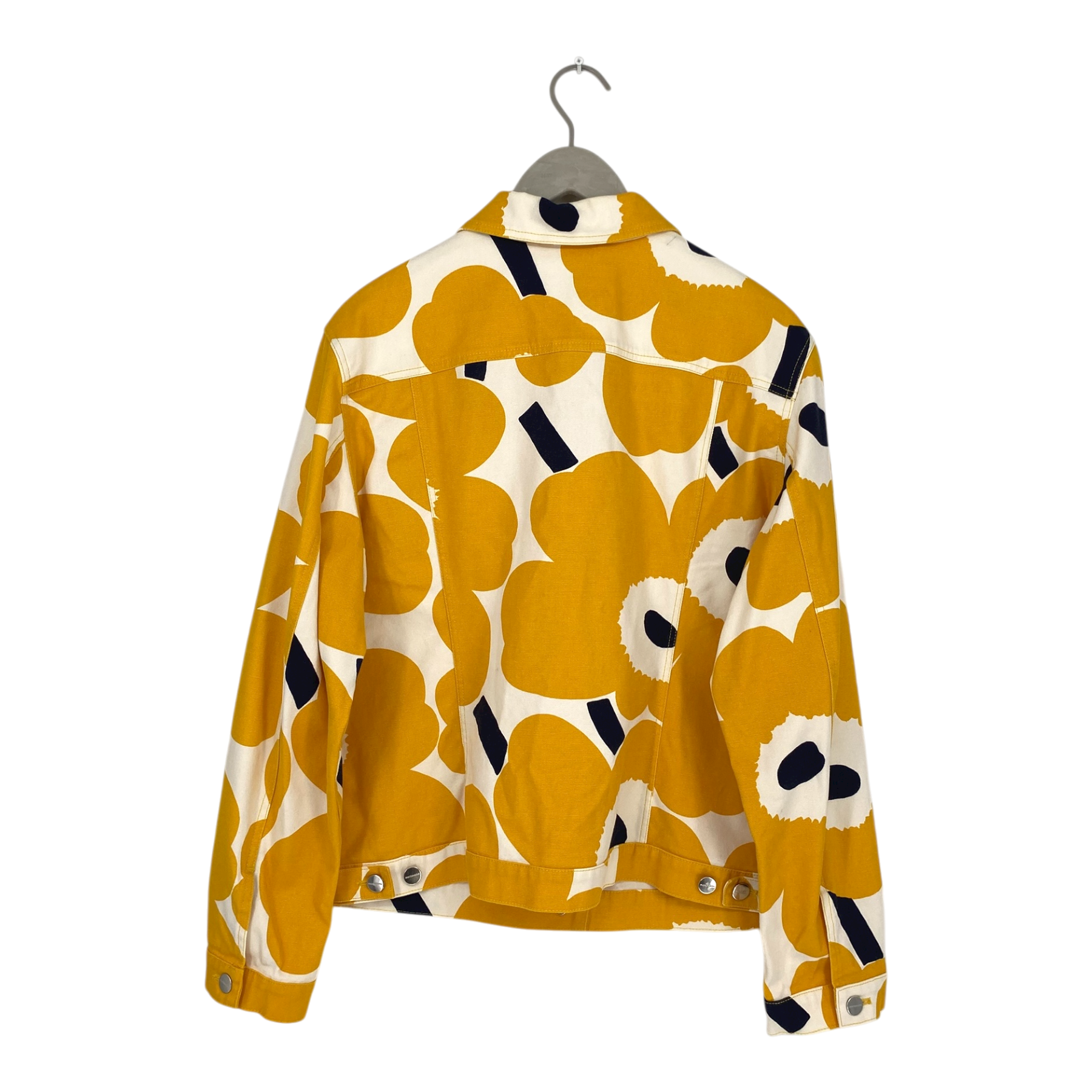 Marimekko Sarpio denim jacket in the yellow Unikko print. The Sarpio jacket has metal denim buttons with the Marimekko logo, two front pockets and a collar.
