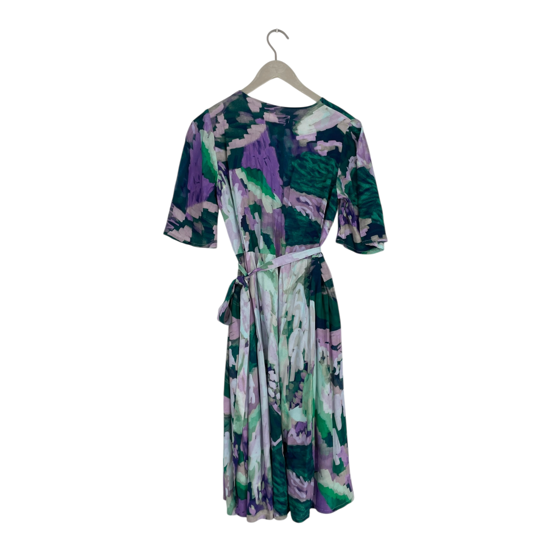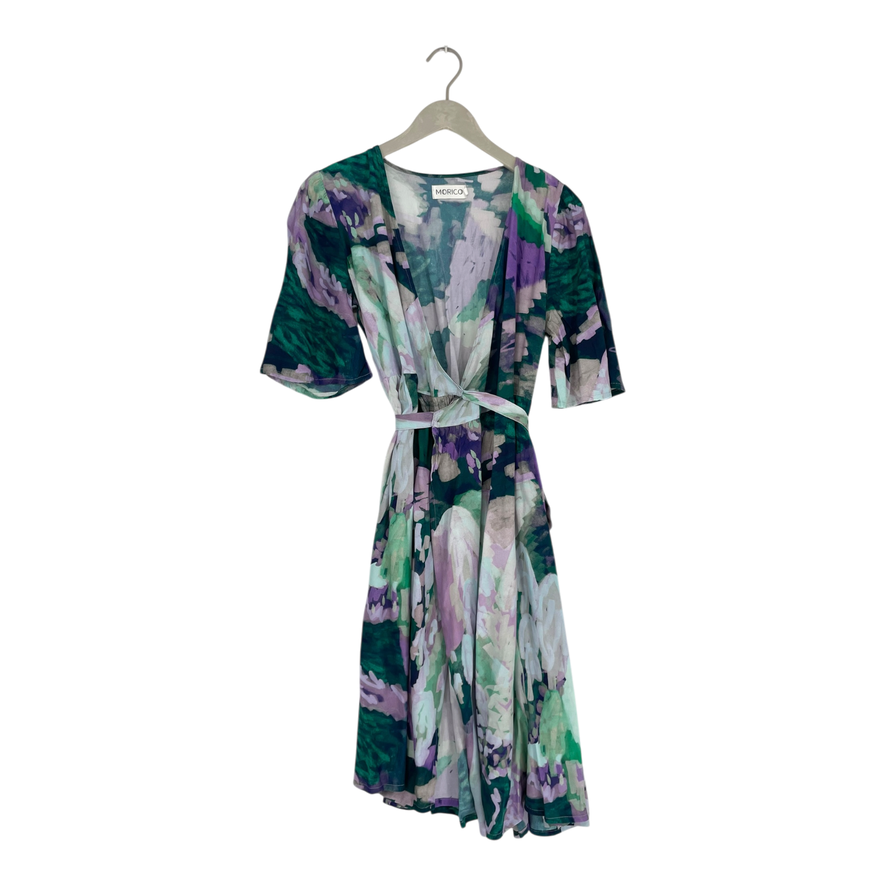 Morico wrap dress featuring a vibrant abstract floral print in purple, green, and white tones. The dress has a flattering wrap silhouette with three-quarter length sleeves and a flowing midi-length skirt. Features a self-tie waist belt for an adjustable fit.