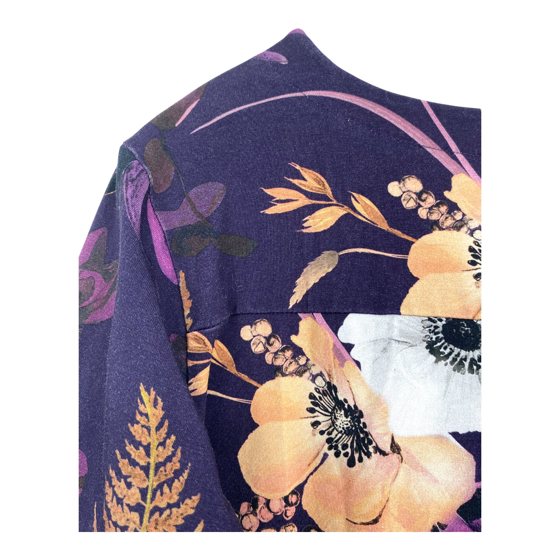 Nakoa Vera shirt in Secret lily print with 2/3 sleeves, V-neck, and slits on sides. The item is quite worn from the wash and shows signs of wear especially in the armpits.