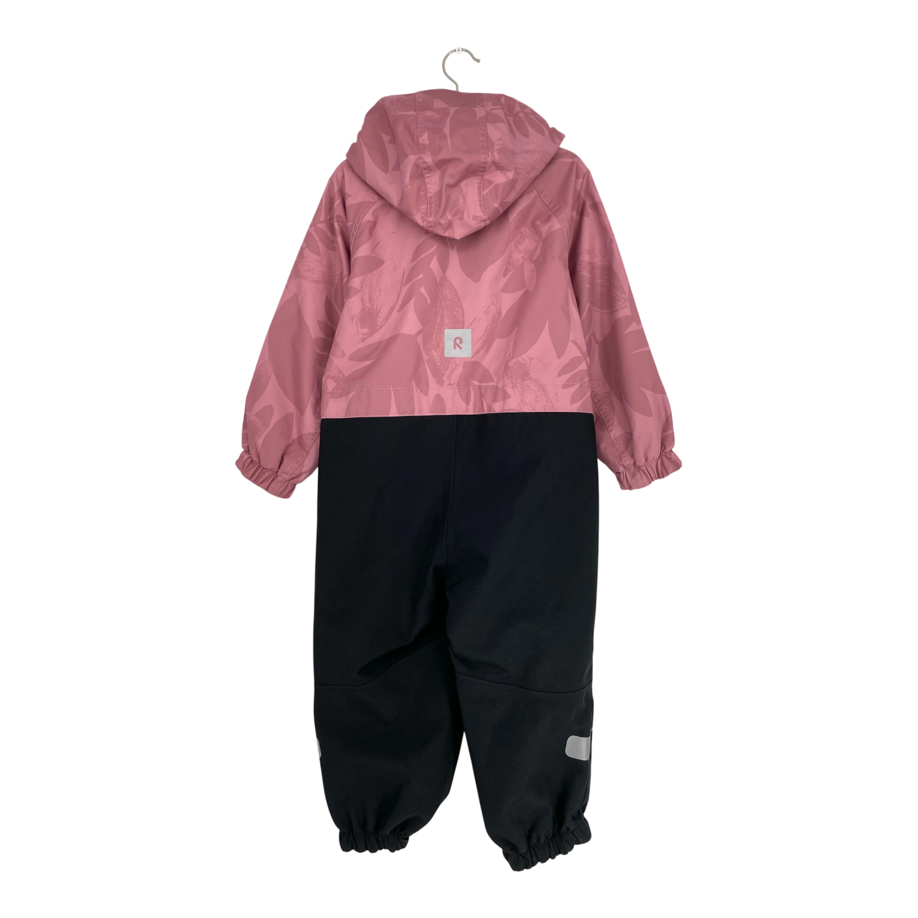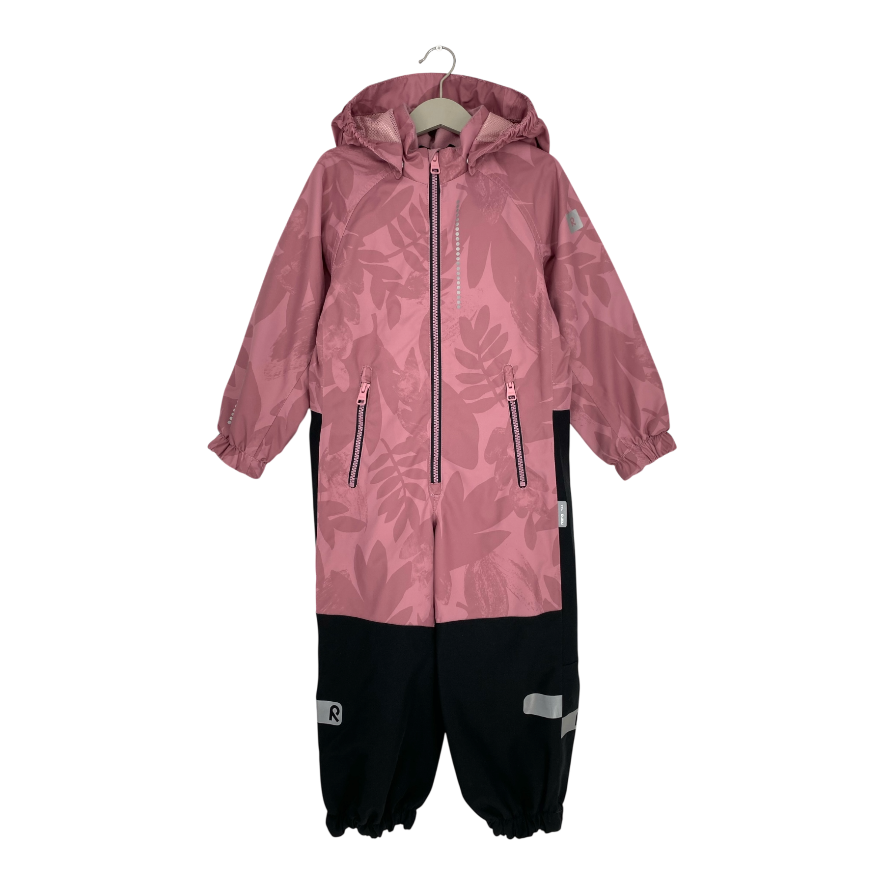 Reima Karviala mid-season overall with detachable hood, reflective details and adjustable waist. Two front pockets, elastic on the cuffs, and legs. Detachable and adjustable foot loops. Originally waterproof and seams are taped.