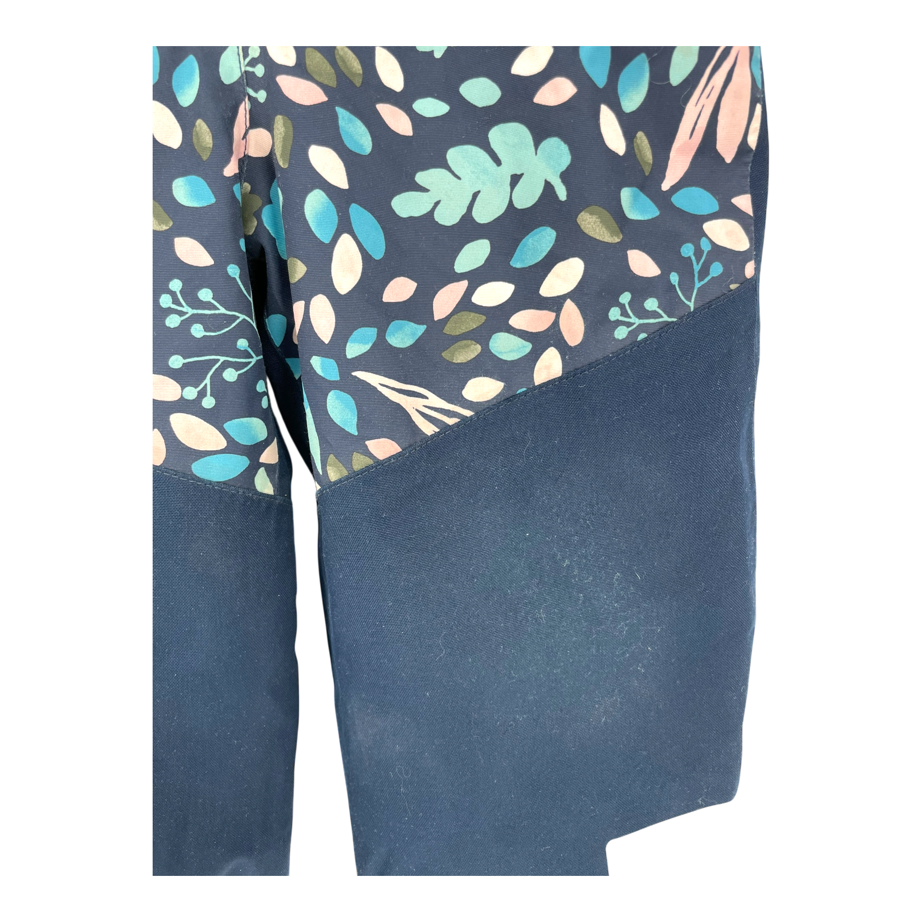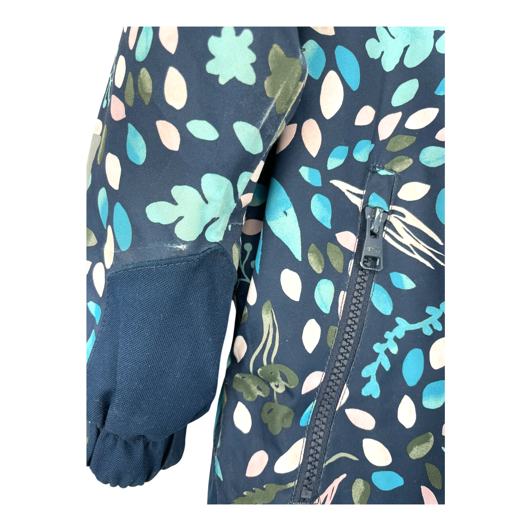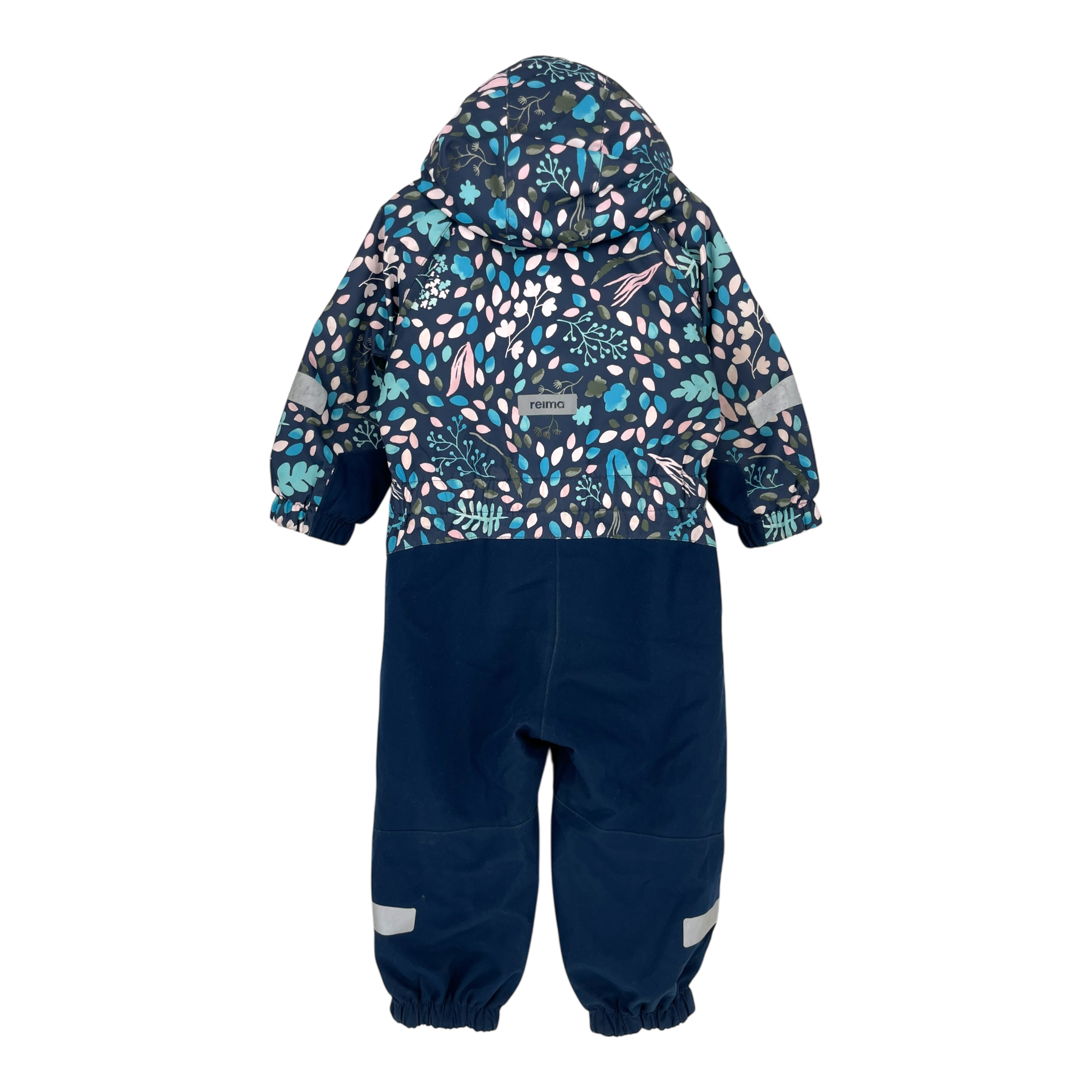 Reima Kurikka overall with a detachable hood and zip pockets on the sides. The material is originally waterproof up to 10,000mm water column, windproof, and breathable. All seams have been sealed. Durable reinforcements on the bottom, knees, and hems. The silicone foot loops keep the leg ends in place, no matter how fast your little one's moving.