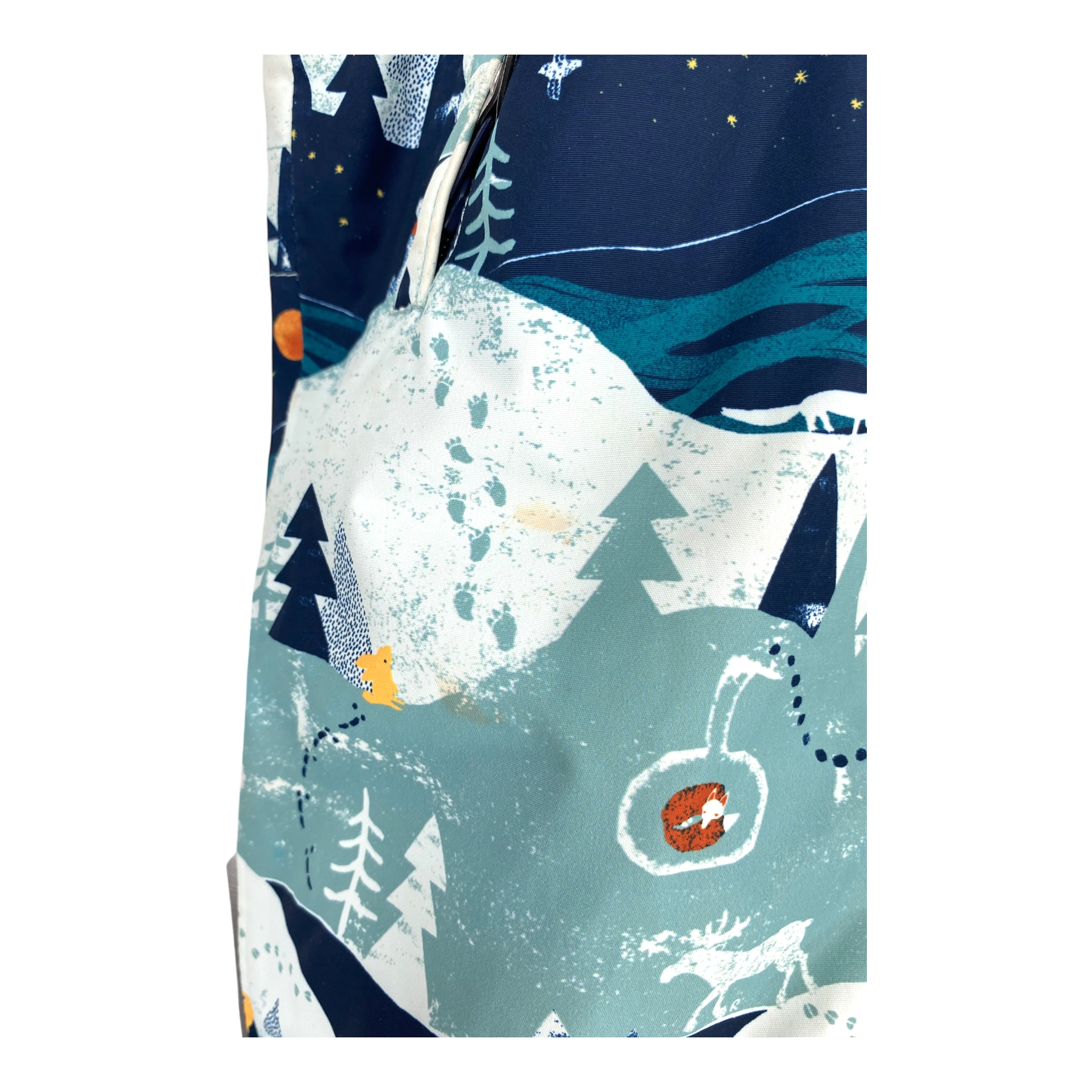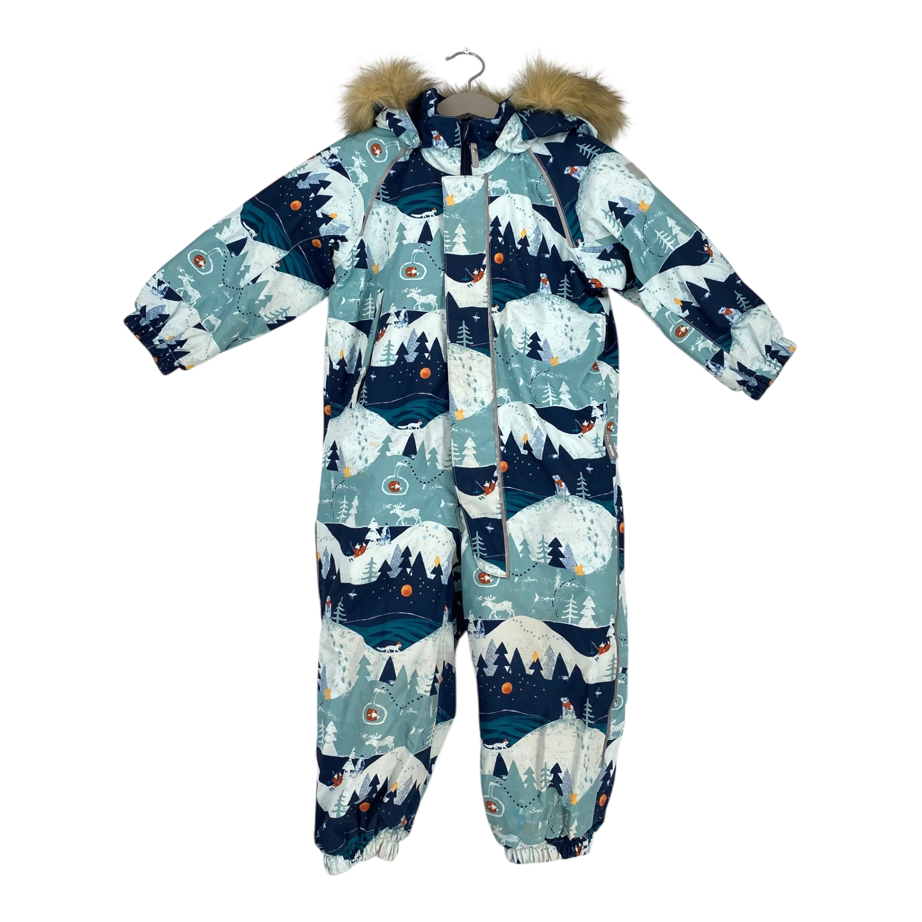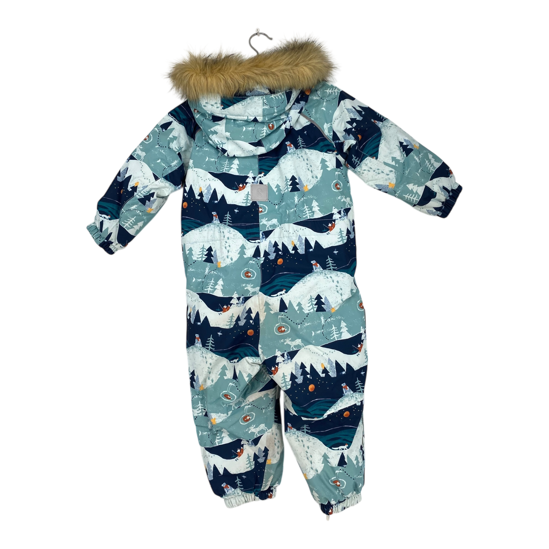 Reima Lappi overall with detachable and adjustable hood, two front pockets, and durable silicone foot loops keep the leg ends in place, protecting ankles from moisture and the cold. The seat is insulated to keep bottoms warm and dry during cold-weather adventures.