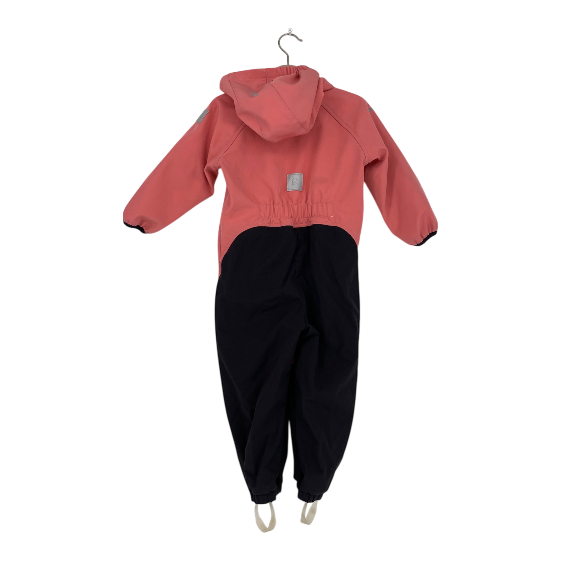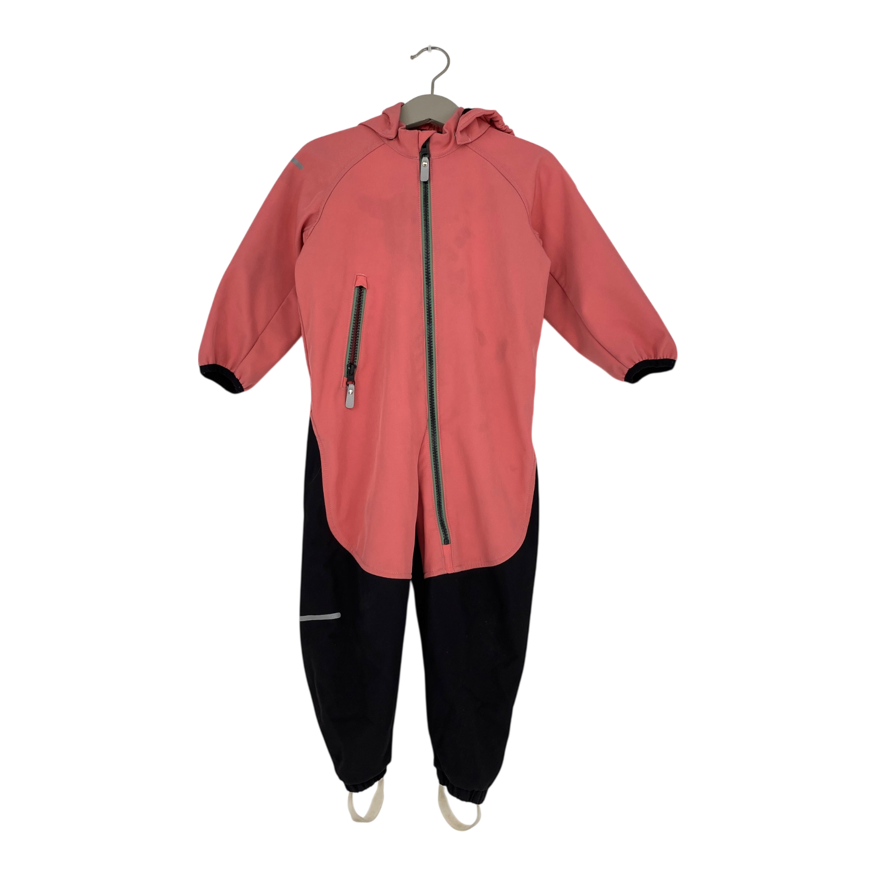 Reima Mjosa softshell midseason overall with detachable hood, one zipper pocket, reflective details, and detachable foot loops in hems. The material is originally waterproof up to 10,000mm water column, and the bottom part is very durable. The item has stains.