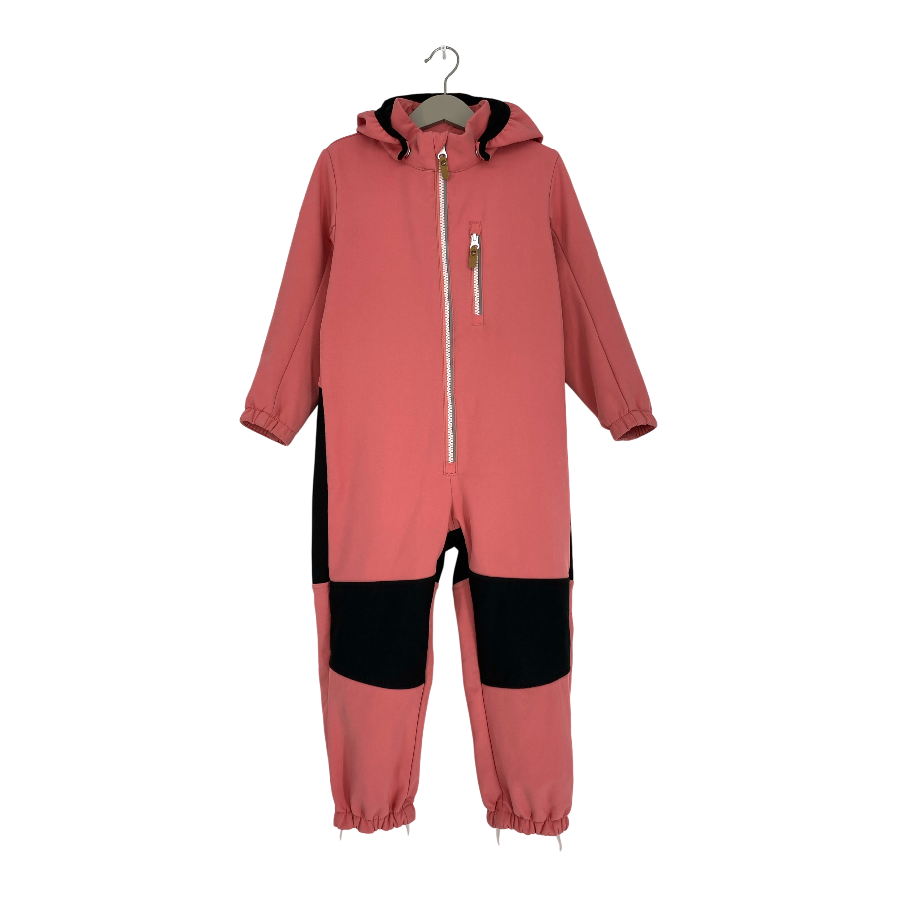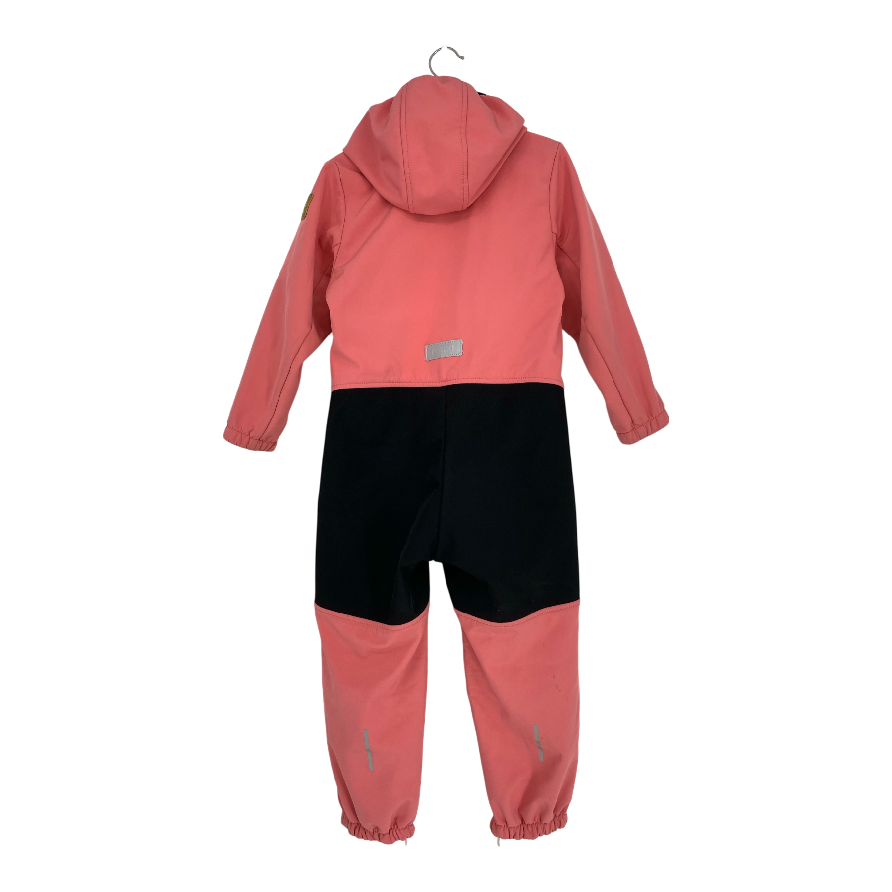 Reima Nurmes softshell midseason overall with durable reinforcements and fleece on reverse. Originally the surface has been treated with water-repellent finish. Elastic cuffs at wrists and leg ends together with the durable, detachable silicone foot loops, detachable hood, a zipper pocket and zipper fastening in the front.