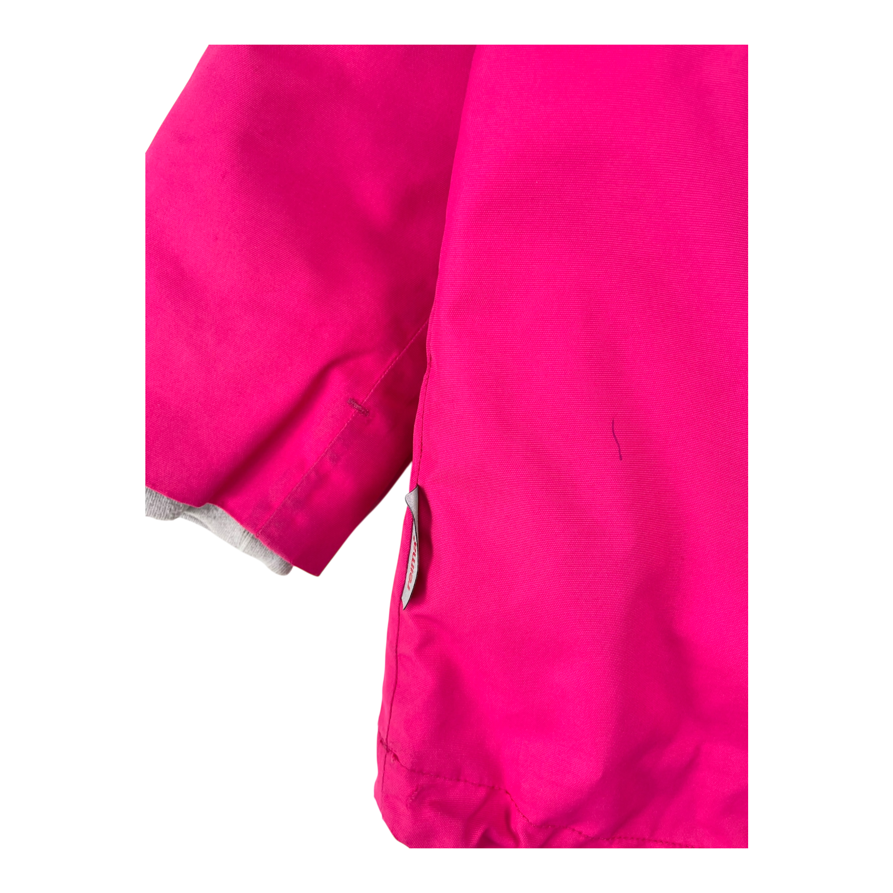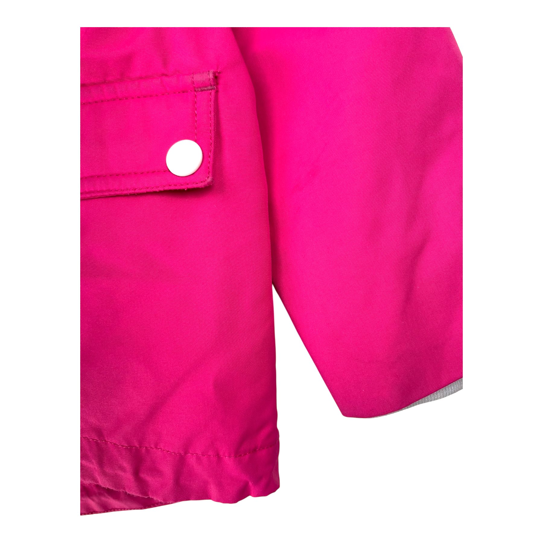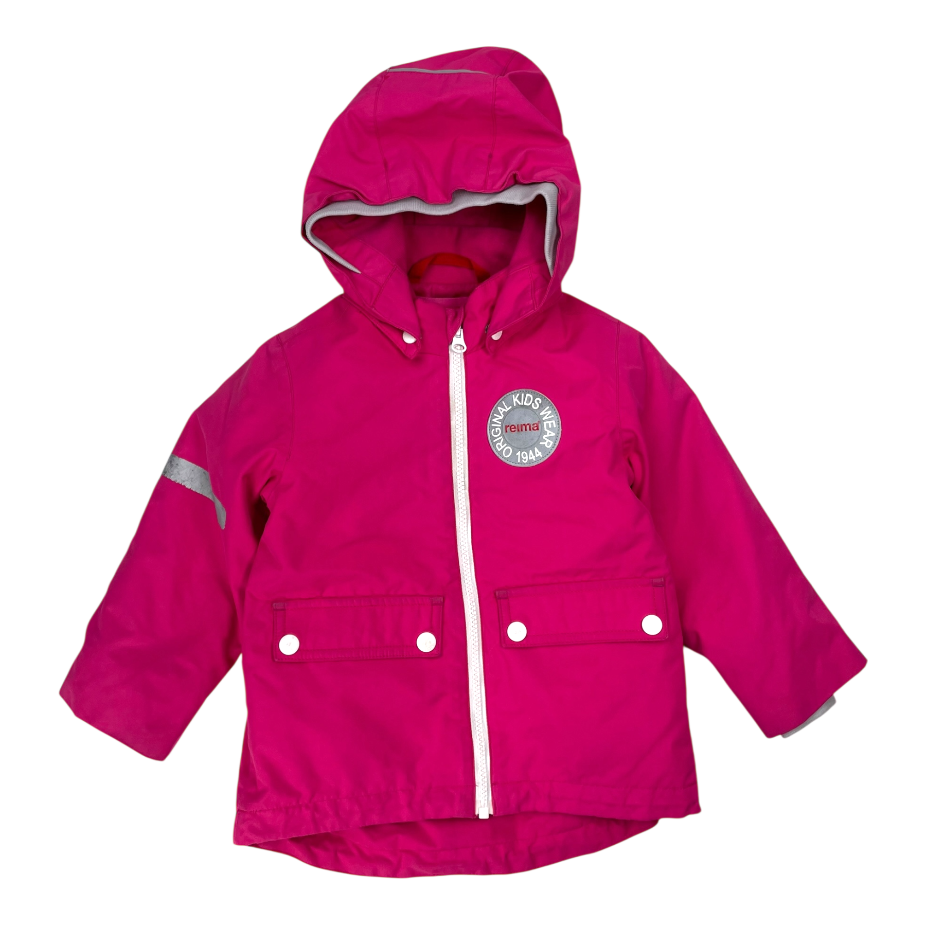 Reima Taag midseason jacket with detachable hood, two snap button pockets, reflective details, and adjustable elastic at the hem. The material is originally waterproof up to 8,000mm water column, and the main seams are sealed.