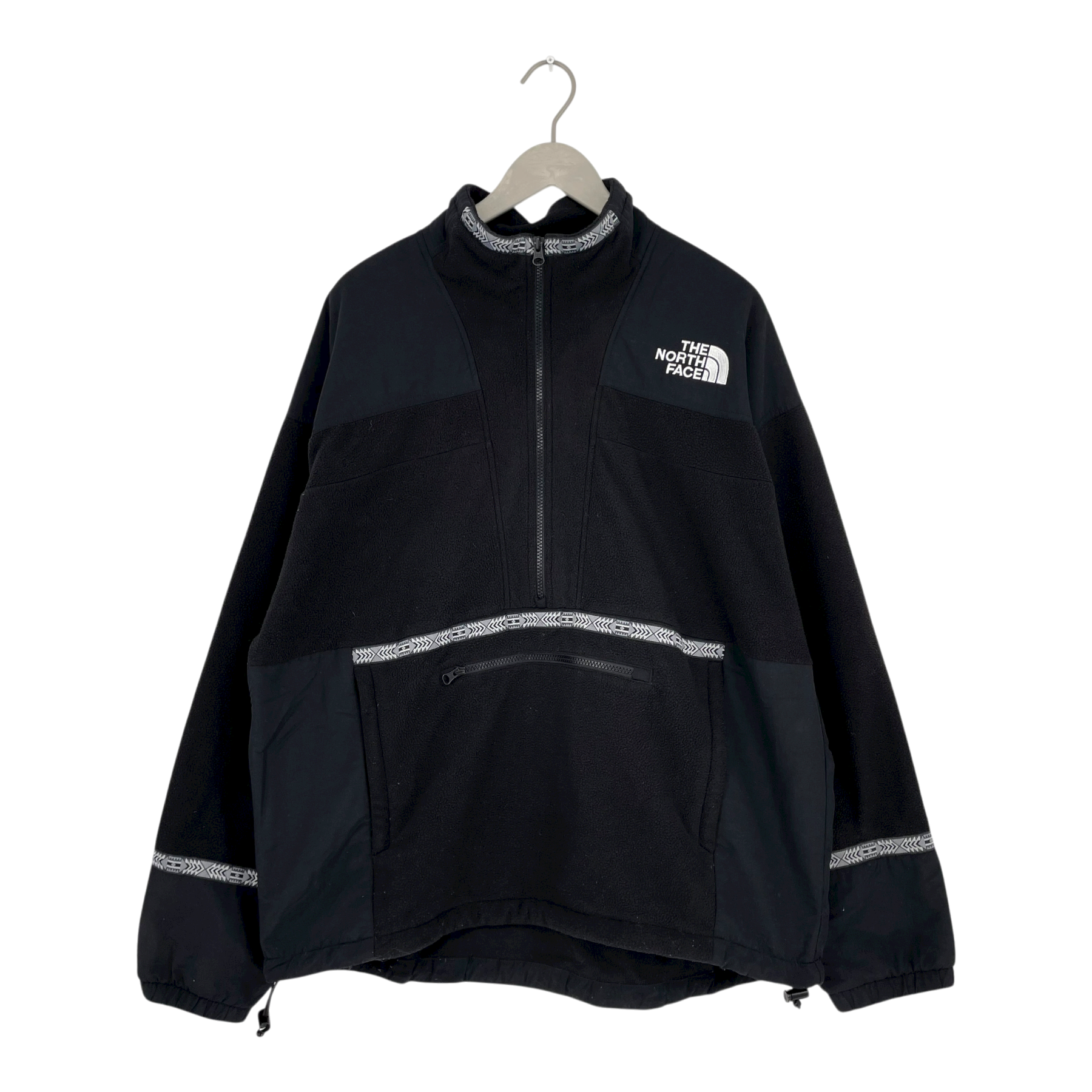 The North Face Rage Flec anorak fleece. Front zipper pocket and adjustable elastic drawstrings on the hem.