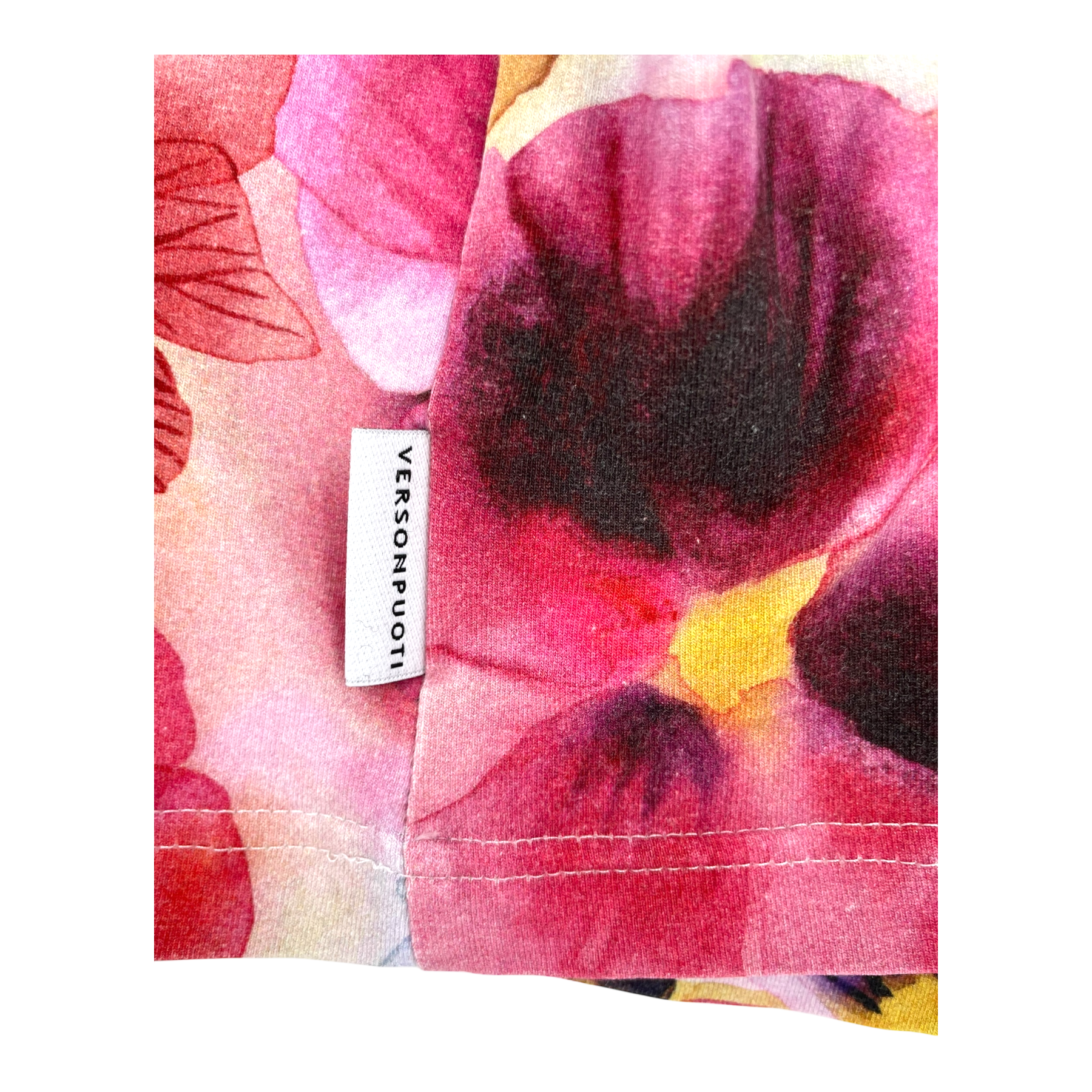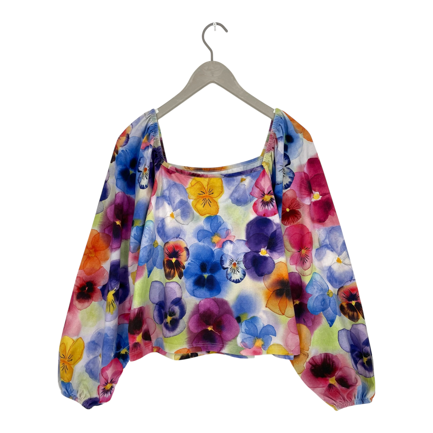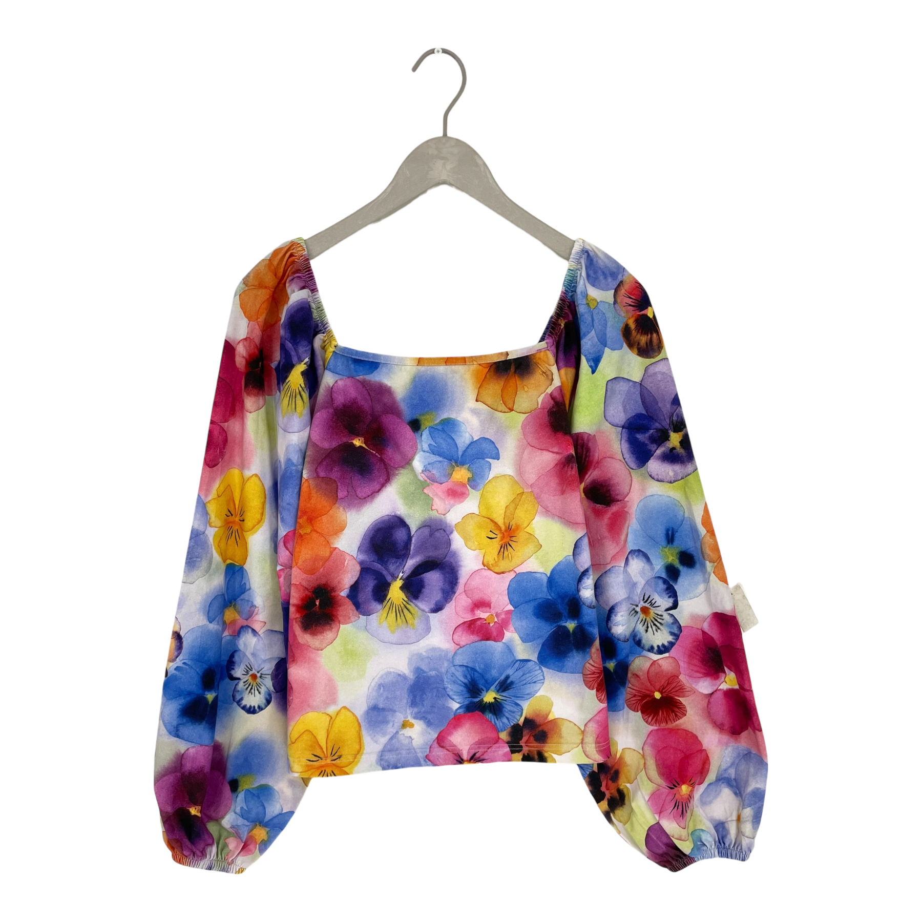 Versonpuoti long-sleeved shirt in Orvokki print. Sleeves are puffed and the shirt is cropped.
