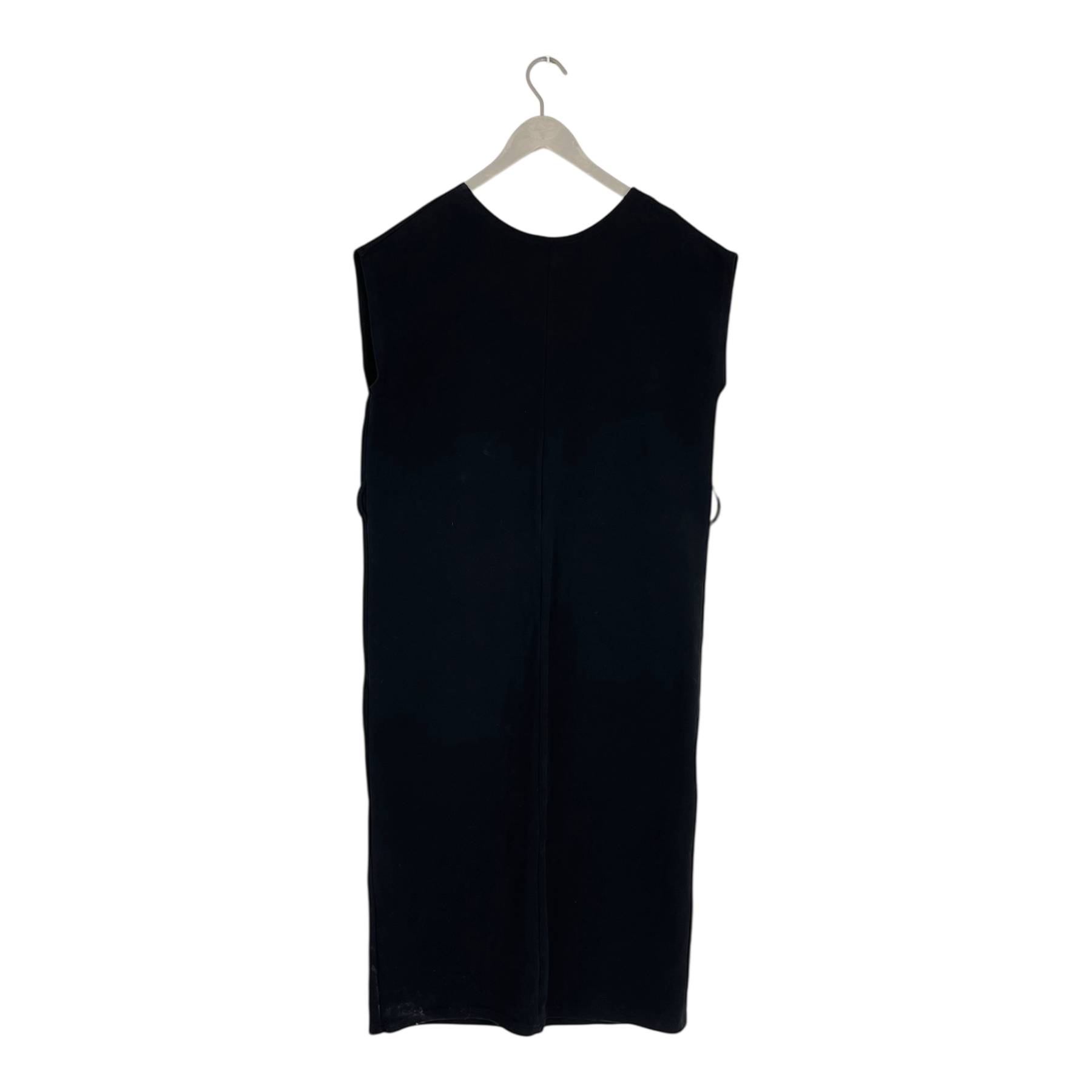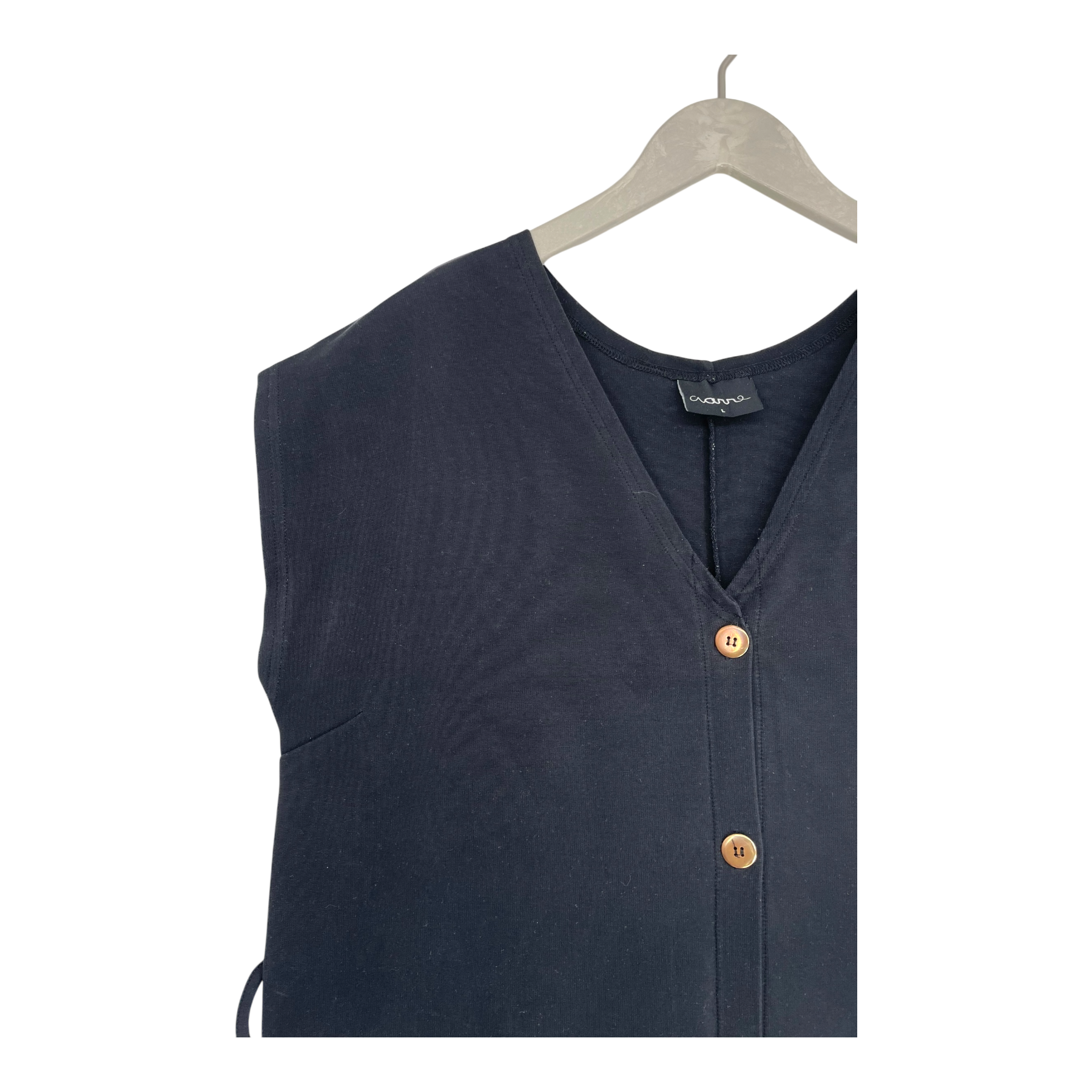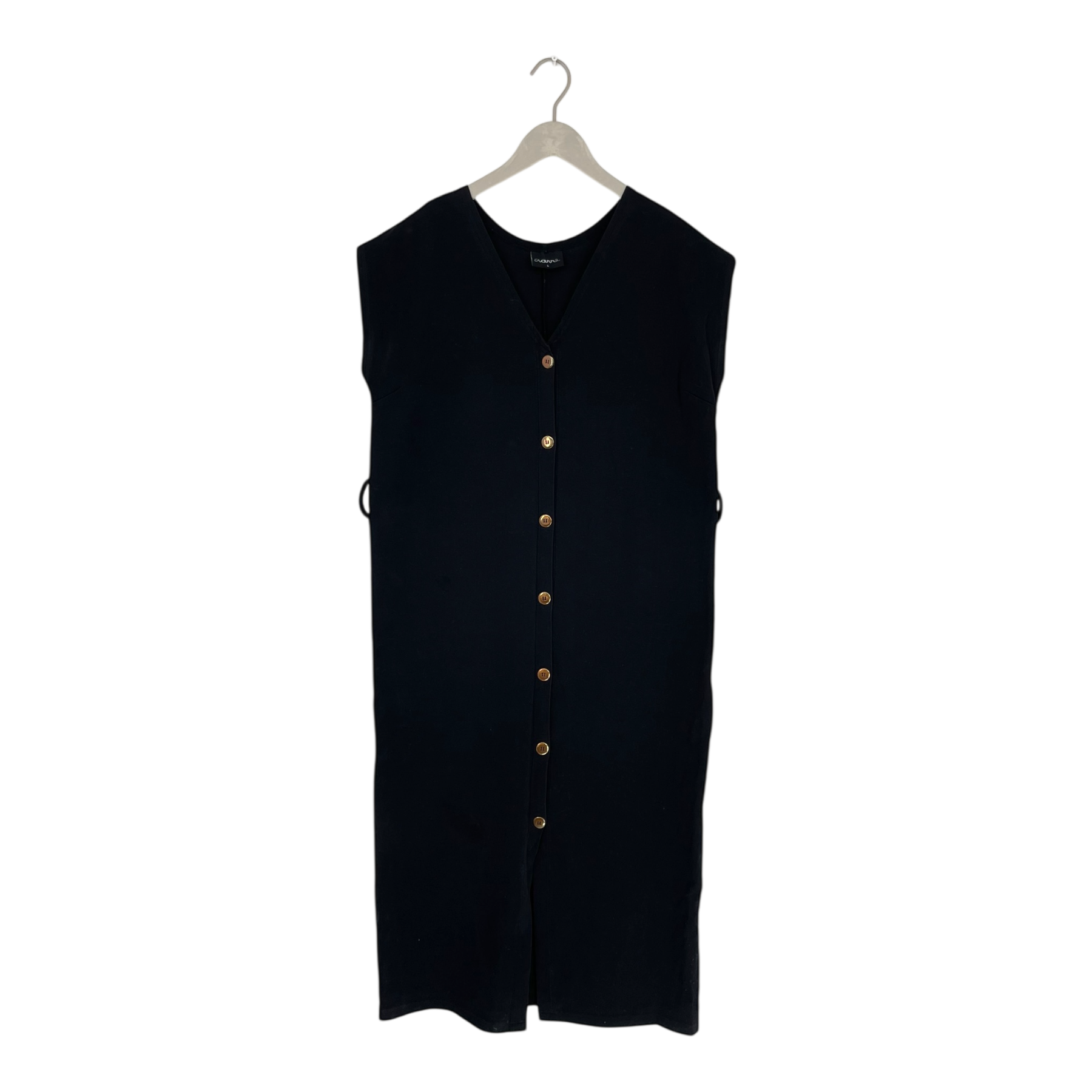 Aarre button dress is an elegant button-front dress featuring gold-colored buttons on the front and belt loops at the waist on the sides. The original fabric belt is unfortunately missing, but the dress can be worn beautifully without a belt or styled with your own. The length falls below the knees, creating a timeless and flattering silhouette.