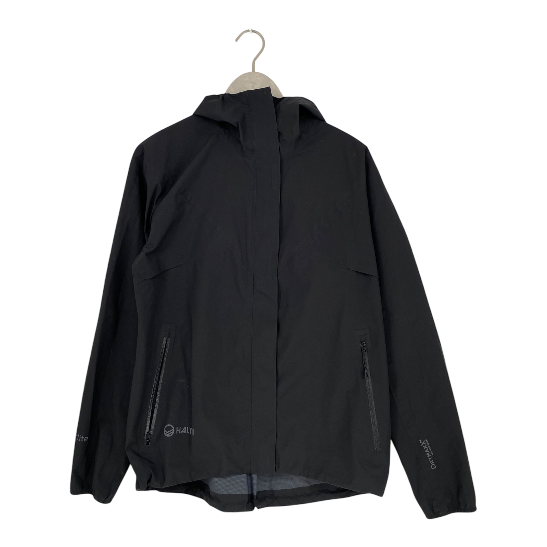 Halti women's DrymaxX All weather shell jacket. The jacket has a waterproof zipper closure and two sealed waterproof side pockets. The hood and the hemline can be adjusted with drawstrings and the cuffs can be tightened for a better fit.