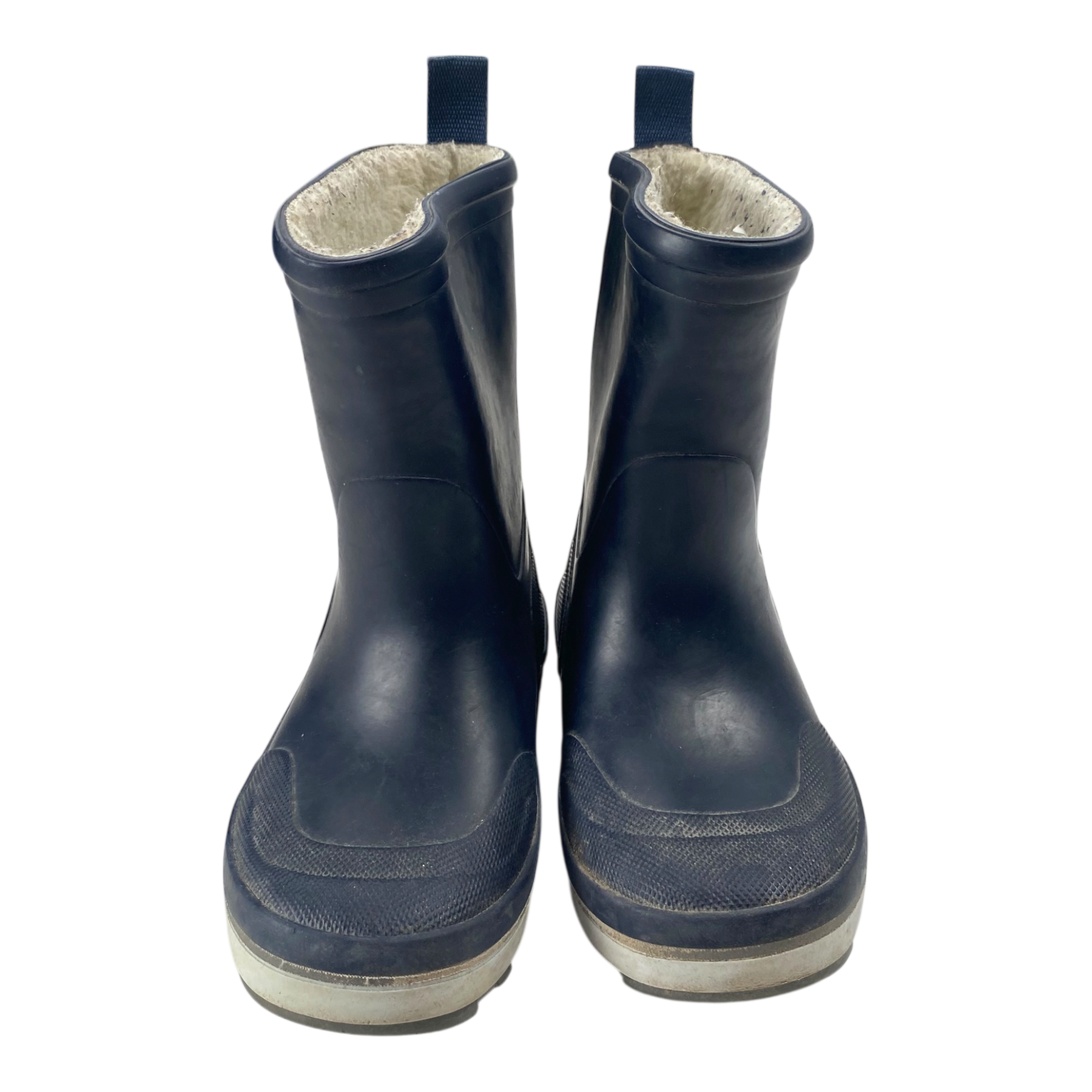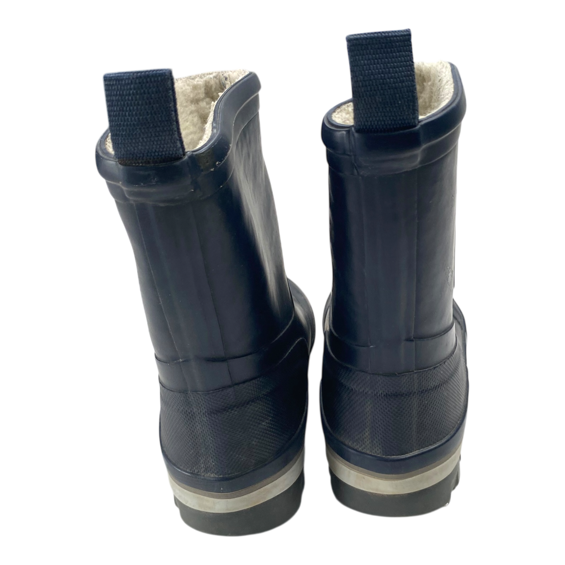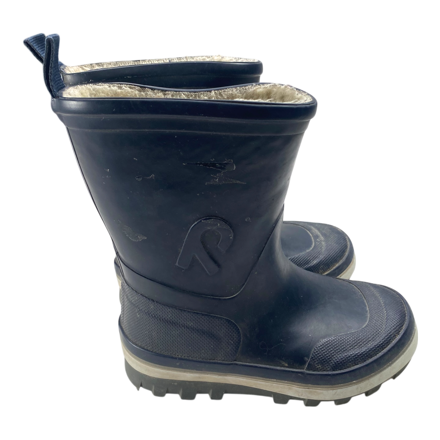 Reima winter rain boots are waterproof with extra warm fleece lining. They are super easy to pull on and keeps your feet warm and dry. The item has some signs of use and a tape mark as seen in the last picture.
