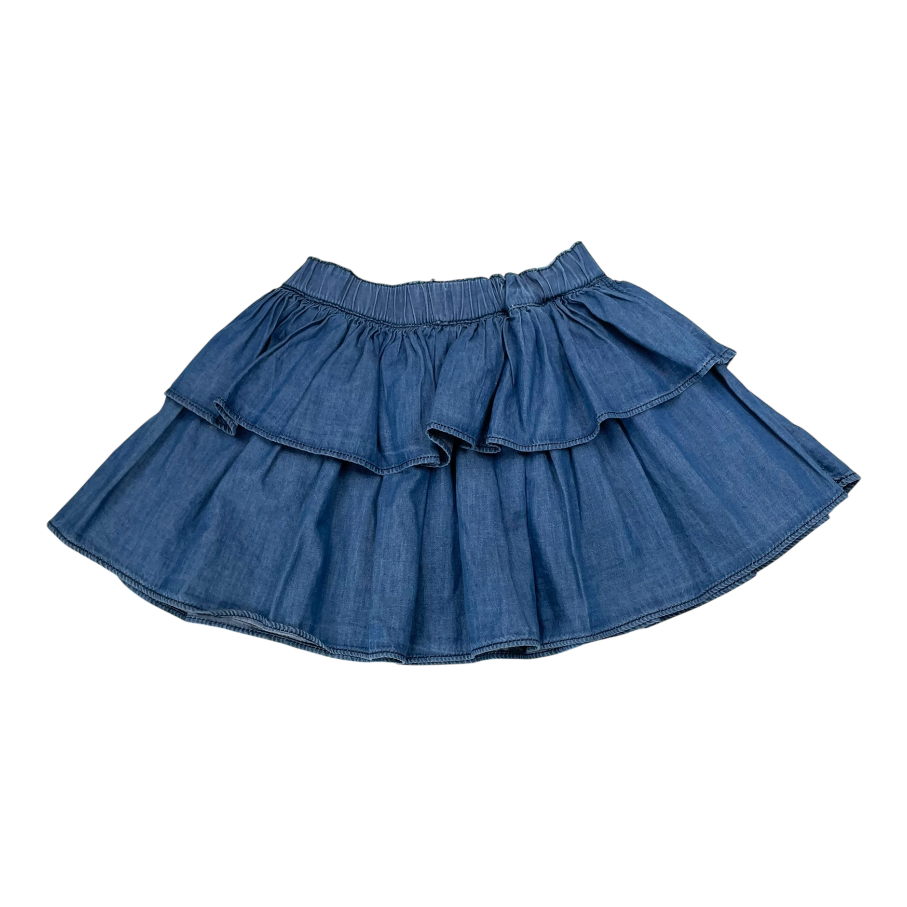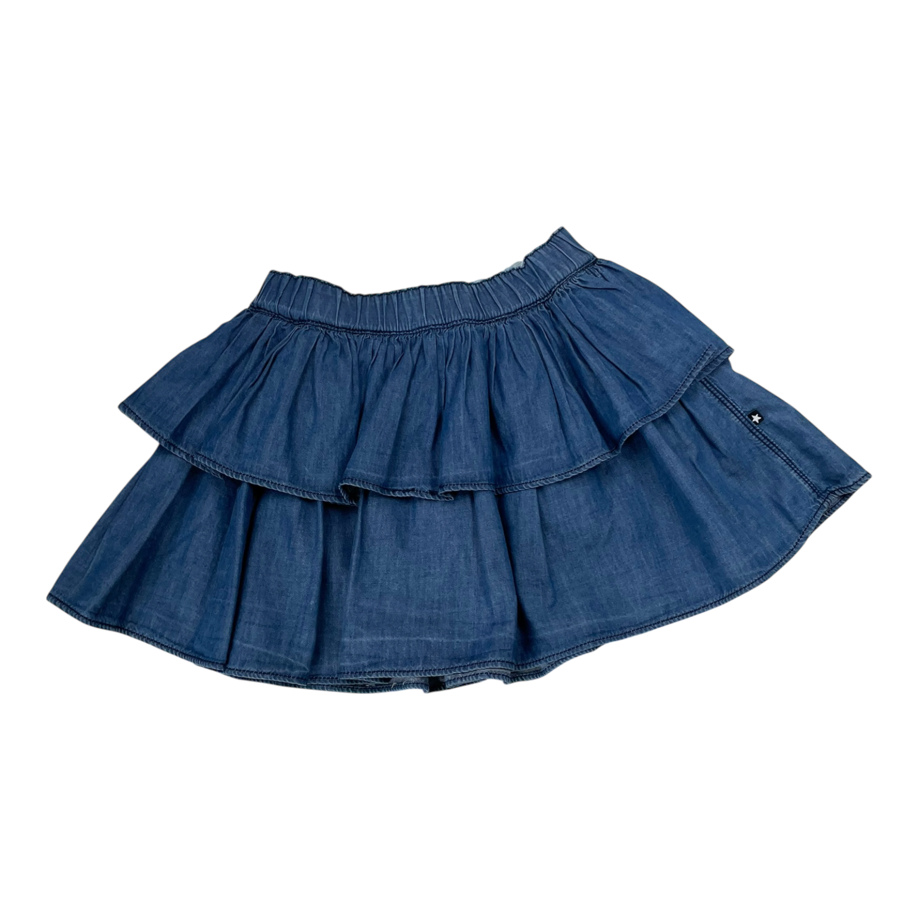 Molo kids skirt in washed dark blue with ruffle details and elastic waistband.