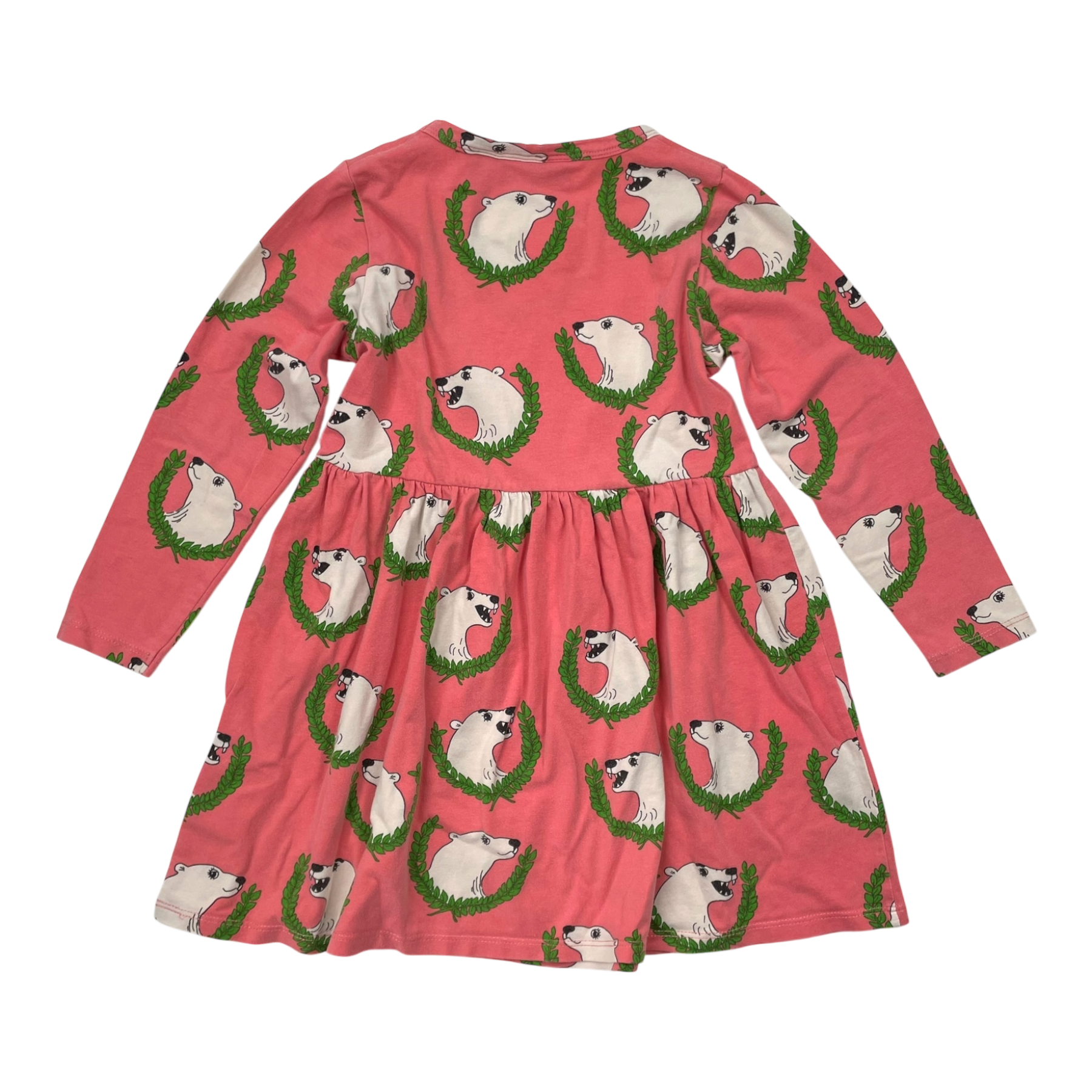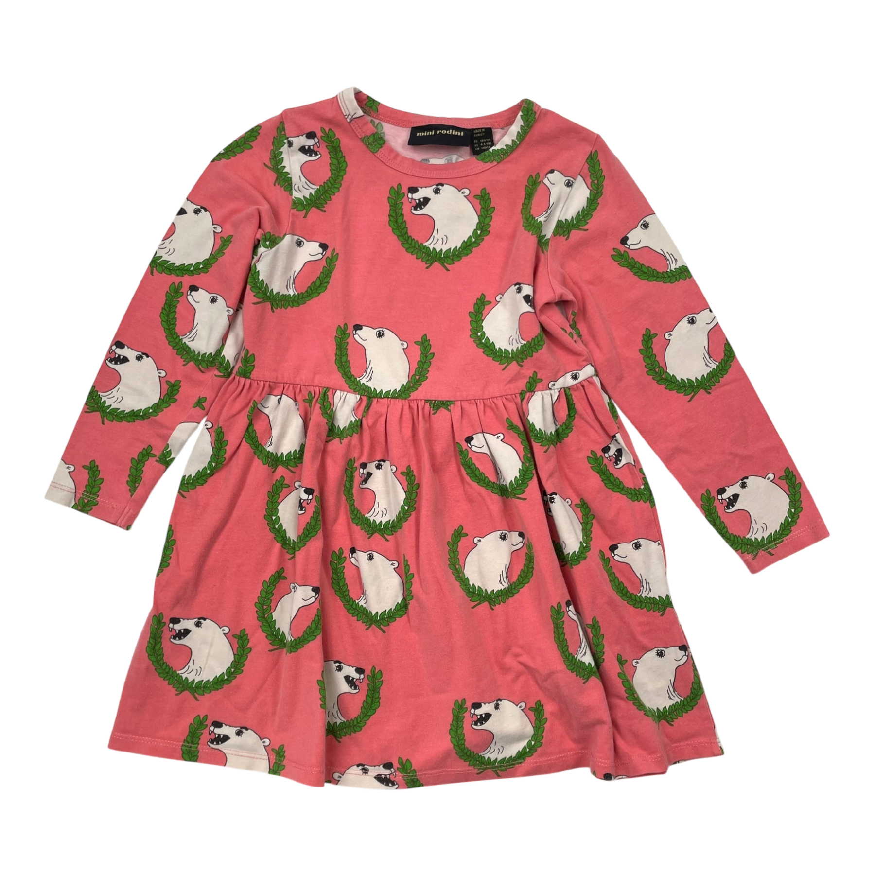 Mini Rodini dress in bear print. There is some light white fluff on the fabric.