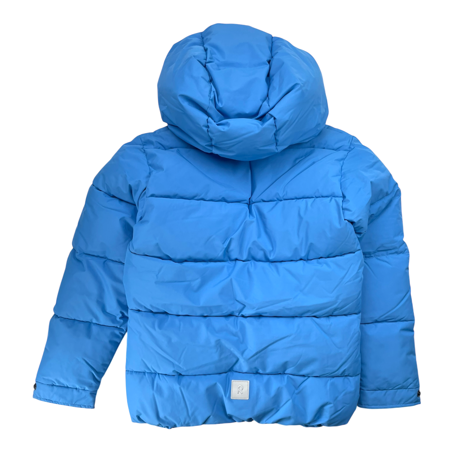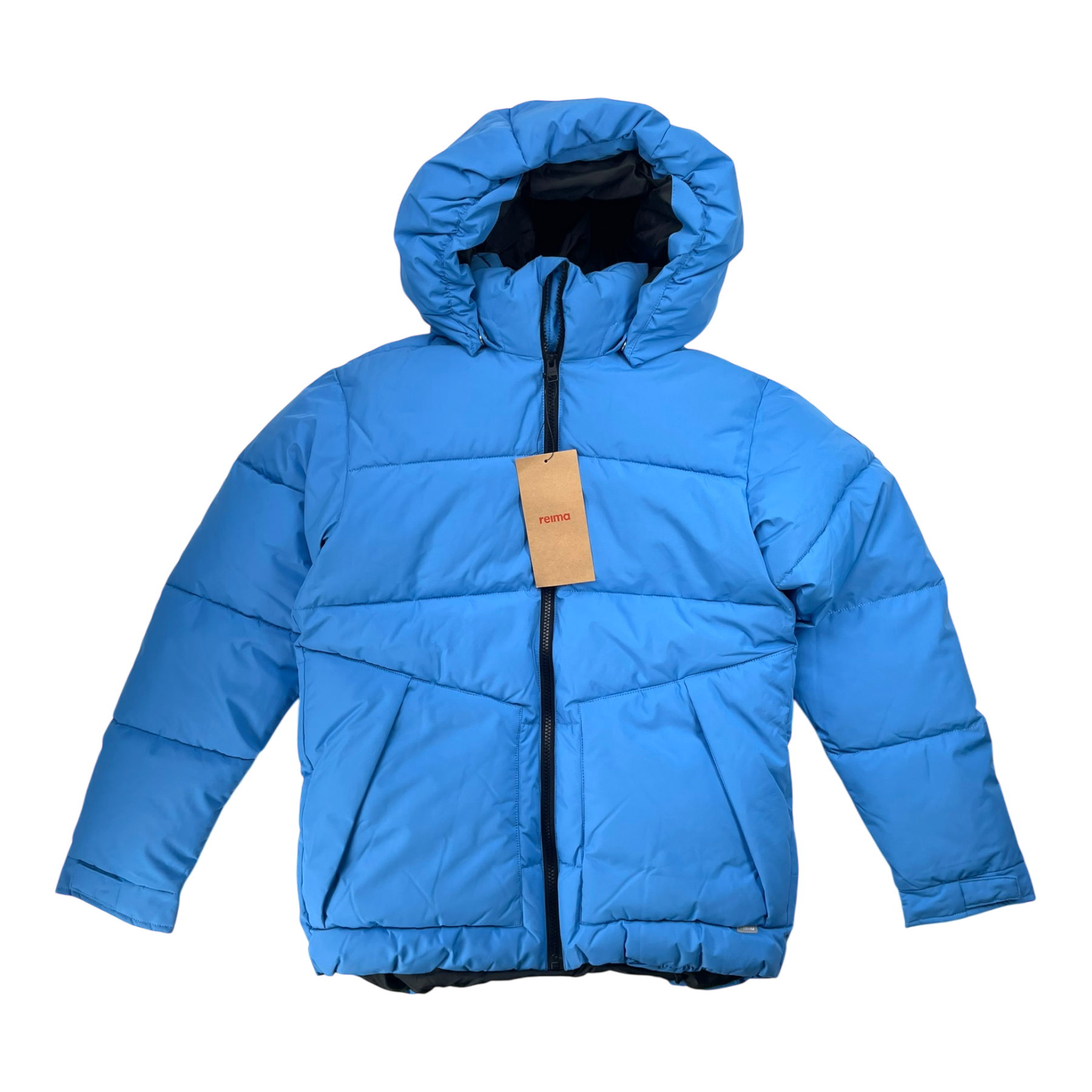 Reima Osteri puffer jacket with detachable hood, two zip pockets and reflective details. Made from a windproof and breathable material, with a water and dirt-repellent surface, the design keeps children warm and dry during winter fun.