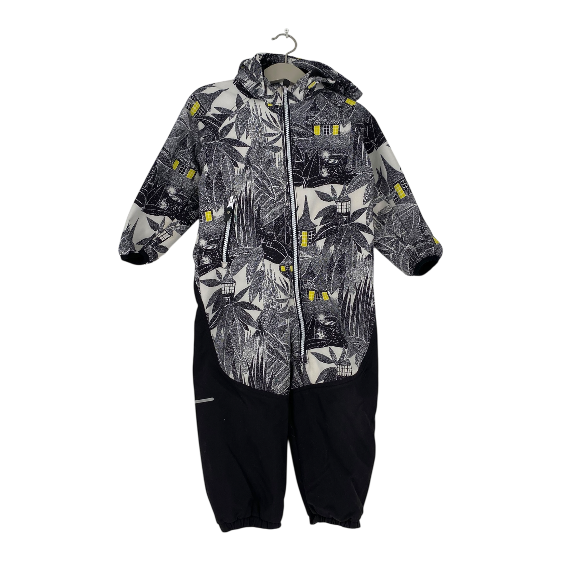 Reima Skyddad Moomin softshell midseason overall with durable reinforcements and fleece on reverse. Originally the surface has been treated with water-repellent finish. Elastic cuffs at wrists and leg ends together with the detachable hood, a zipper pocket and zipper fastening in the front.