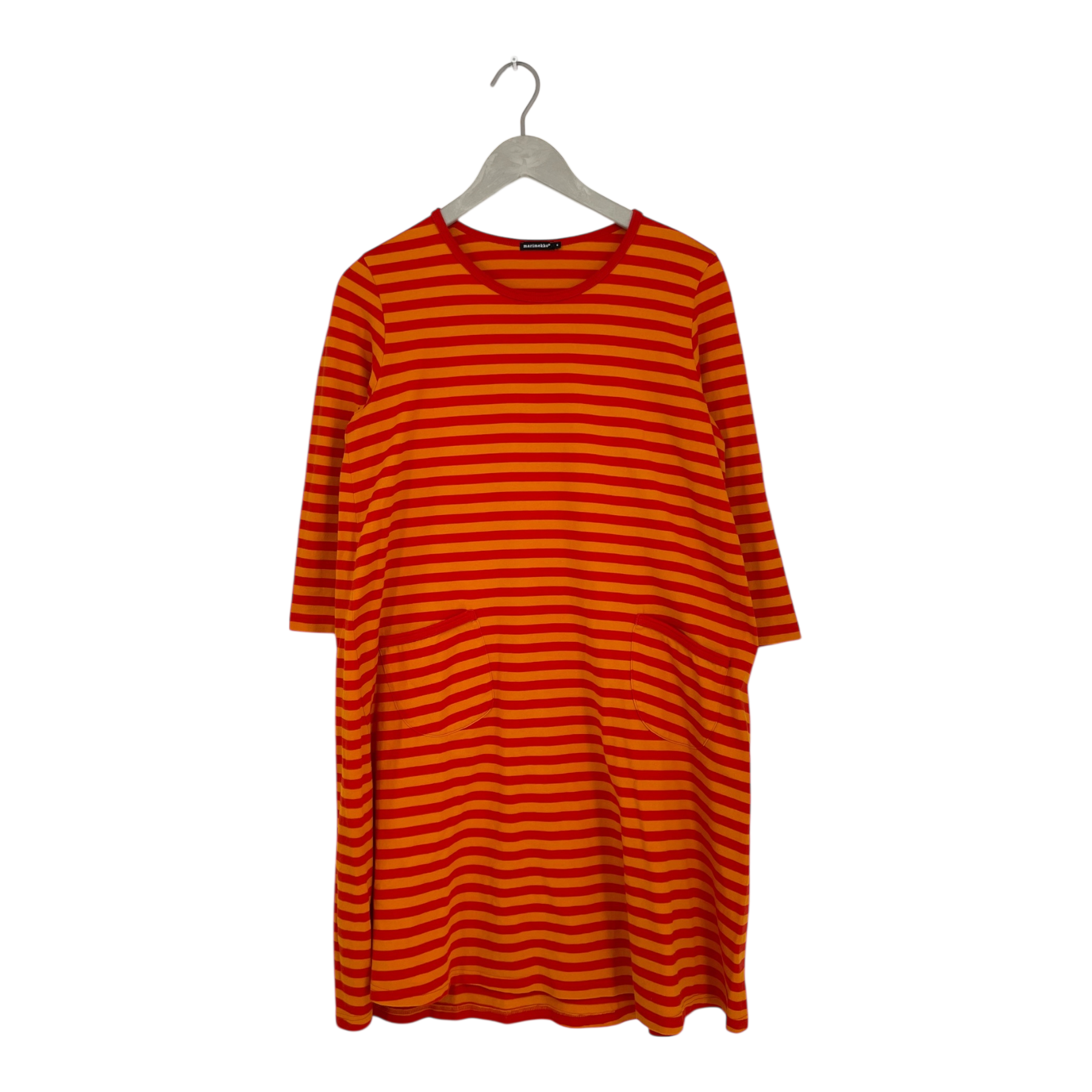 Marimekko Tiia A-line dress with three-quarter sleeves and two stitched-on front pockets. The slightly angled pockets are topped with binding, as is the neckline.