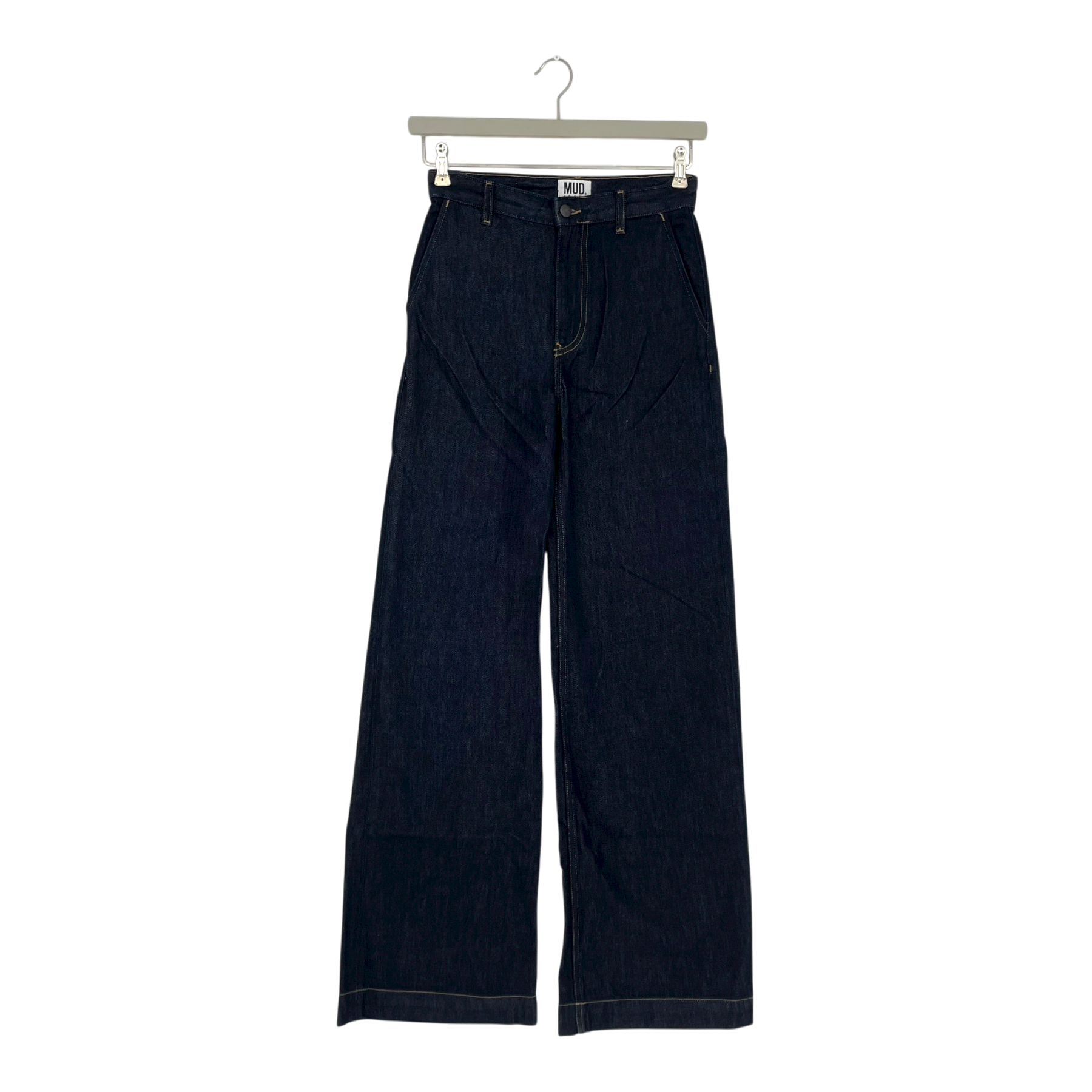 Mud Jeans June is a palazzo-style pant that combines sophistication and comfort. With a mid-rise waist and wide-leg design, it features slanted front pockets and welted back pockets for a polished look. The garment is constructed from a fabric that uses various weaving techniques to bring a new level of softness and flow to the style. The June gently widens from the hip down, creating a fluid, graceful silhouette that elongates your legs.