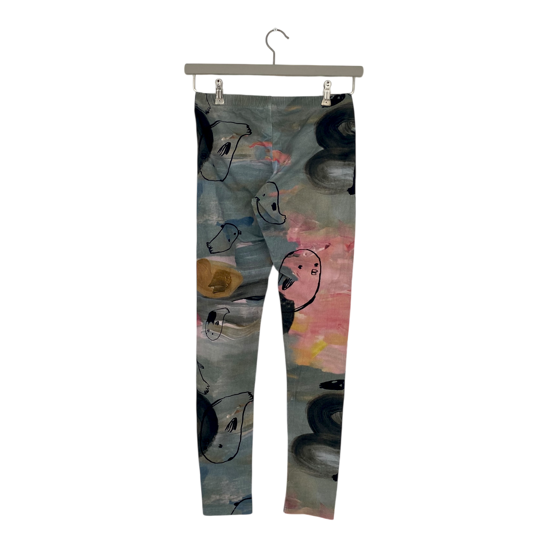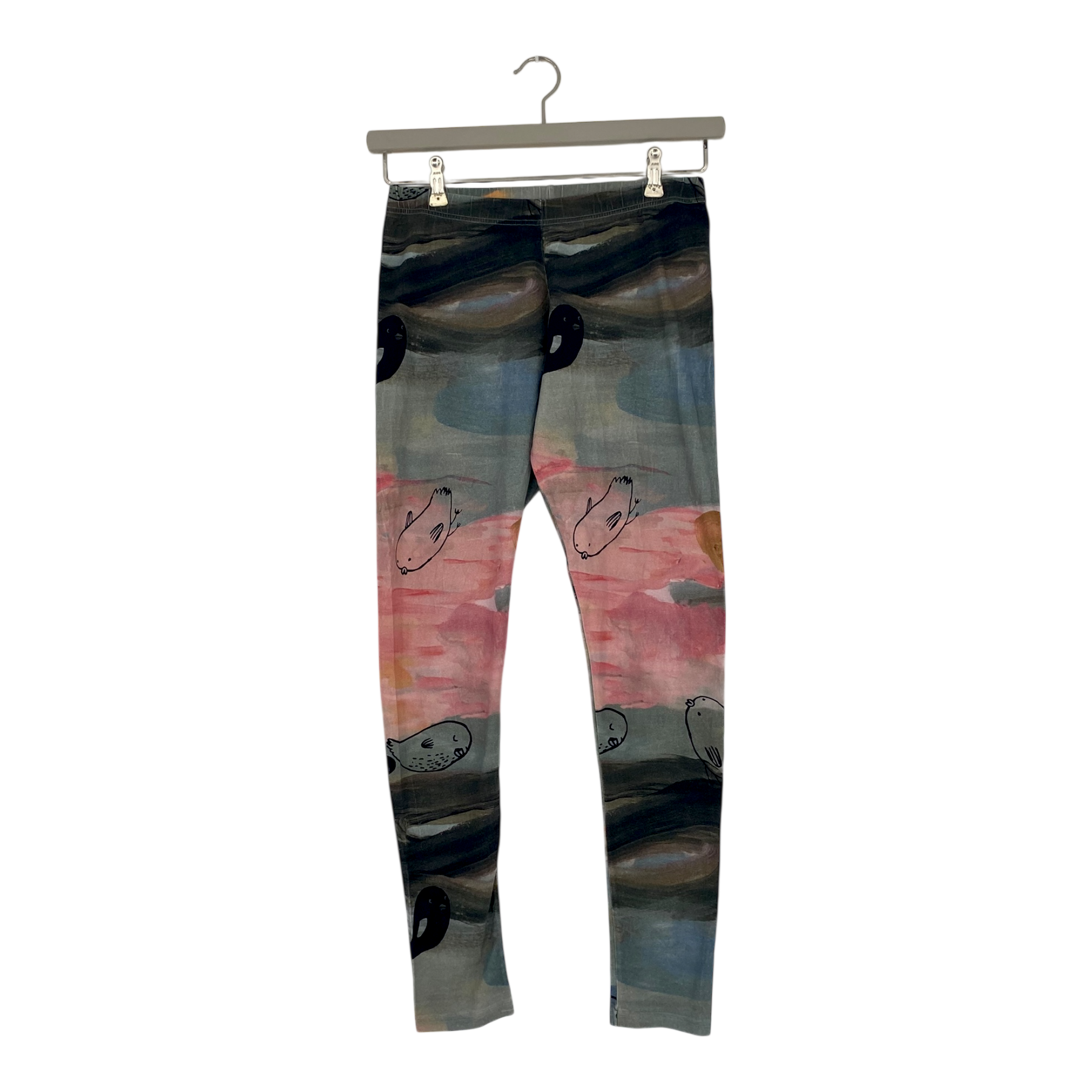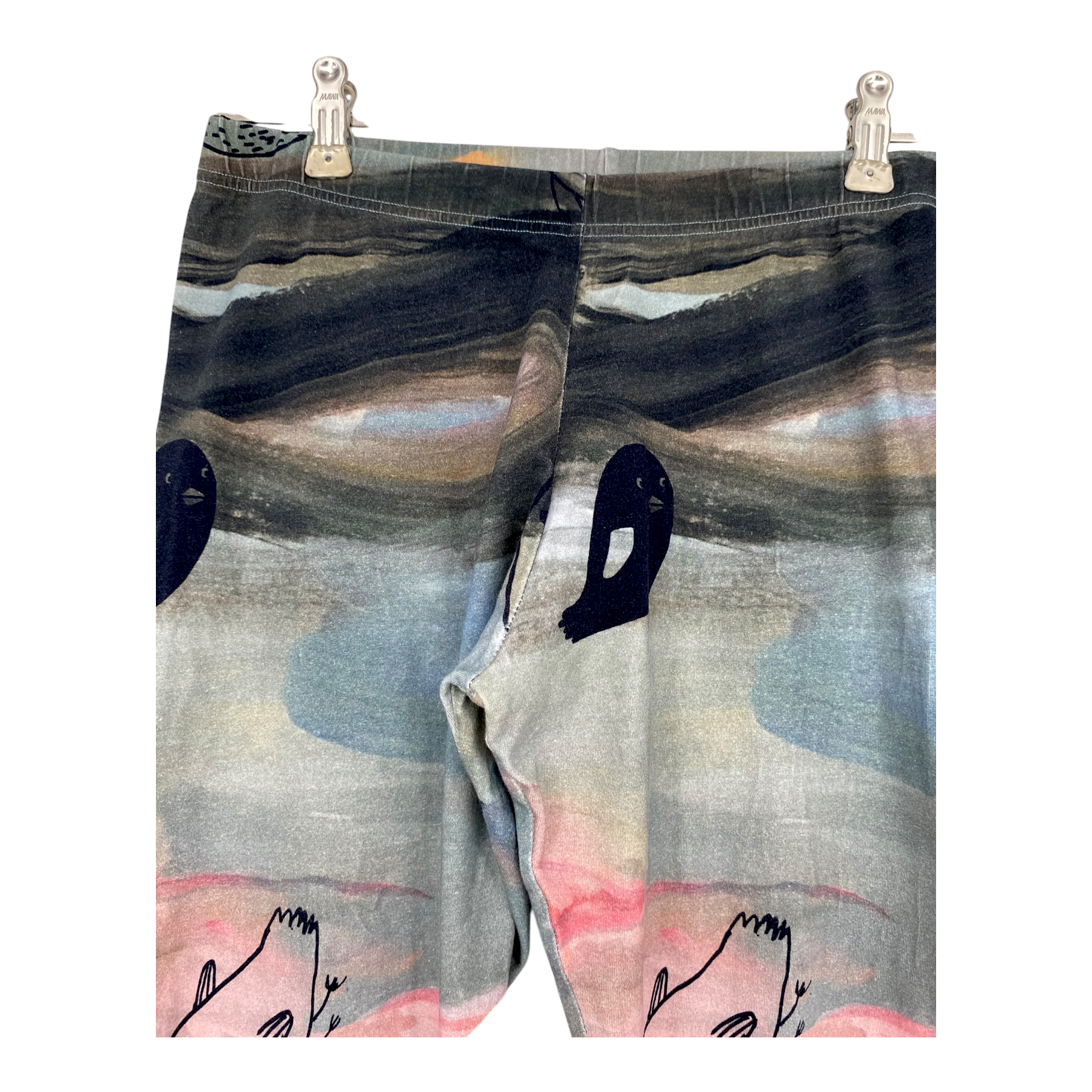 Papu women's leggings in a bird print. The seams show signs of wear.