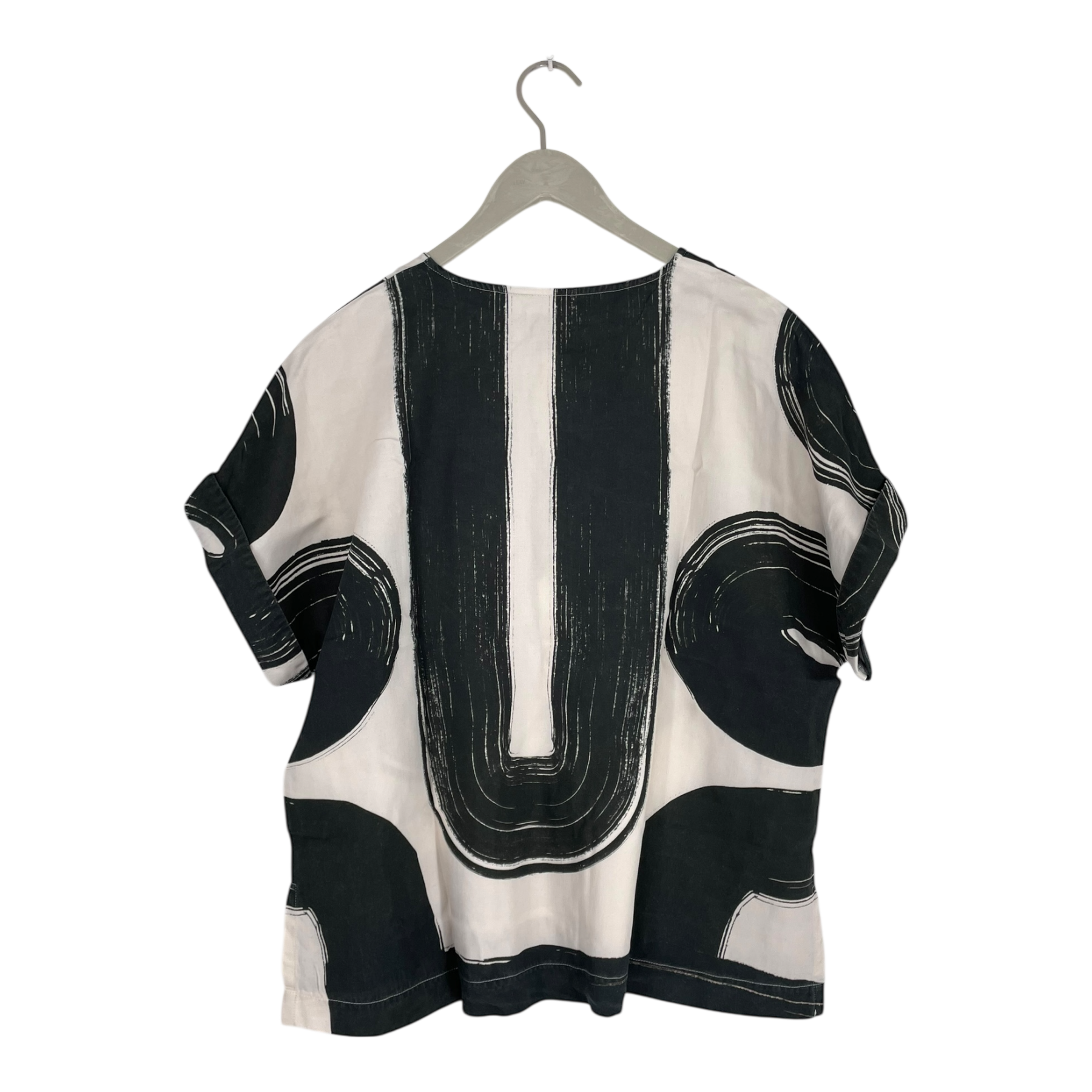 Papu women's boxy button-up shirt with a v-neck line. Buttons down the front. Slits on sides, hem is longer from the back. Casual fit.