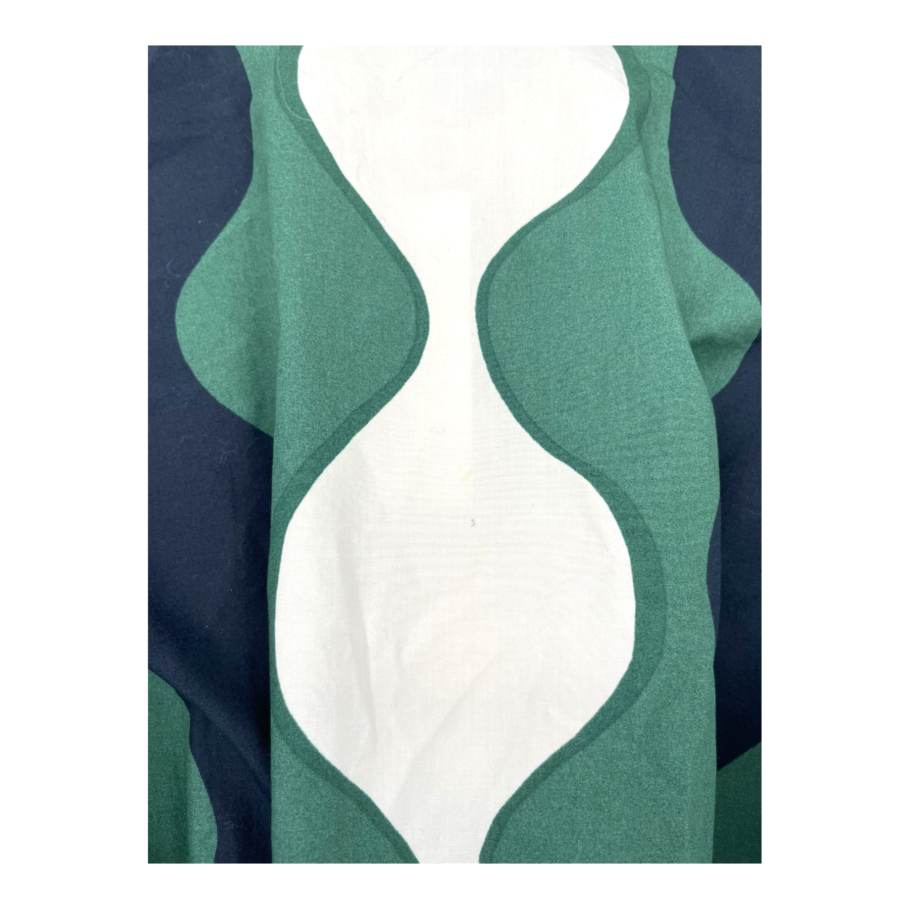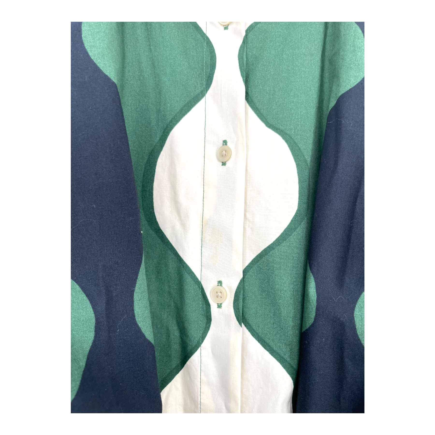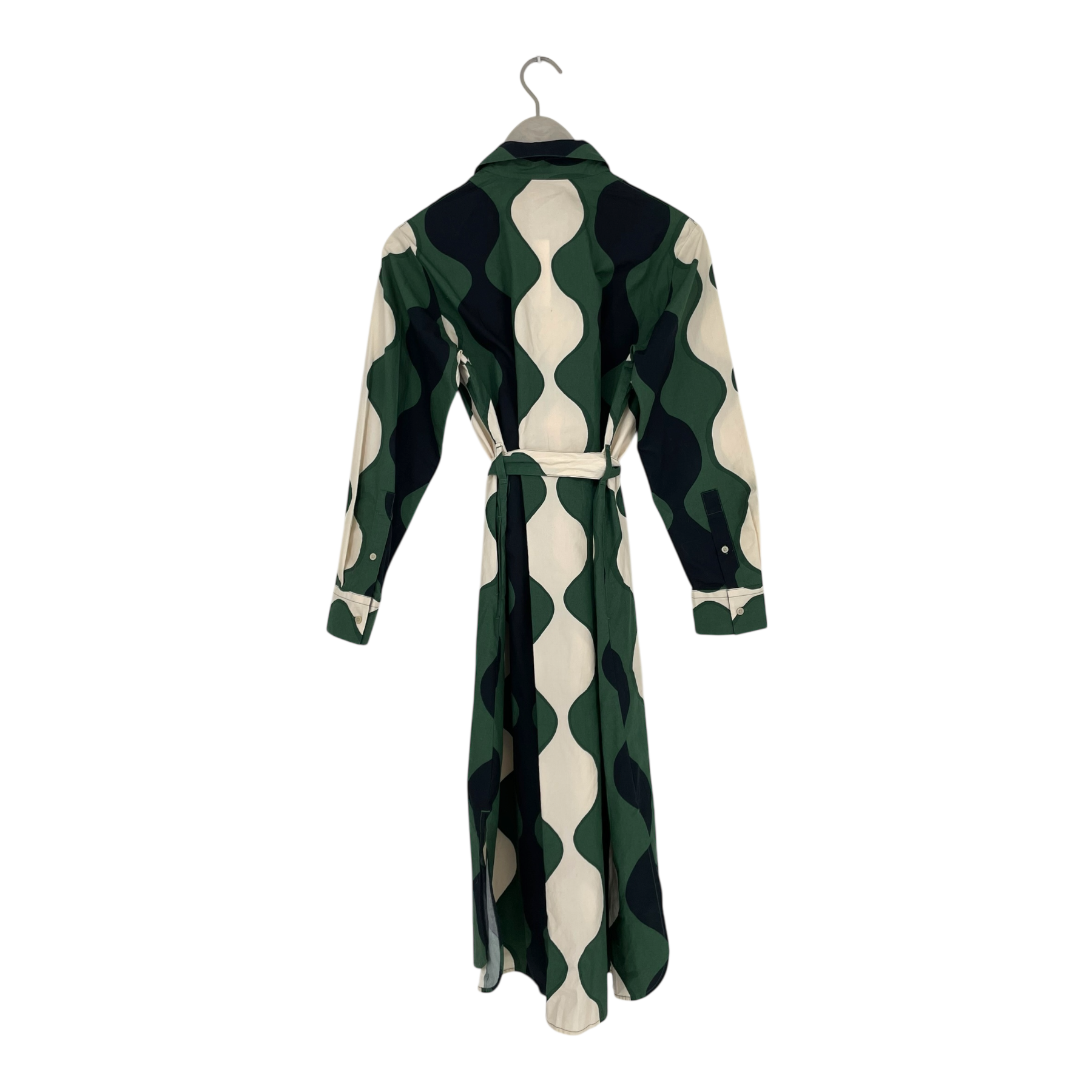 Marimekko x Uniqlo fully buttoned poplin dress with long sleeves and removable fabric belt. The fabric is somewhat stiff, either by design or from the wash.