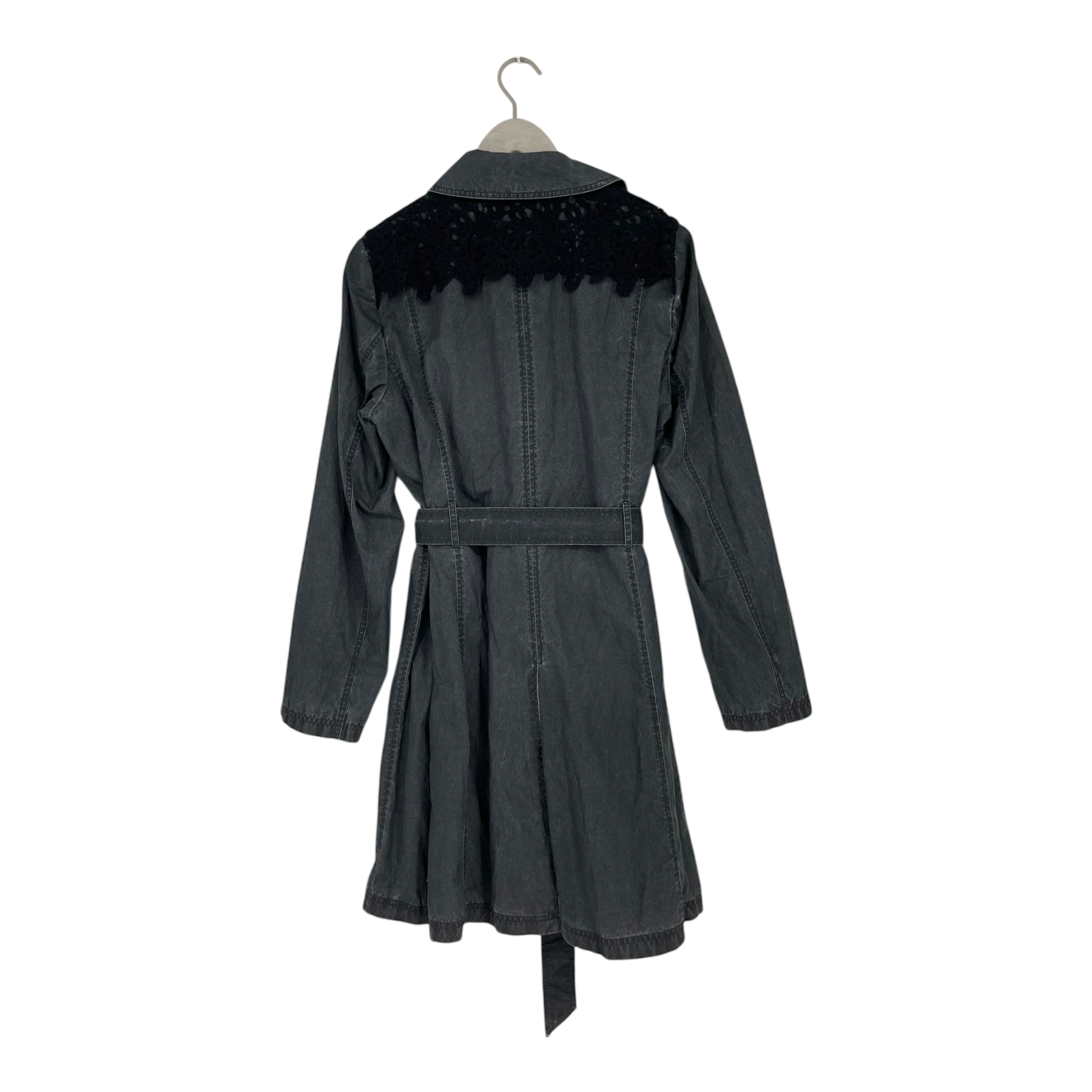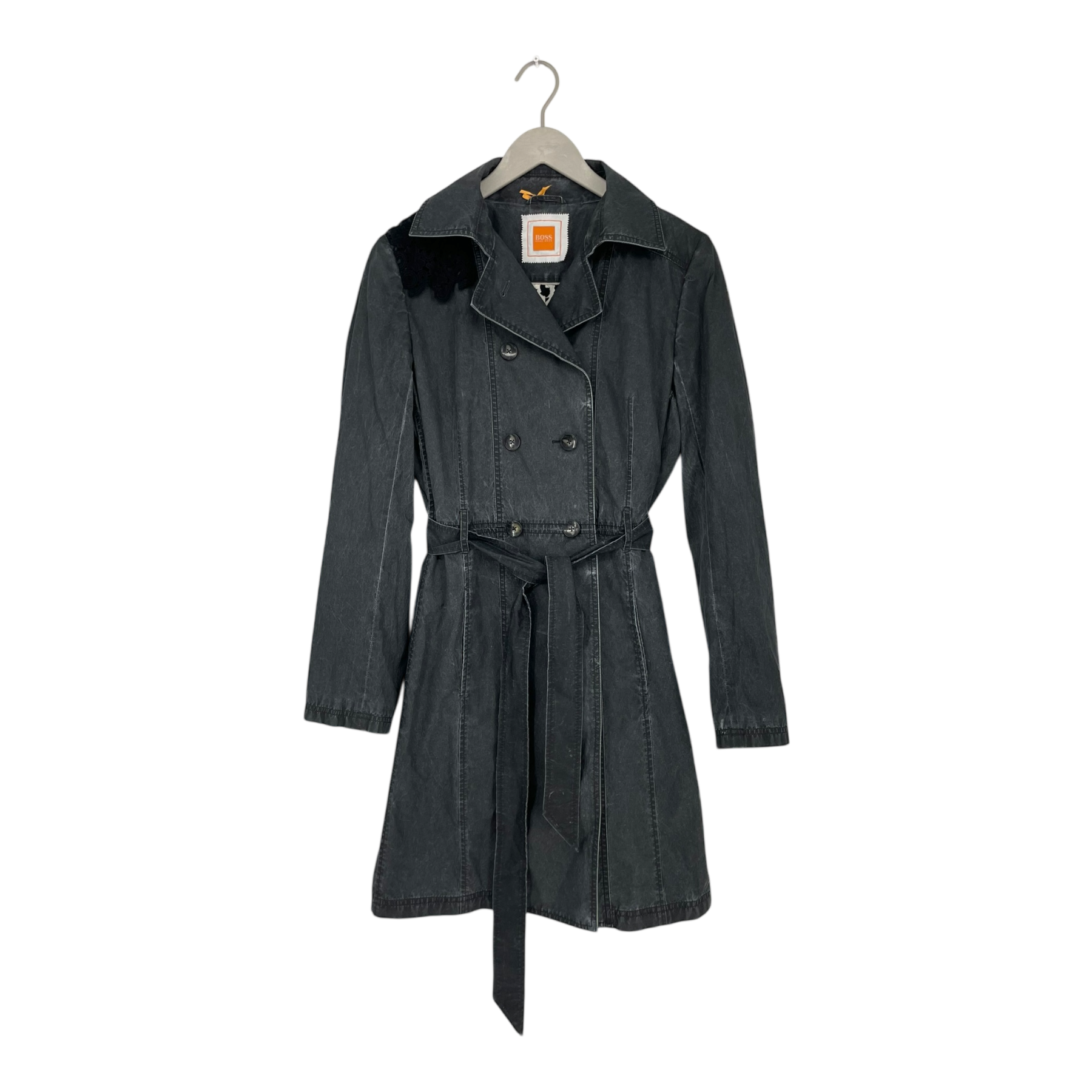 Hugo Boss women’s trench coat. The coat is grey in color and stone-washed, giving it a distressed effect. It features a double-breasted button closure and a fabric belt for fastening. There are two pockets at the front and an additional pocket on the inside. The jacket has lace decoration on the upper back and on the right side next to the collar.