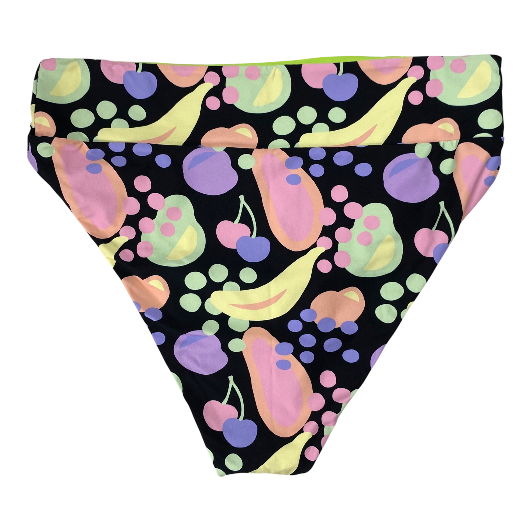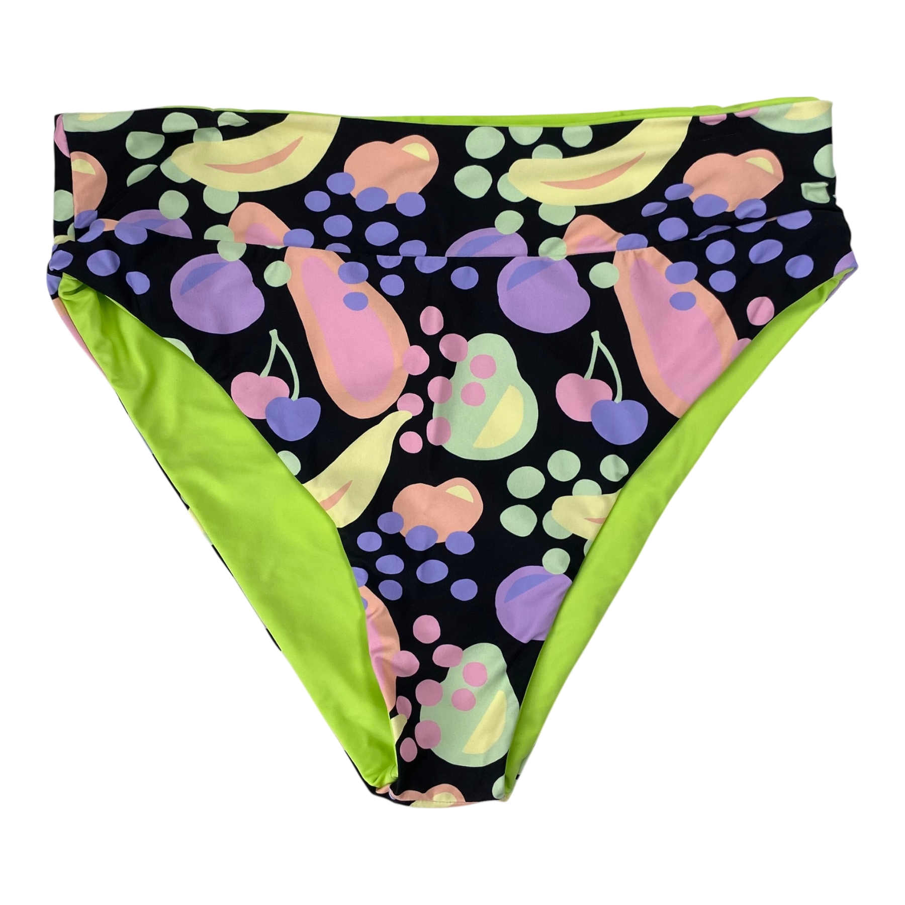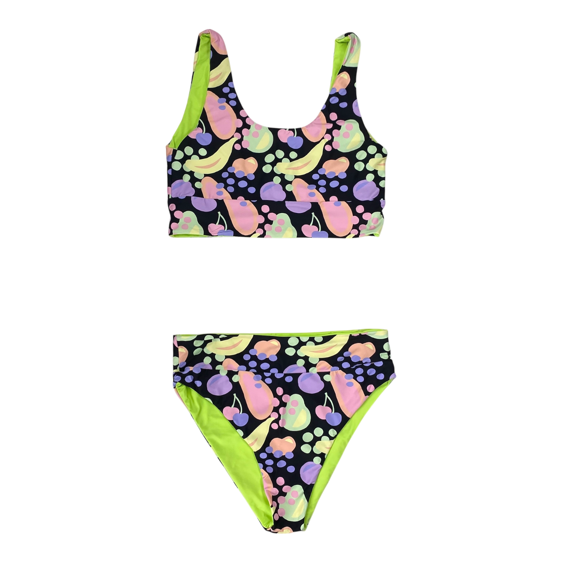 Halla Halla women's bikini is tuttifrutti print. Mimi bottom gives you that extra coverage but also brings out your gorgeous curves. The Ziggy Top is designed to keep you feeling comfortable while looking absolutely stunning. The ziggy top fits like a glove on every body, hugging your curves in all the right ways. No slips, no fuss - just pure perfection. The bikini is reversible and can also be worn with the green side out. The bikini has seamless stitching, UPF 50+ coverage, it is designed in Finland, made ethically in Bali, and sade sustainably with regenerated nylon from fishing nets and other discarded nylons