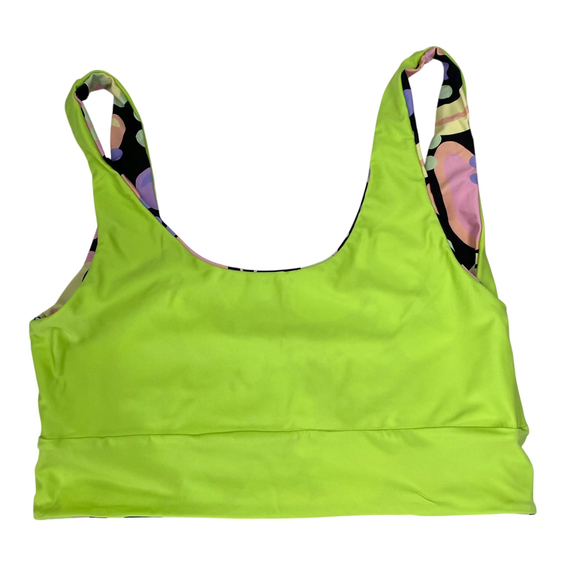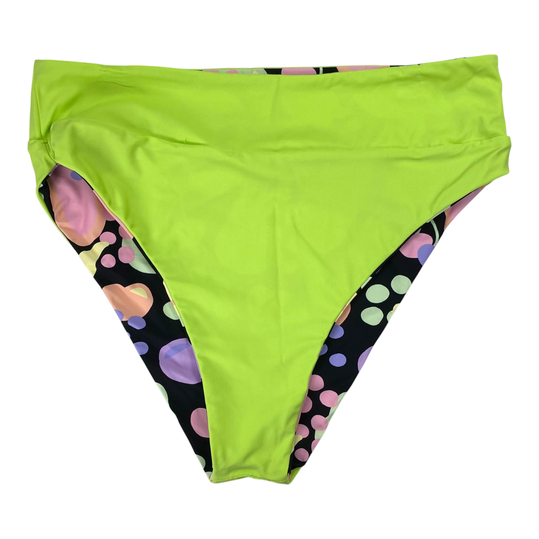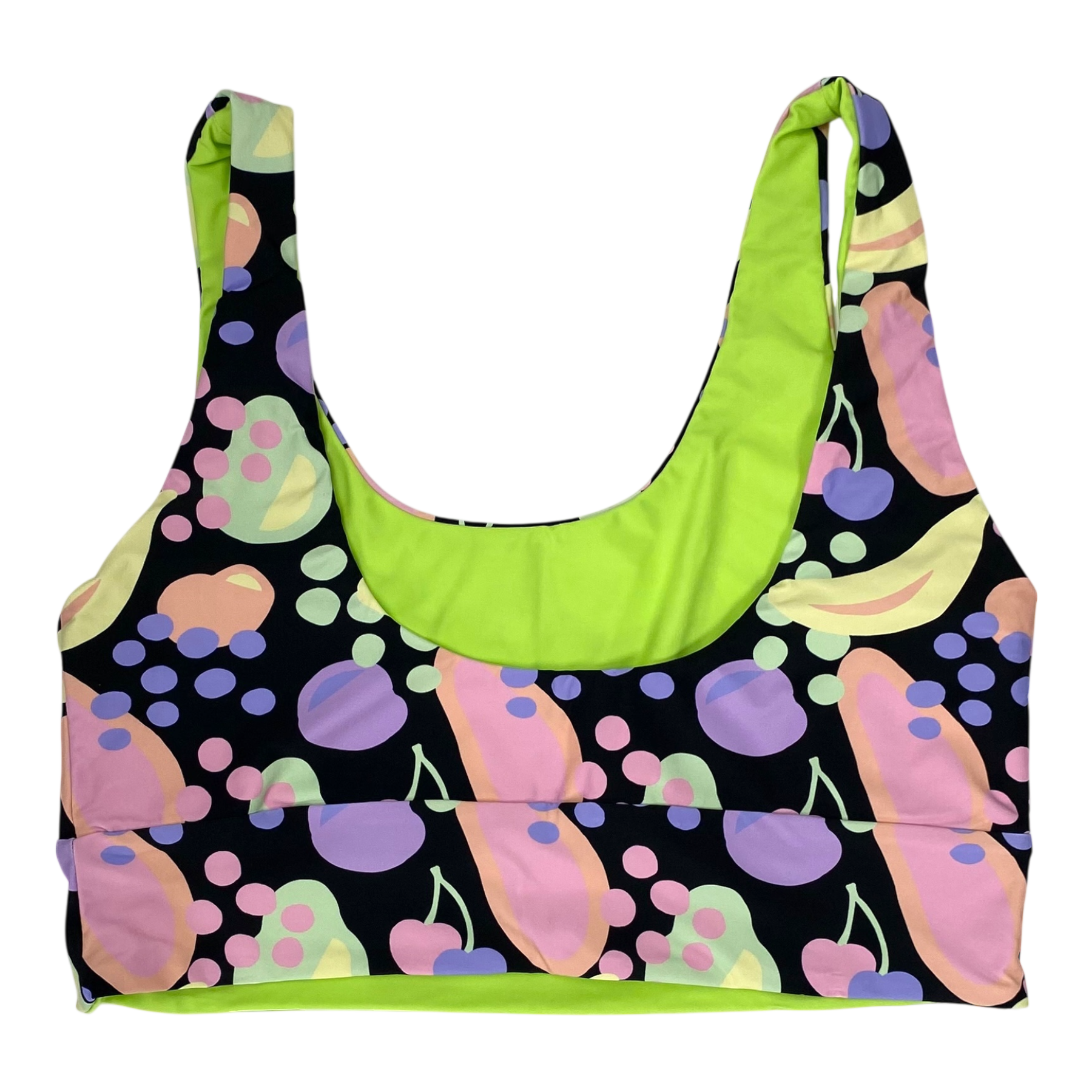 Halla Halla women's bikini is tuttifrutti print. Mimi bottom gives you that extra coverage but also brings out your gorgeous curves. The Ziggy Top is designed to keep you feeling comfortable while looking absolutely stunning. The ziggy top fits like a glove on every body, hugging your curves in all the right ways. No slips, no fuss - just pure perfection. The bikini is reversible and can also be worn with the green side out. The bikini has seamless stitching, UPF 50+ coverage, it is designed in Finland, made ethically in Bali, and sade sustainably with regenerated nylon from fishing nets and other discarded nylons