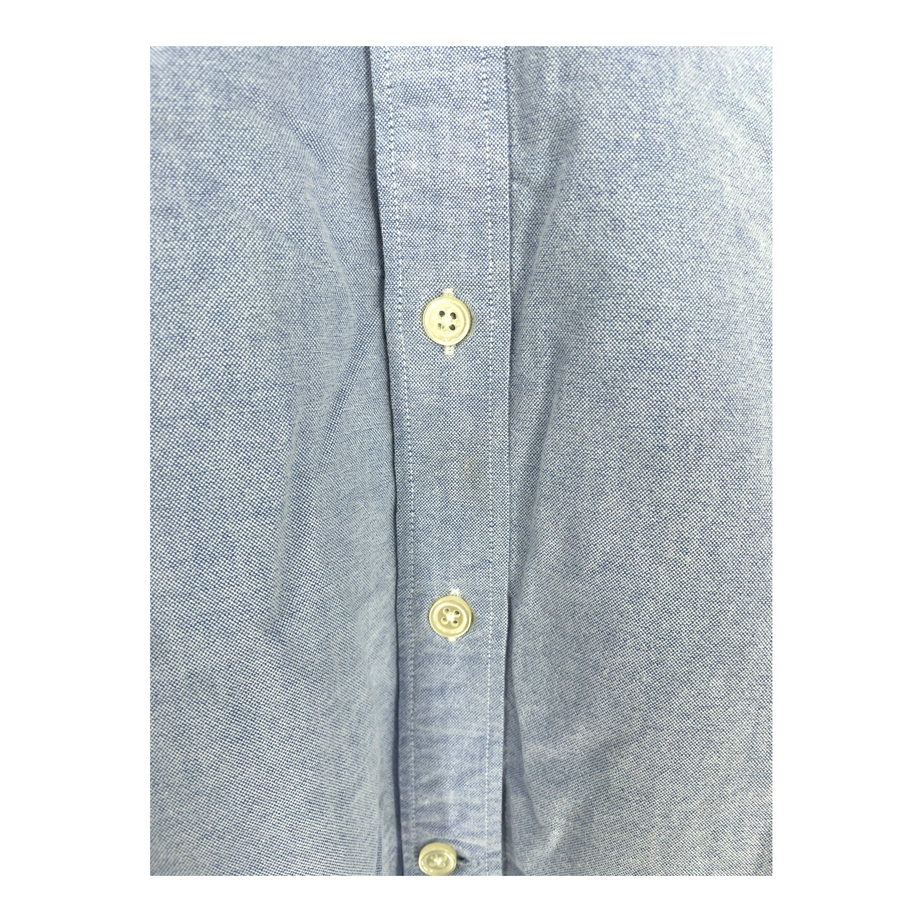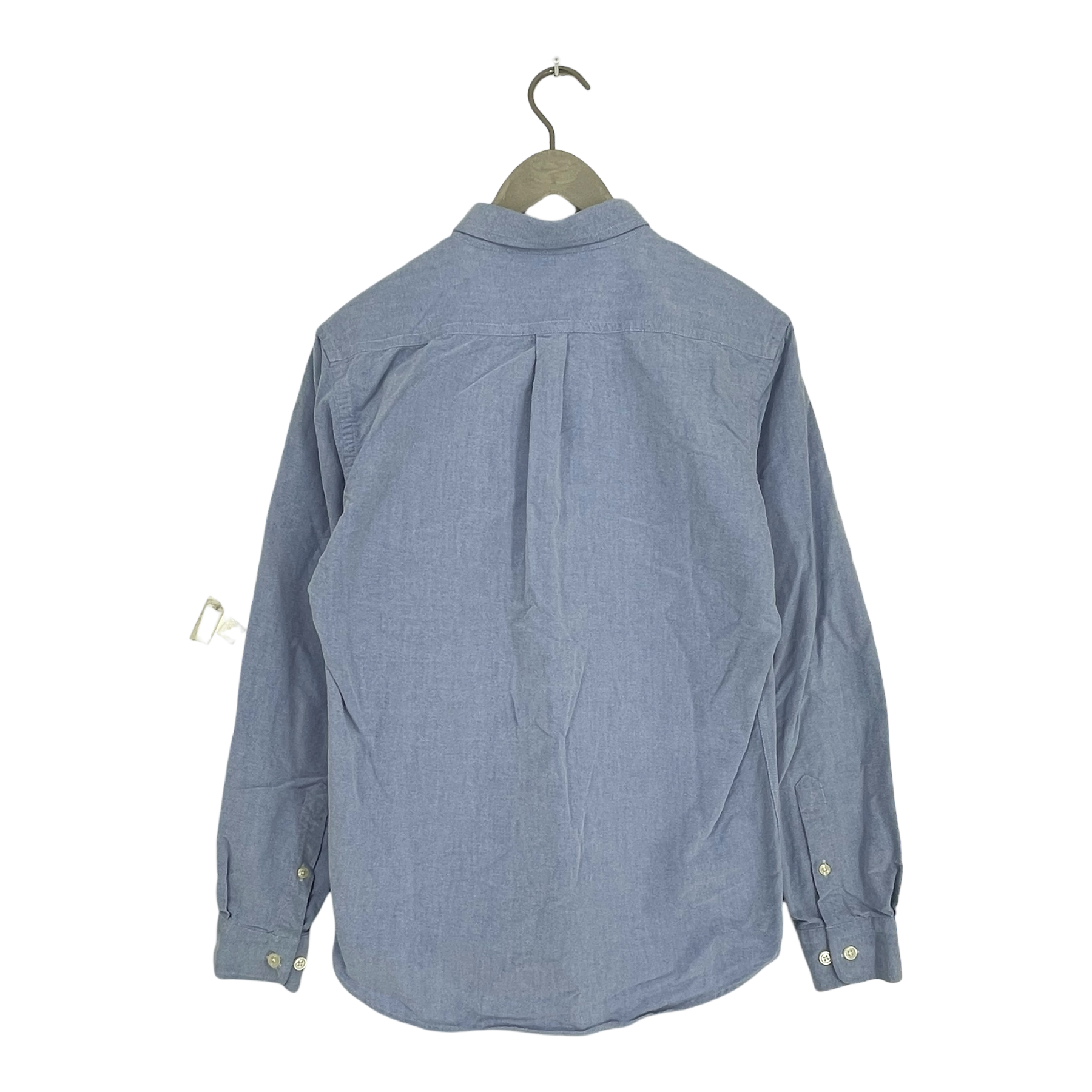 Knowledge Cotton men's long sleeved shirt with a collar, buttons in the front and on the sleeves and a breast pocket. The shirt is slim fit, so sizing up is recommended.