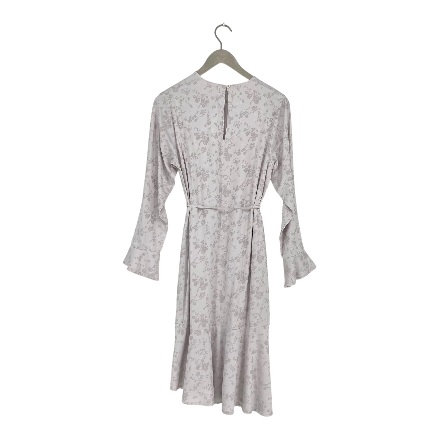 Makia woven dress with long sleeves, adjustable drawstring on the waist, keyhole closure on the back and uneven hemline. There is fun ruffle details on the cuffs and hemline.