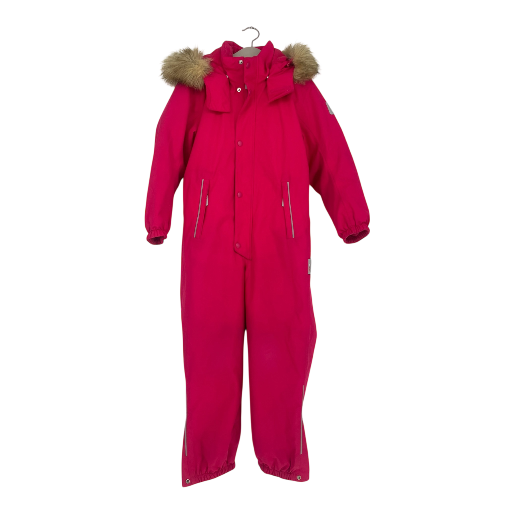 Reima Stavanger winter overall with zip closure, detachable faux fur hood, two zip pockets, reflective details, durable foot loops, and adjustable elastic on the waist. The fabric is strong, waterproof yet breathable material. The material is originally waterproof up to 10,000mm water column, and all the seams are sealed.