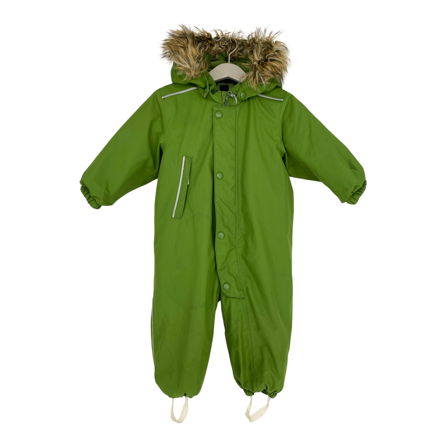 Reima Gotland winter overall with detachable faux fur hood and one zip pocket. This winter style has an insulated seat that keeps the bottom warm and dry during fun winter adventures. The smooth polyester lining makes dressing up easy, and the lining is also ideal with warm mid-layers.
