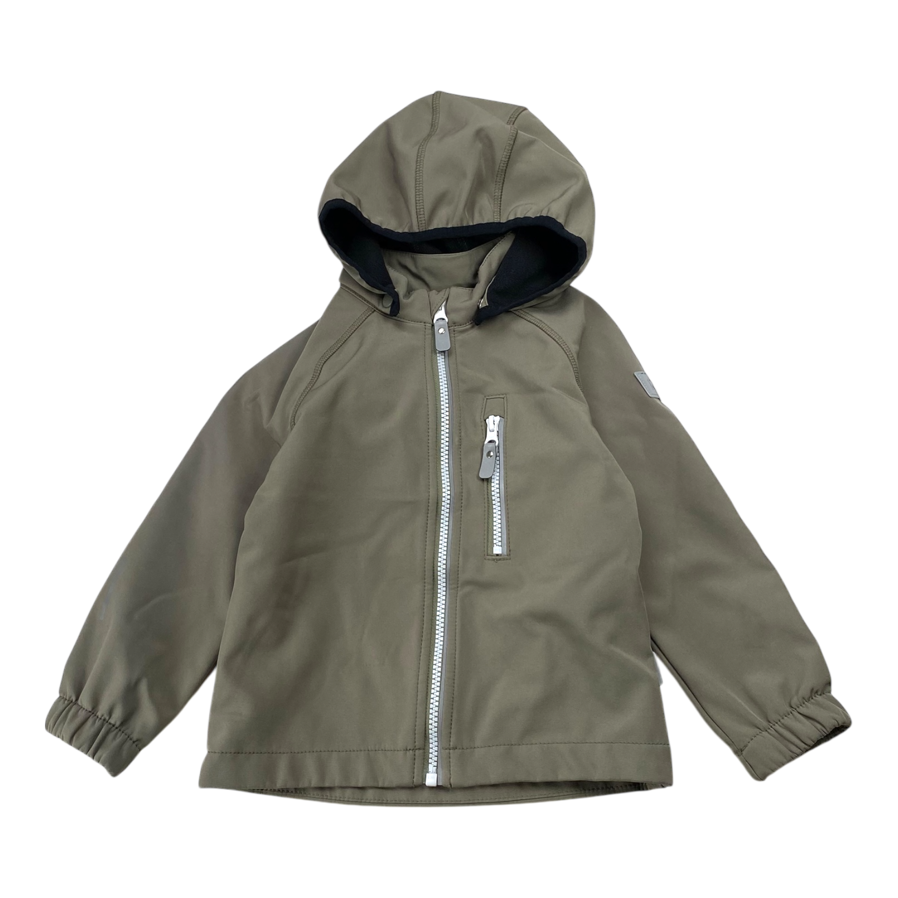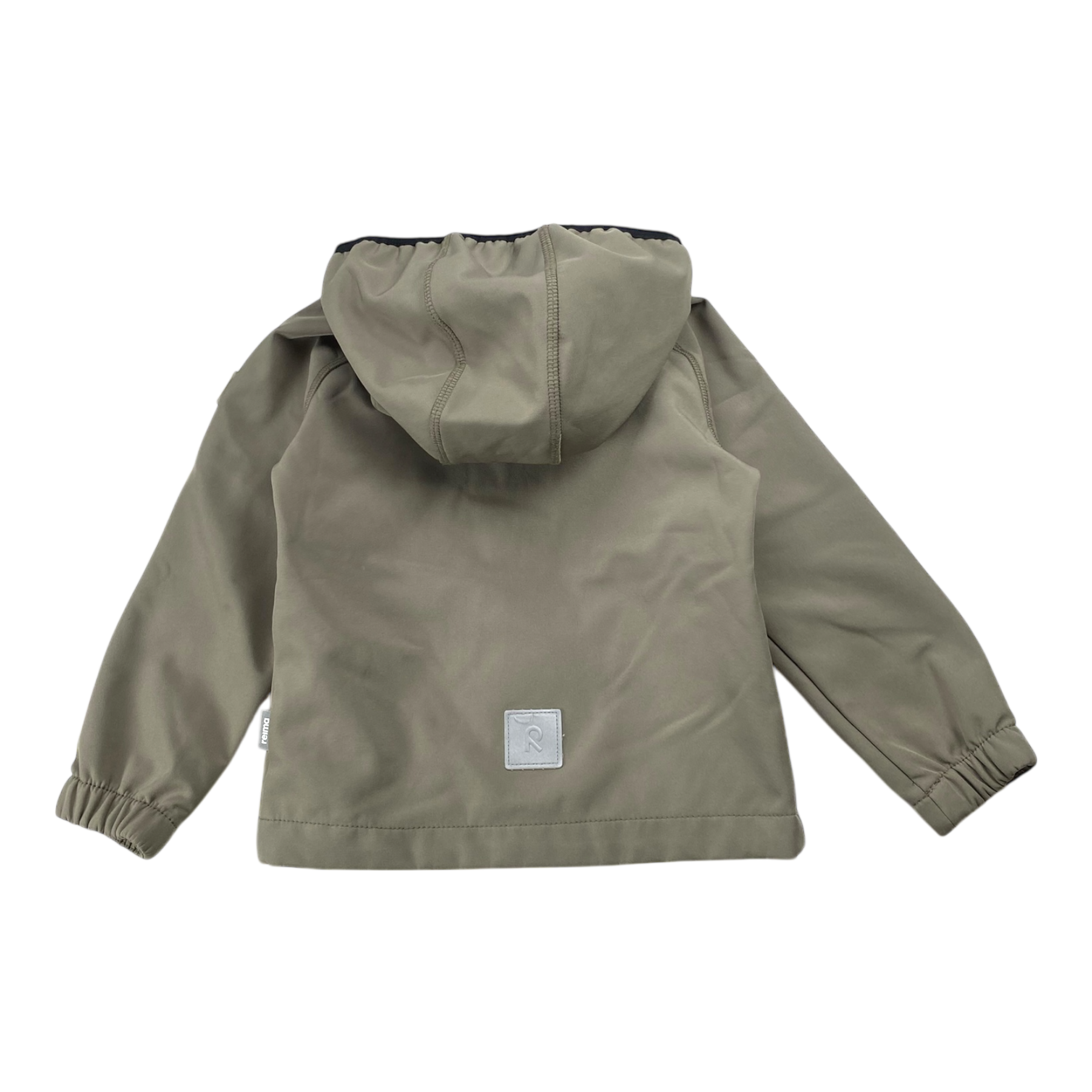 Reima Vantti softshell midseason jacket with detachable hood, zip pocket, and zip closure. The material is originally water- and windproof. The soft fleece on the reverse not only feels nice against the skin but warms too.