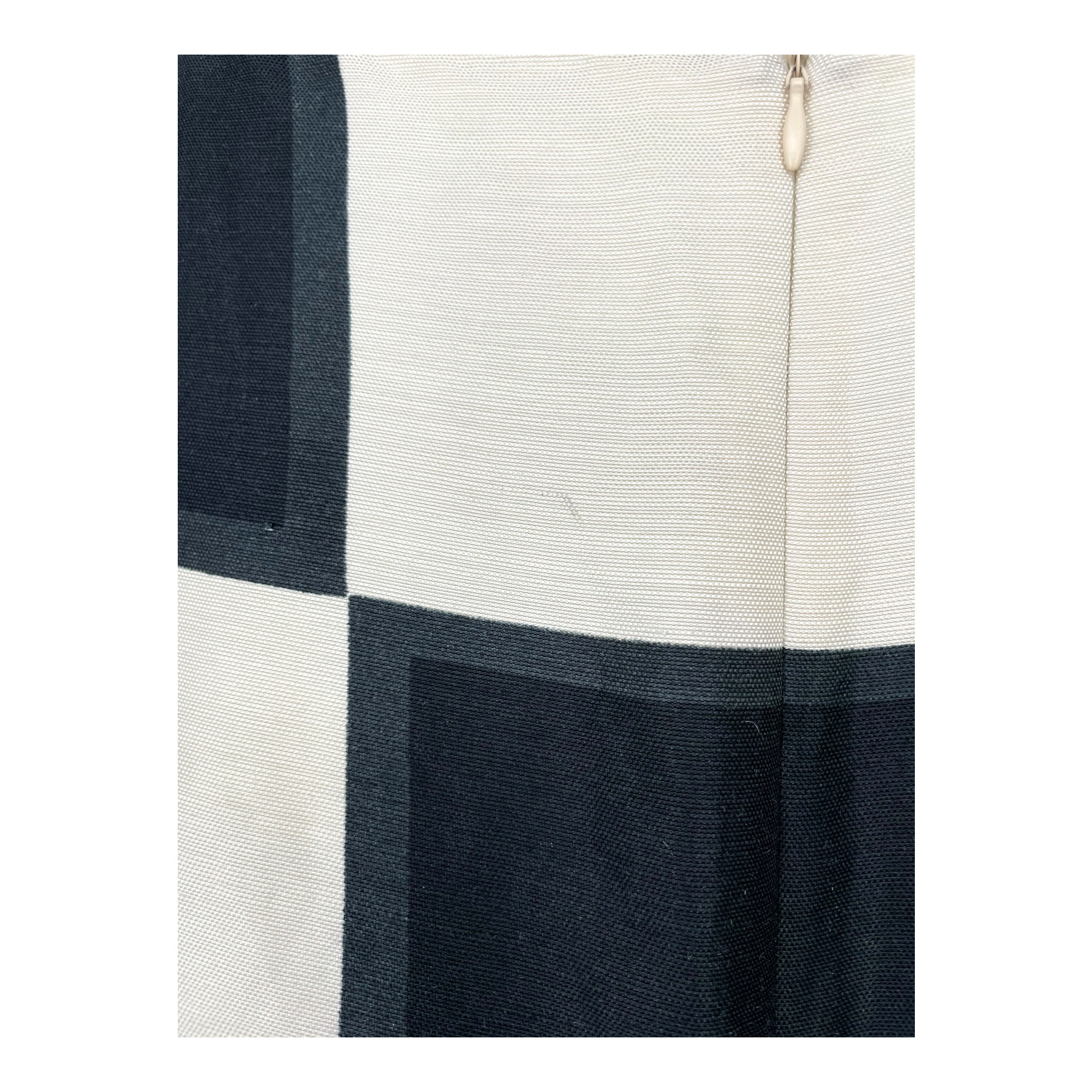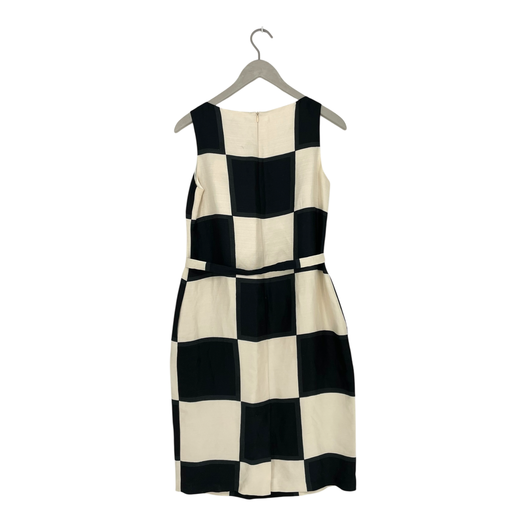 Marimekko sleeveless dress in black and cream color with a removable belt and a zipper back.
