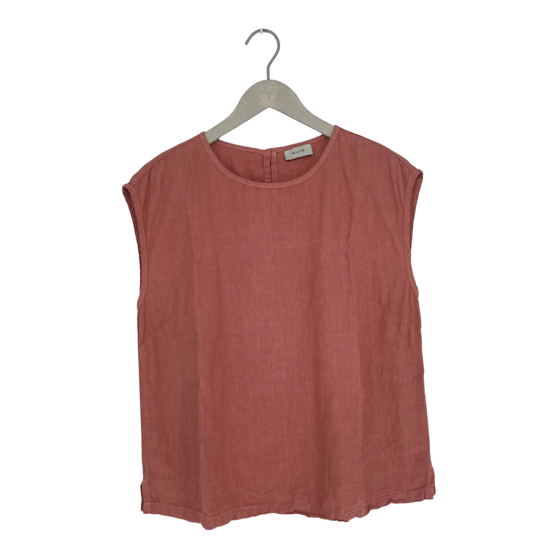 Balmuir women’s linen top. The top has a button closure at the back and small side slits at the hem. It has a straight cut and features a dart at the chest for shaping.
