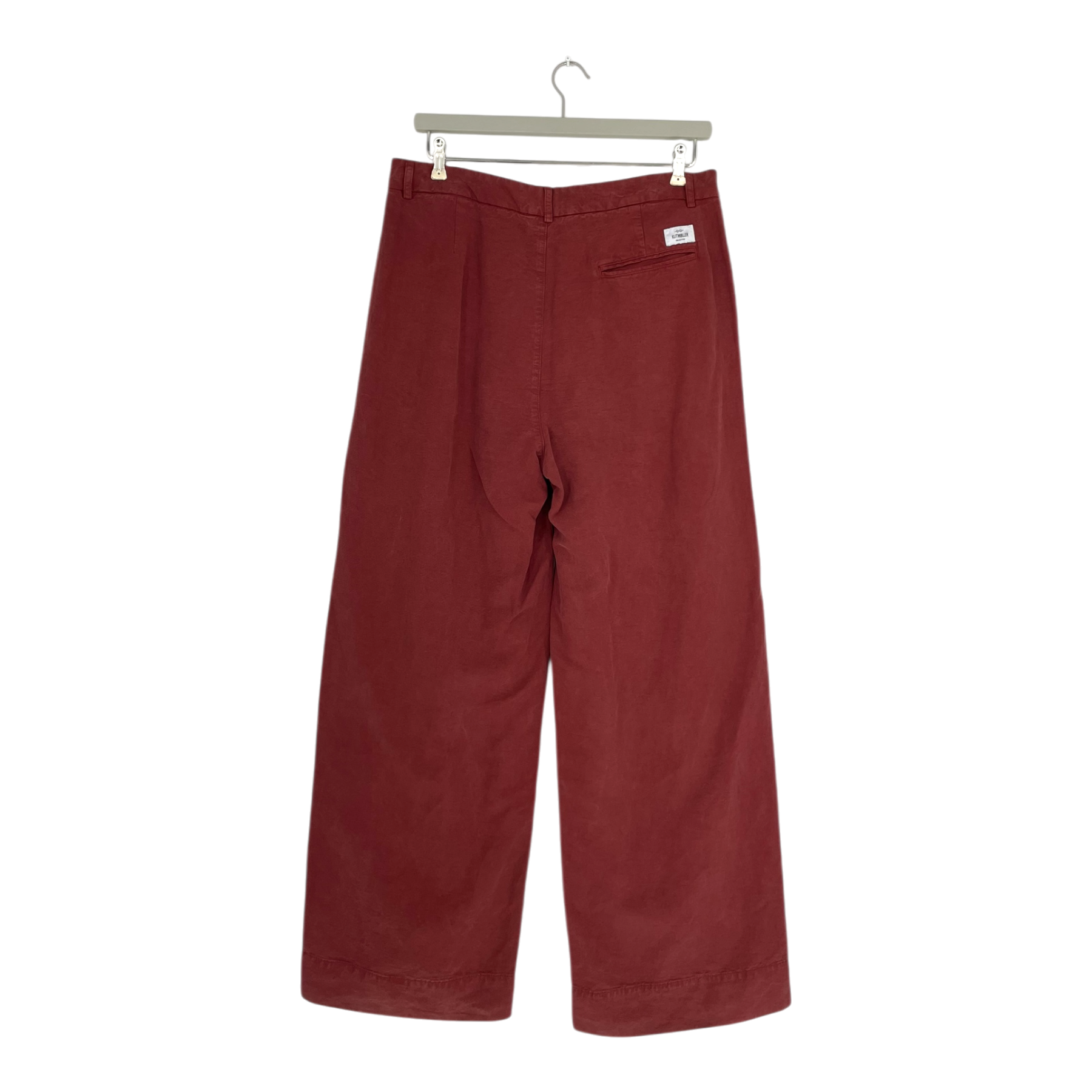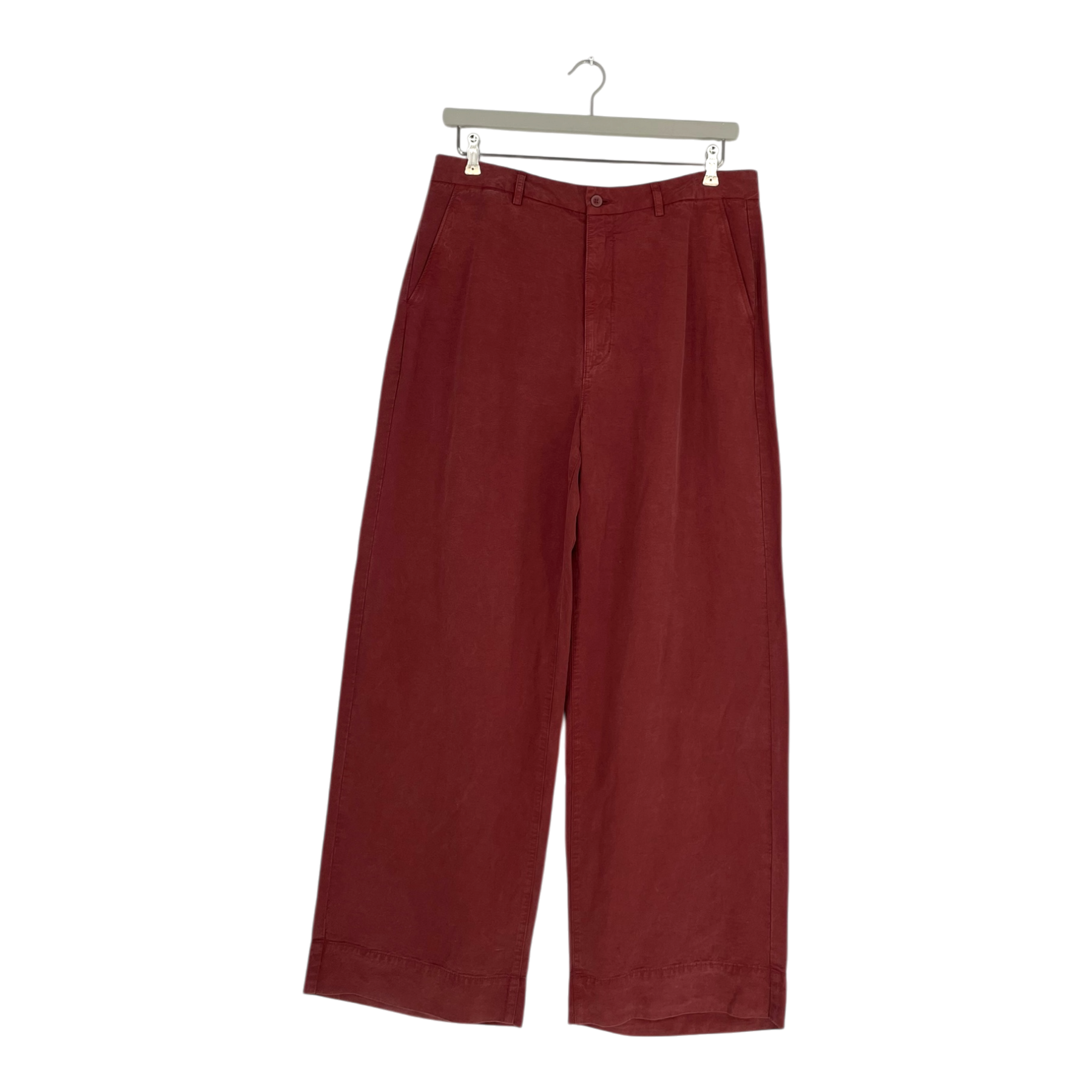 Klitmøller Collective lydia lyocell pant in a rich burgundy color. These wide-leg trousers feature a relaxed fit with a high waist and button closure. The fabric has a soft, flowing drape that makes them perfect for both casual and more dressed-up occasions. Front slant pockets and clean, minimal styling create a contemporary silhouette.