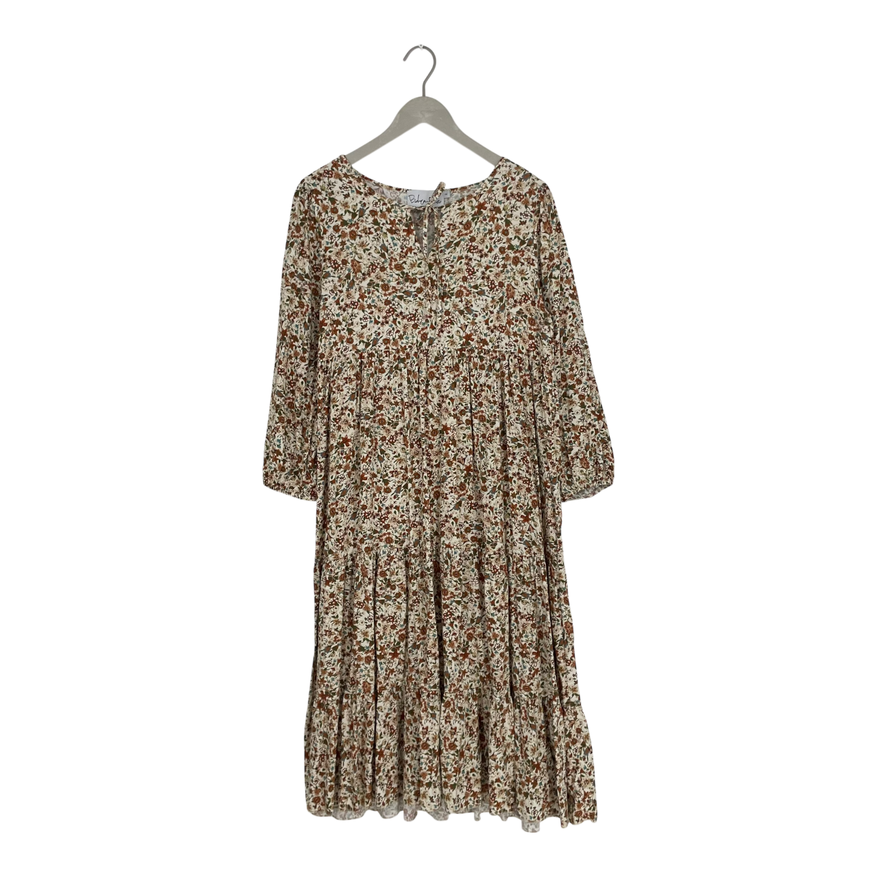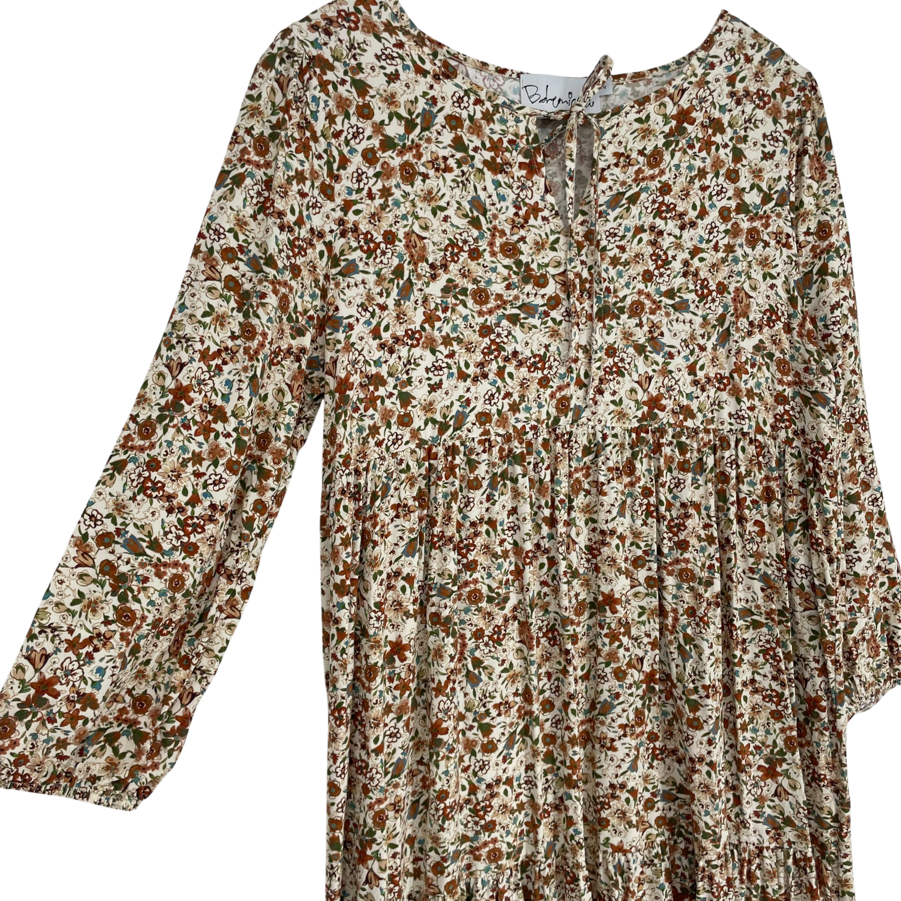 Bypias Bohemiana long sleeve flowy dress in flower print. The sleeves have elasticated cuffs and there is a bow detail in the front. The style is oversized and it is midi/maxi length.
