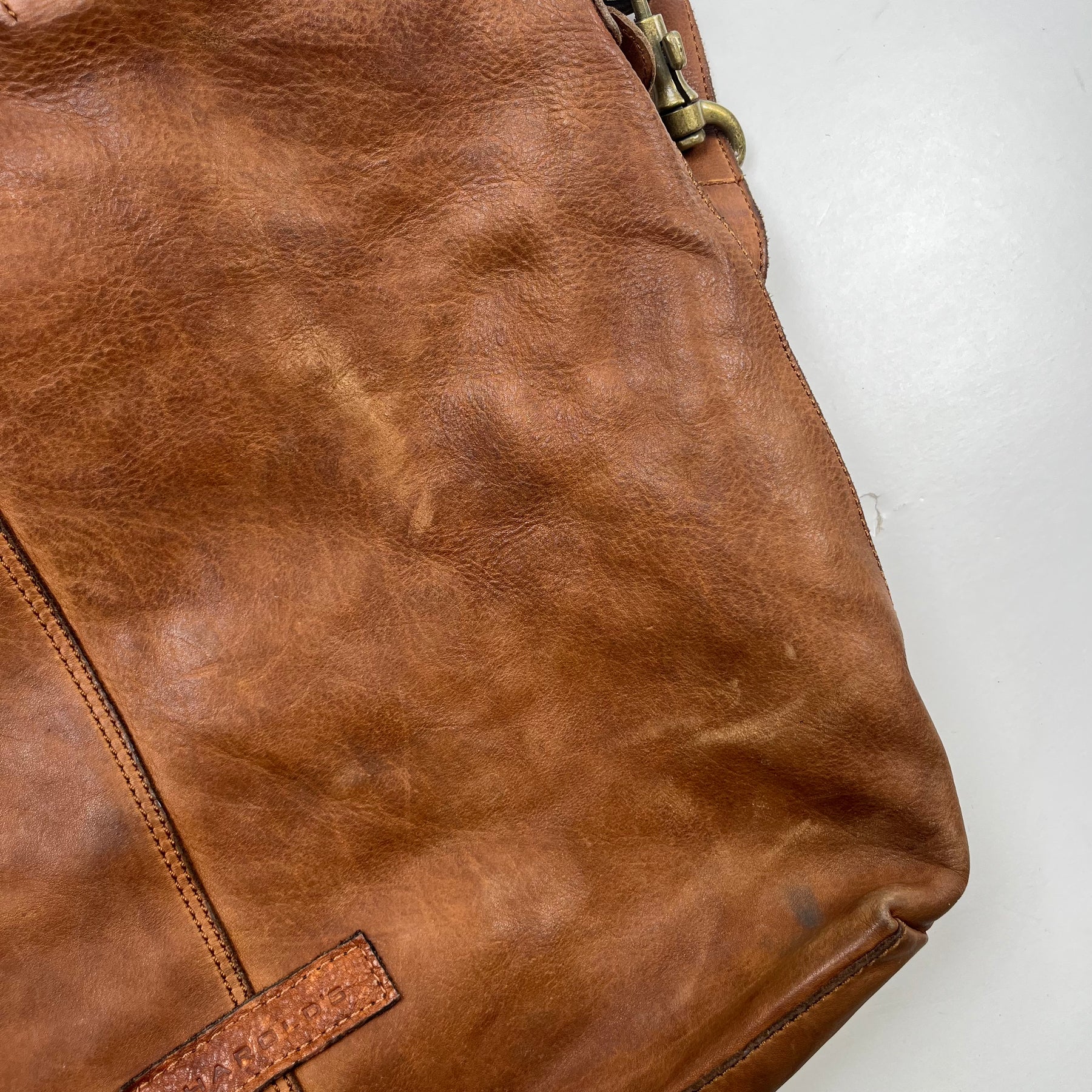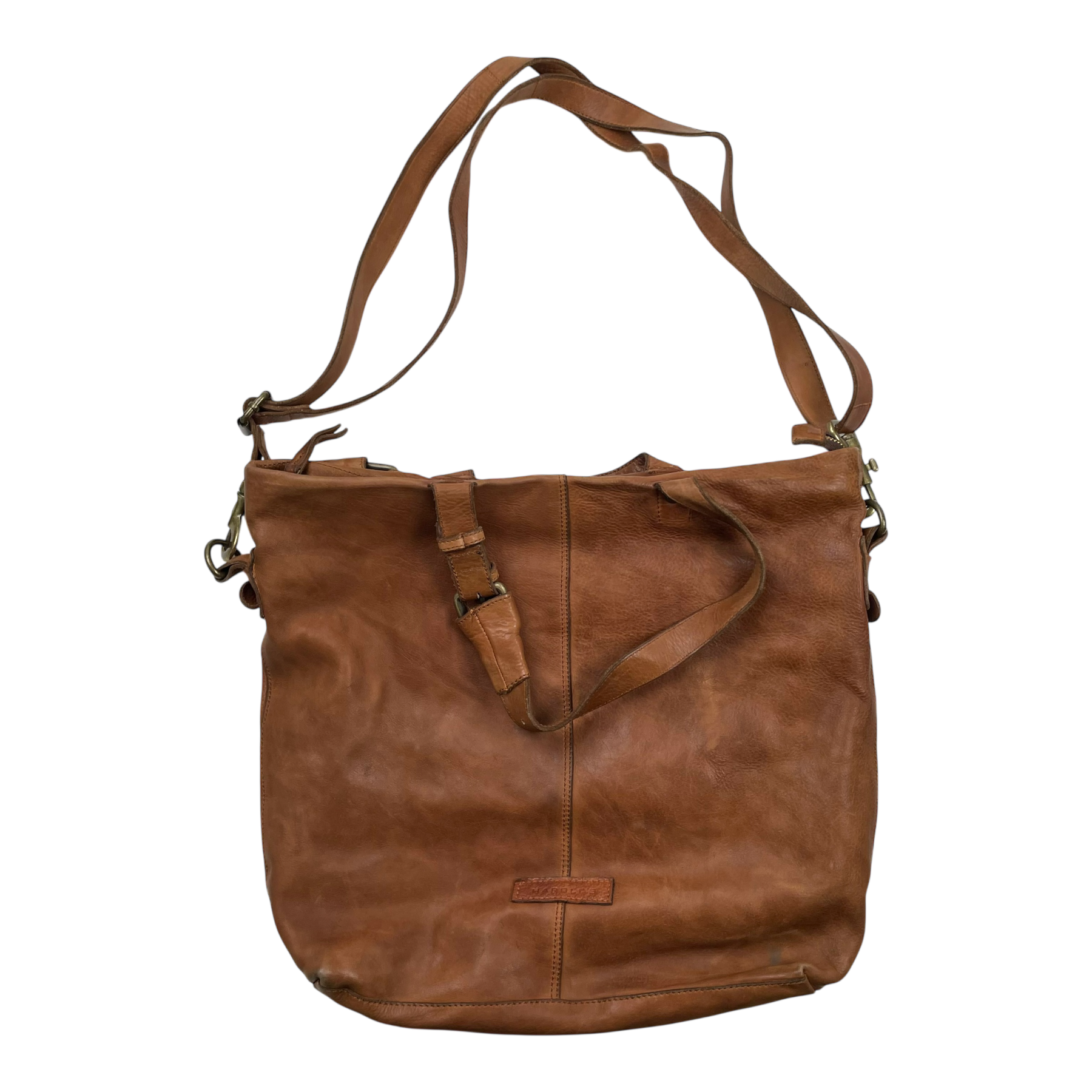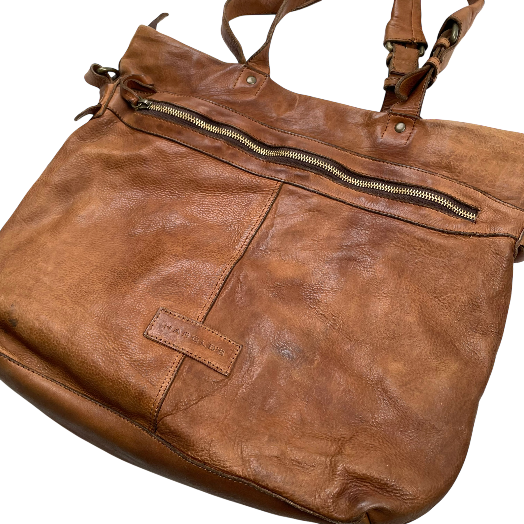 Harold's Bags Submarine Shopper is made of washed cowhide with a slightly glossy surface and a rich feel. The bag is pleasantly scrunchy and surprisingly lightweight. It features a large and spacious zippered compartment. It can be worn just over the shoulder using the short strap or cross-body as a messenger bag using the detachable shoulder strap.