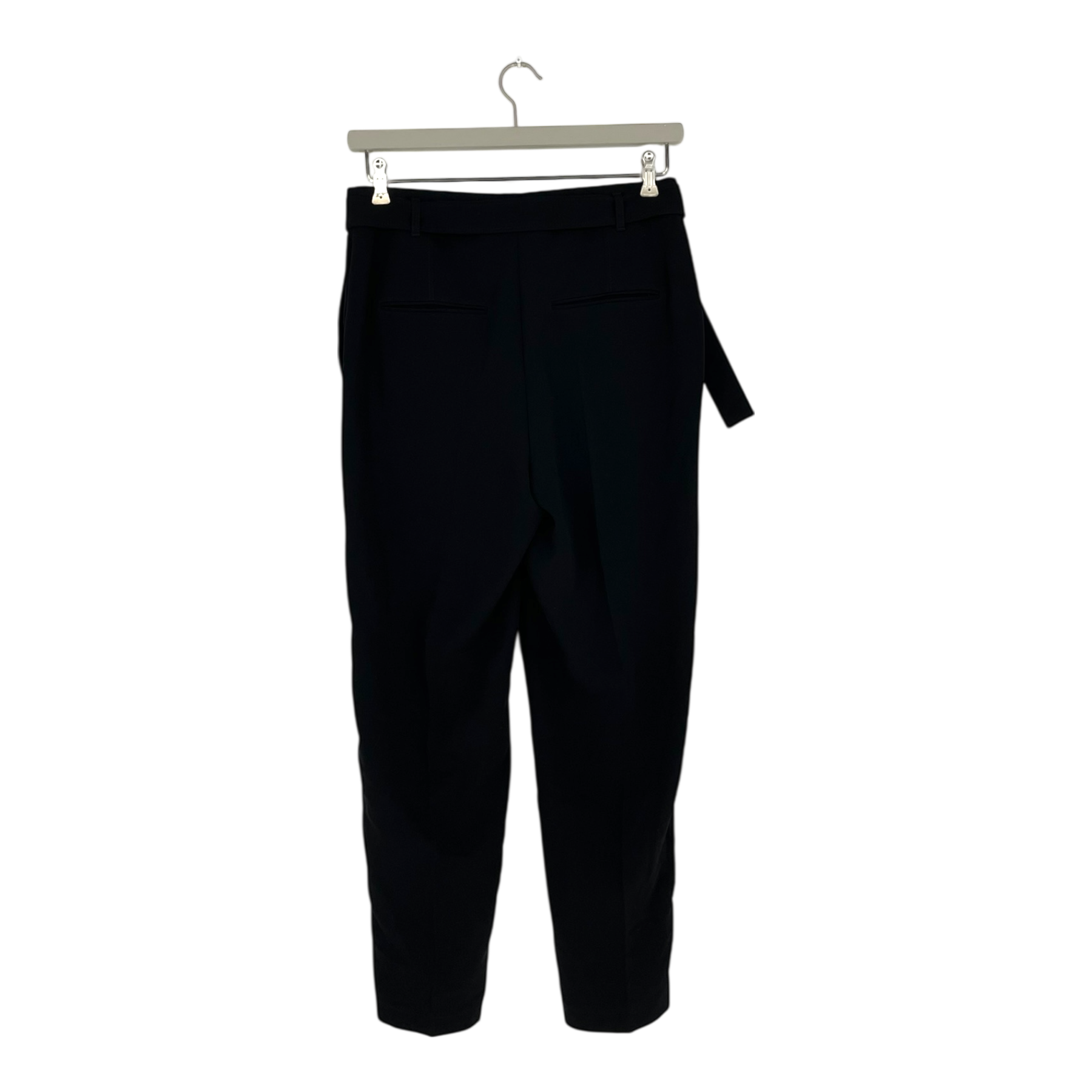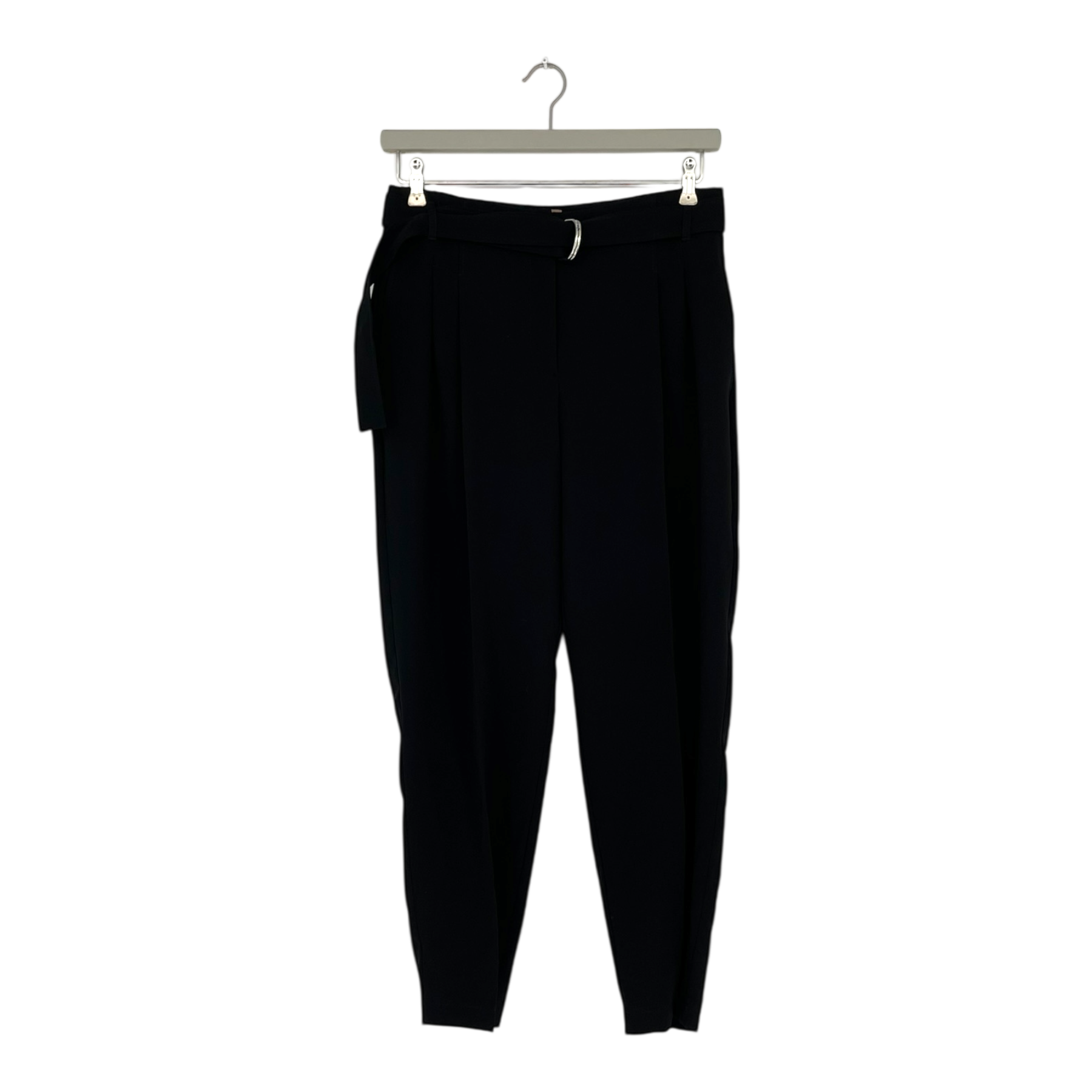 Hugo Boss women’s trousers.The trousers feature a front zipper closure and a fabric belt made from the same material with a metal buckle. There are pockets at the front. The fabric has a very fluid drape.