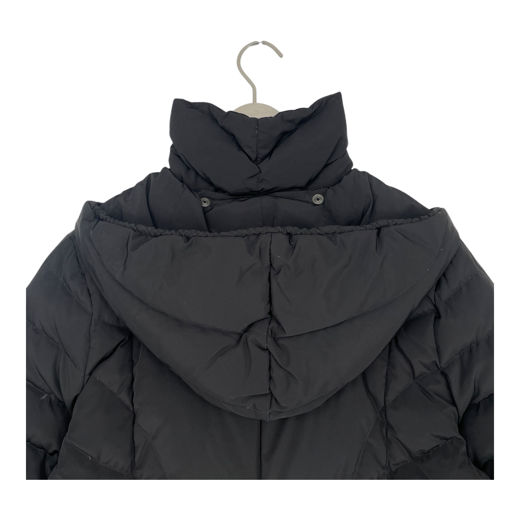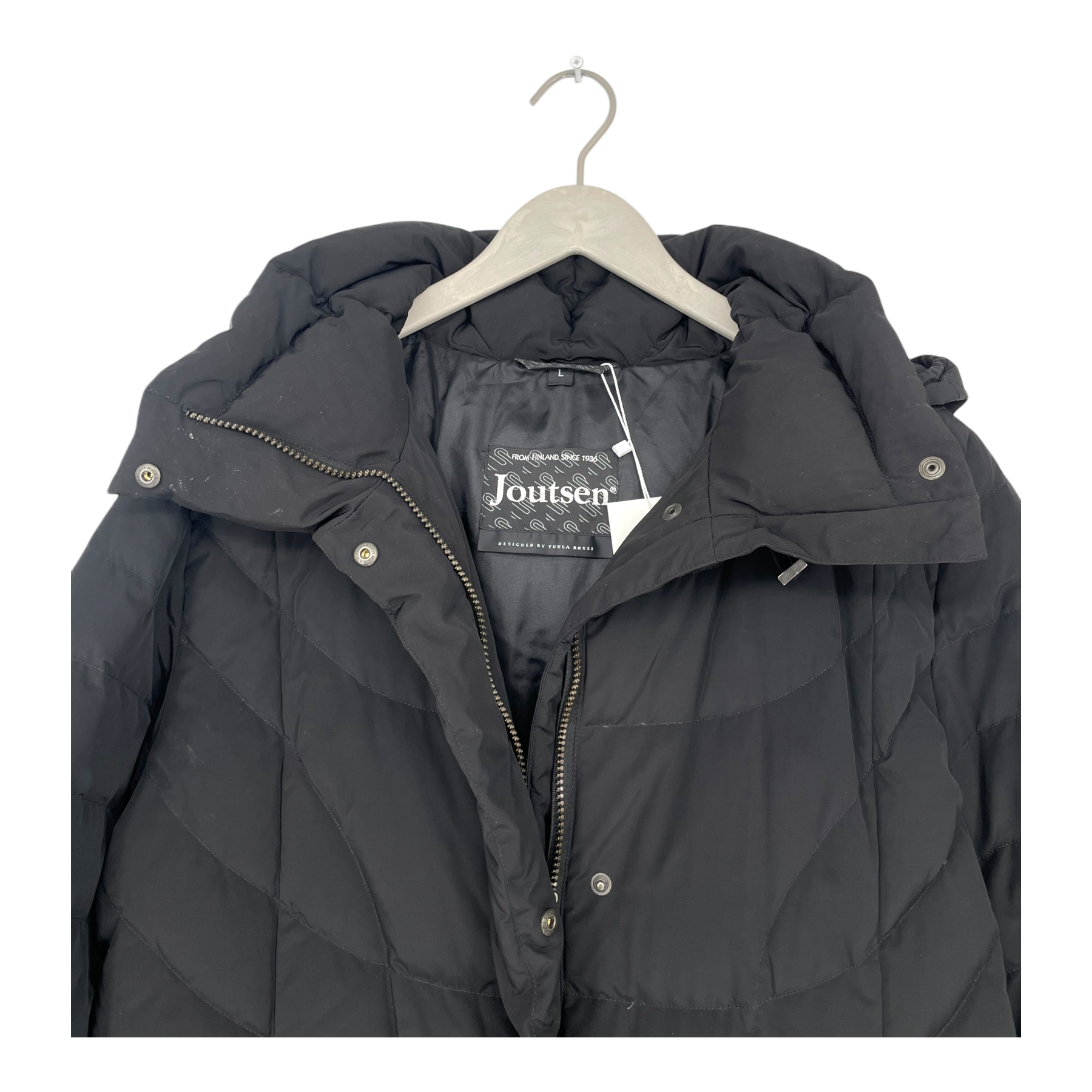 Joutsen Norah jacket is a down jacket perfect for the colder weathers. There a large horizontal stitching and two front pockets with zippers. The snap buttons and the double-slider fastening zipper adds comfortability and daily functionality in the front. There is a large warm hood that can be worn up or down according to weather and an adjustable elastic. This Jacket has a detachable hood. The hood is attached with metal snap buttons.The sleeves can be rolled up for a better fit.